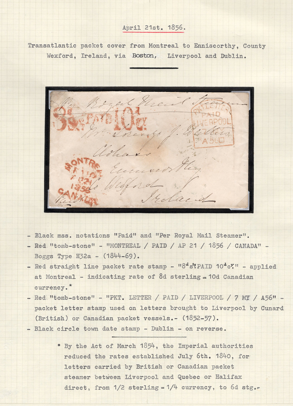Montréal to Ireland, mailed on APR.21.1856 (tombstone-like despatch in red) to Clohass, Ireland, with MAY.8.1856 Dublin transit and Liverpool MAY.7 “PKT.LETTER / PAID” tombstone transit. Rated “8Stg PAID 10d Cy” handstamp in red and endorsed “Per