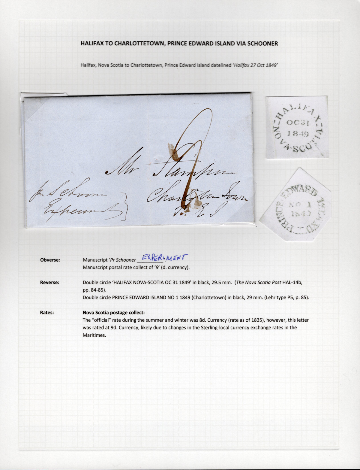 Folded Letter to Charlottetown PEI, datelined Halifax on OCT.27.1849, mailed from there on OCT.31.1849 (very fine despatch on back) addressed to Charlottetown, and received there on NOV.1.1849 (very fine receiver on back), endorsed “Pr. Schooner