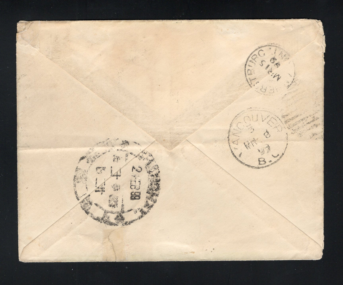 Shanghai FEB.1.1899 c.d.s. tie a pair of 5c grey Hong Kong issue paying the U.P.U. rate to Amherstburg, Canada (MAR.15 receiver) via Vancouver (MAR.8 duplex transit). Owner notes this was carried on the C.P.R. S.S. Empress of India. Horizontal