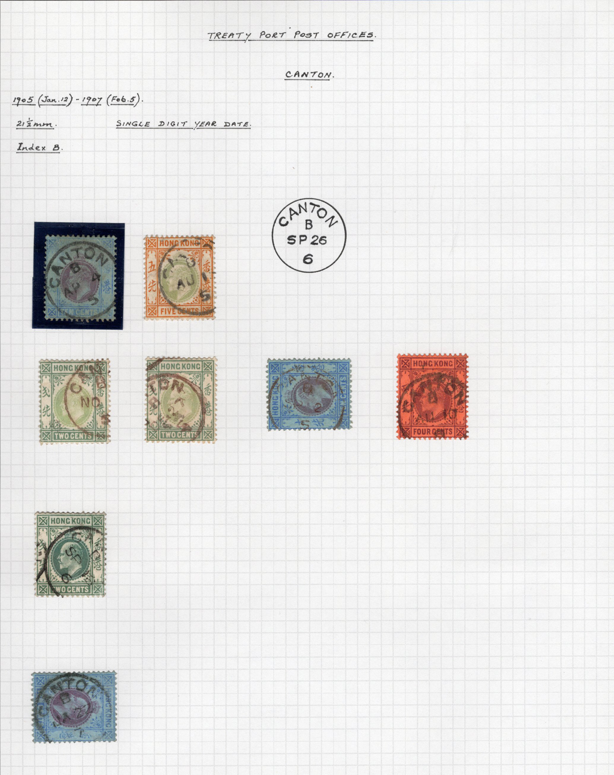 C.D.S. (Curved, with Index Letter B) Cancels on Eight King Edward VII Hong Kong Issues, a fine to very fine strike on a variety of issues, overall fine, most are fully dated.