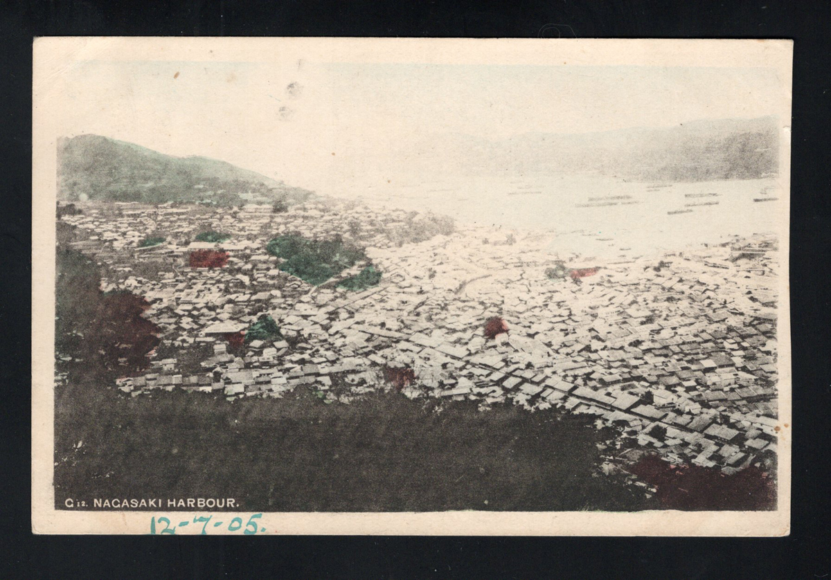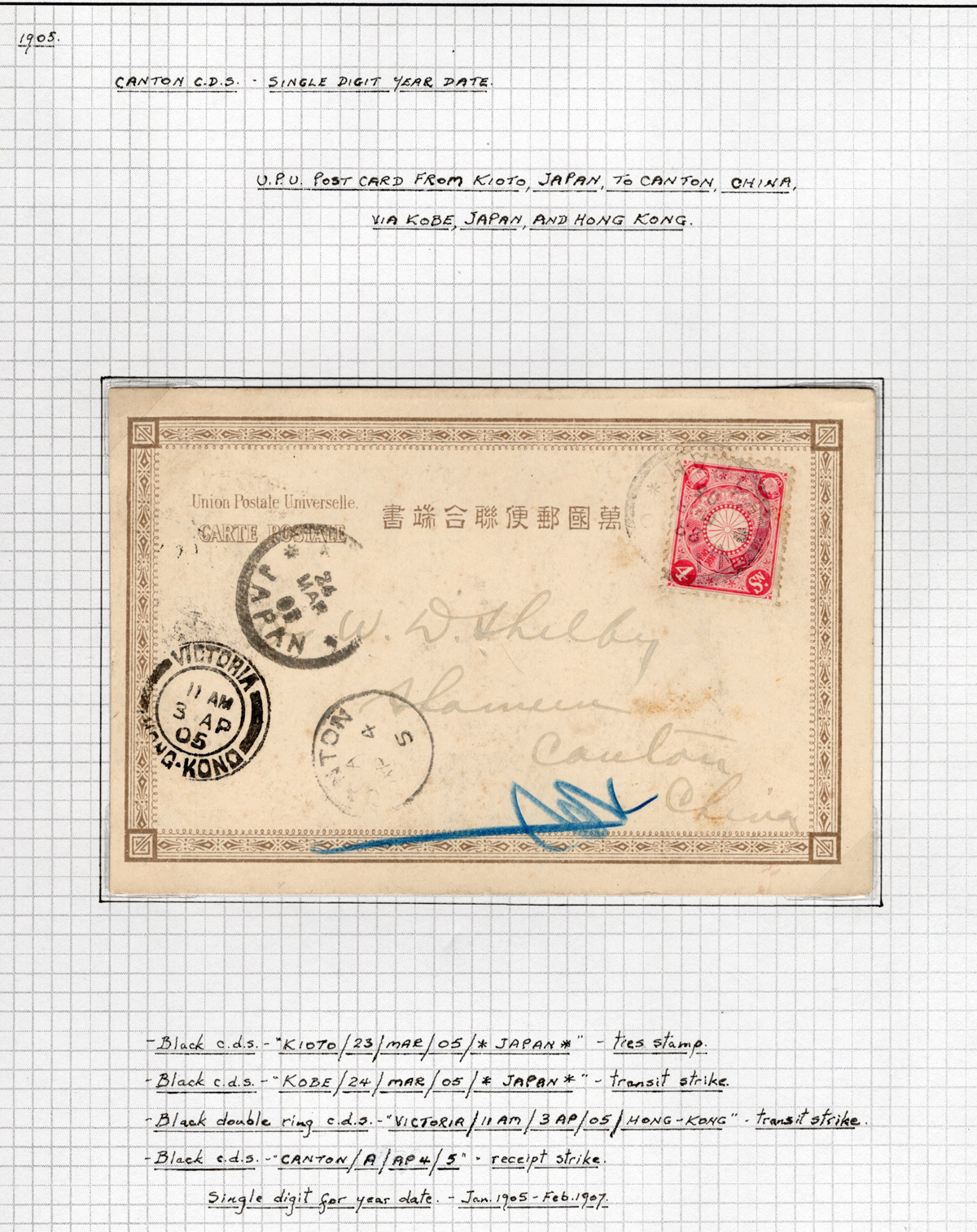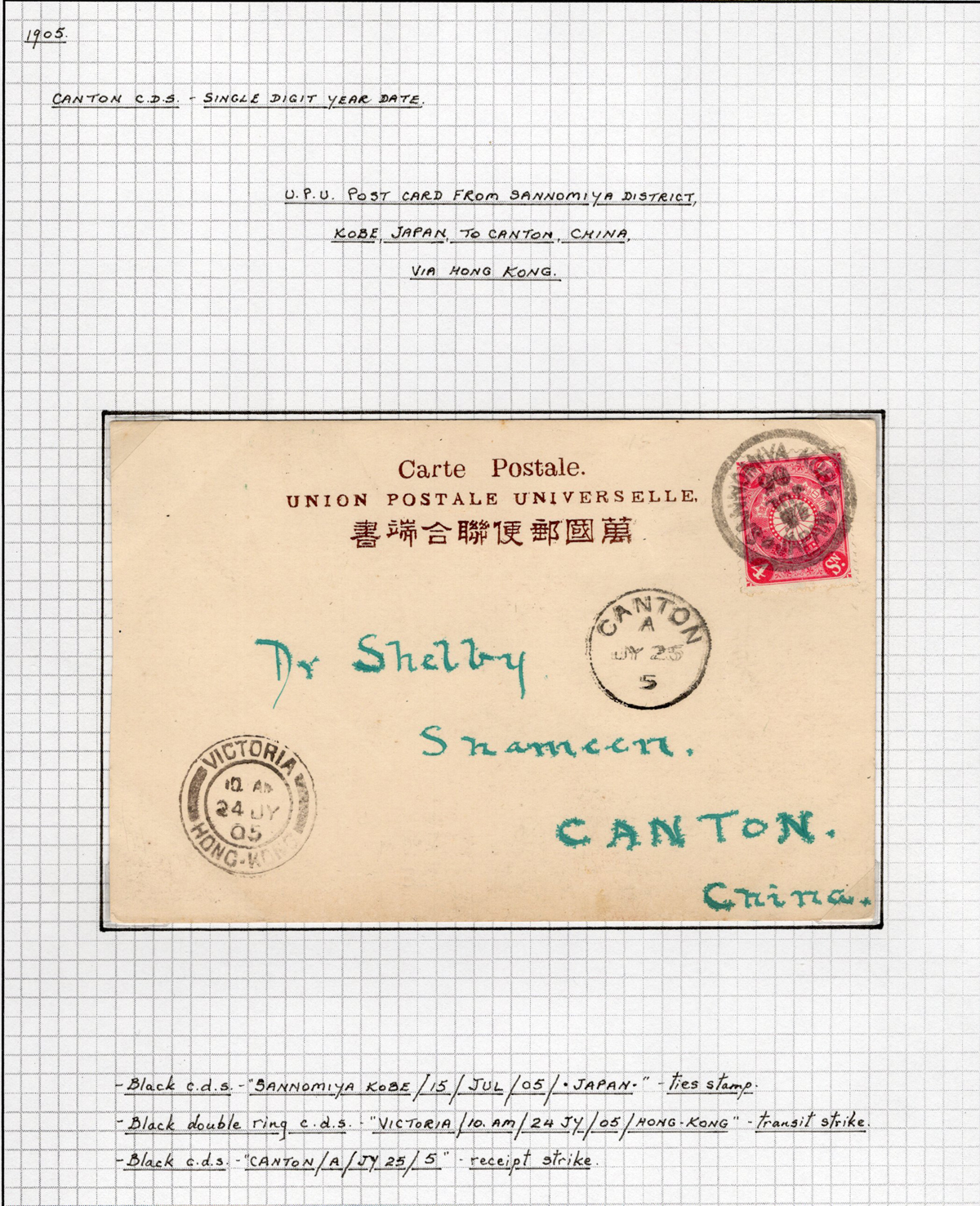 from Kobe Japan to Canton China, a U.P.U. picture postcard mailed from Shannomiya District / Kobe on JUL.15.1905 (c.d.s. ties 4s stamp) to Canton (JUL.25 receiver) through Victoria / Hong Kong (JUL.24 transit). The picture side shows the Nagasaki
