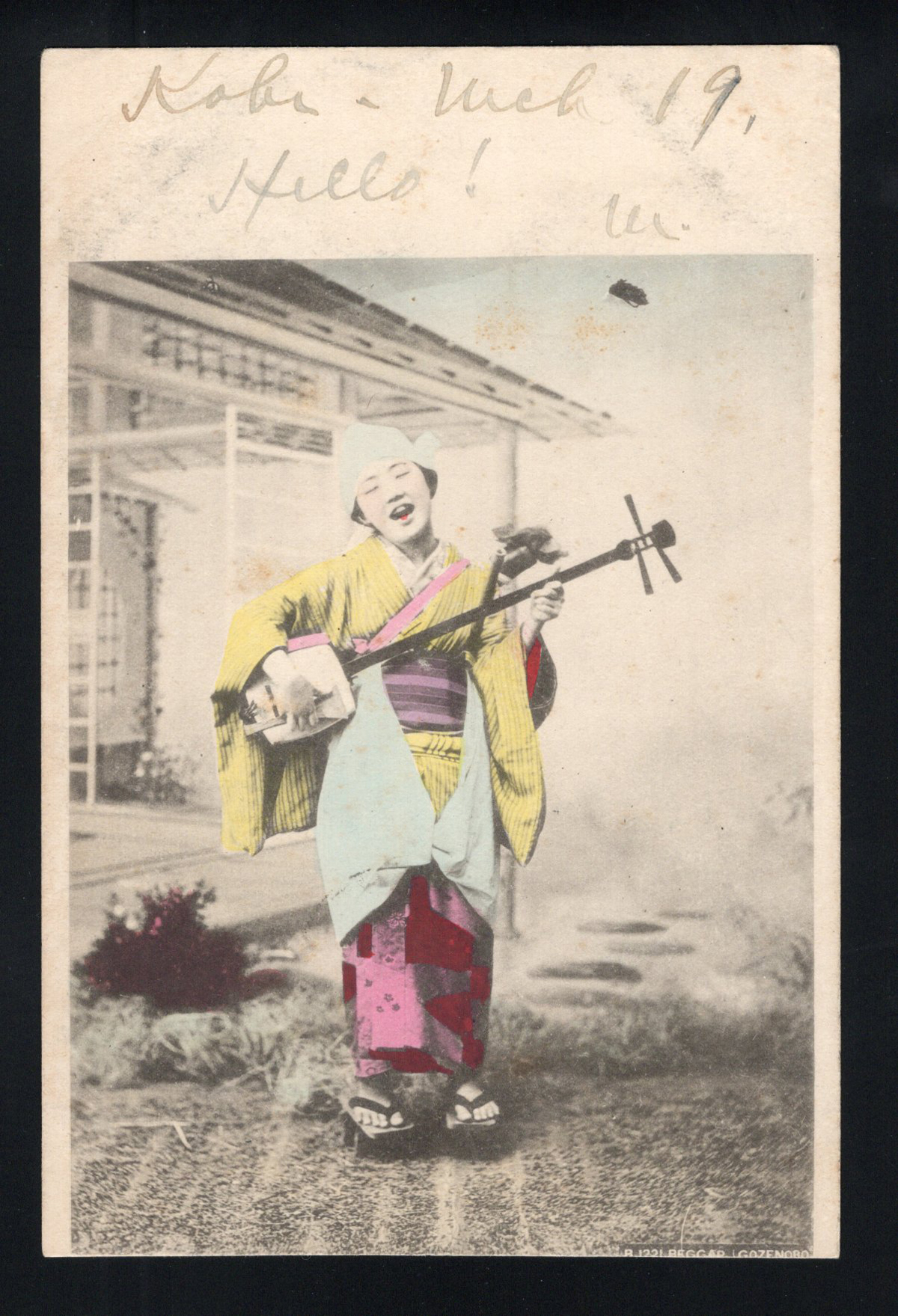 playing her shamisen (Japanese string instrument). Very fine. (Scan 1)
