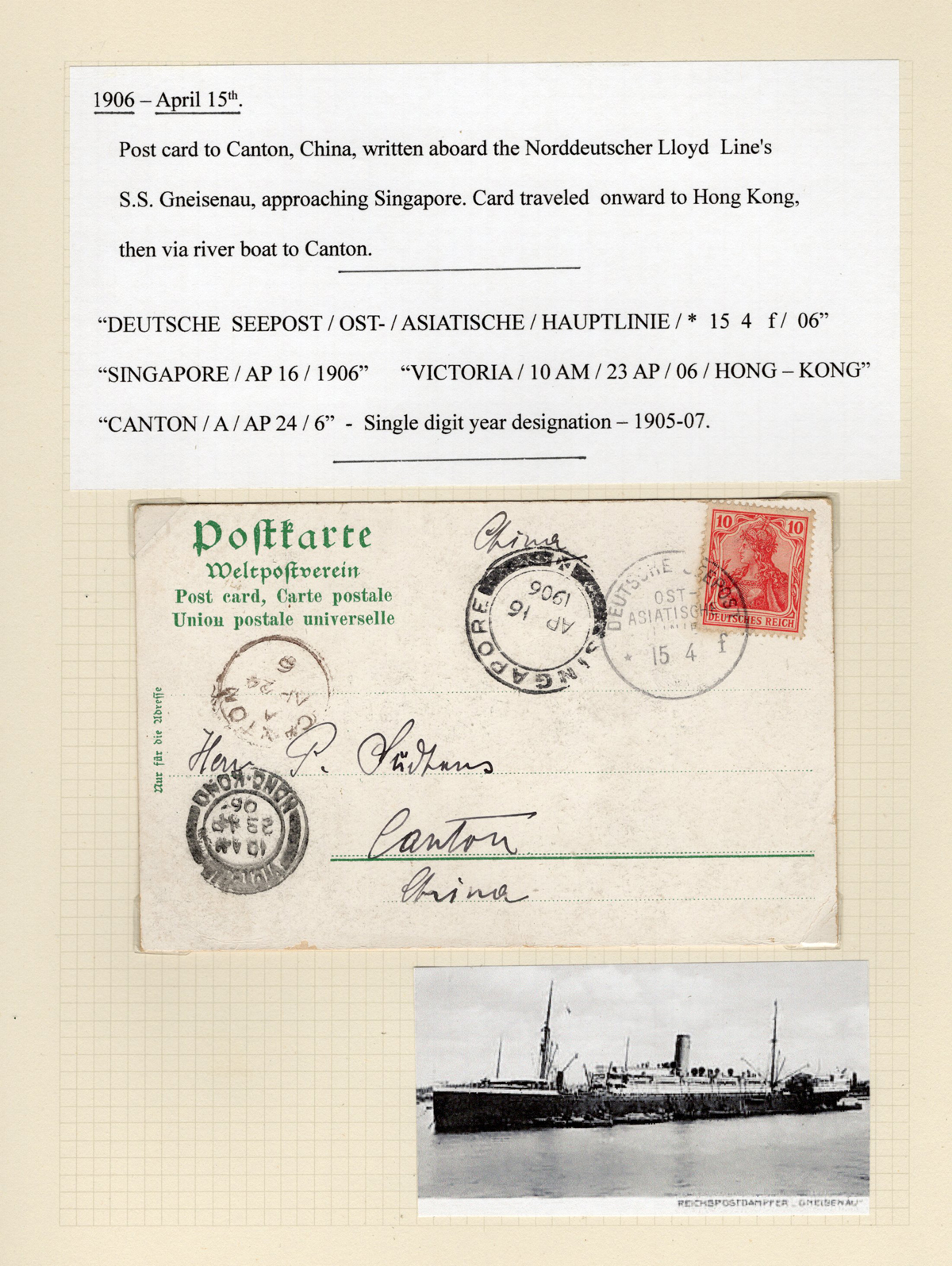 On Board a German Ship to Canton, China, a U.P.U. picture postcard mailed on APR.15.1906 (S.S. Gneisenau ship cancel ties 10pf stamp) to Canton (APR.24 receiver) through Singapore (APR.16 transit) and Victoria / Hong Kong (APR.23 transit). The