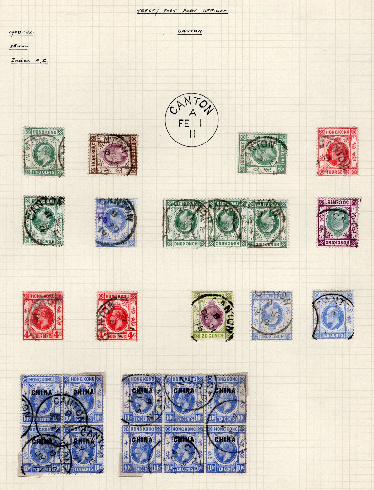 C.D.S. (Curved, with Index Letter A) Cancels on Twenty Five KEVII and KGV Hong Kong Issues, with mostly fine strikes on a variety of issues (up to the 50c), including a strip of three and two blocks (block of 4 and of 6) of CHINA overprinted