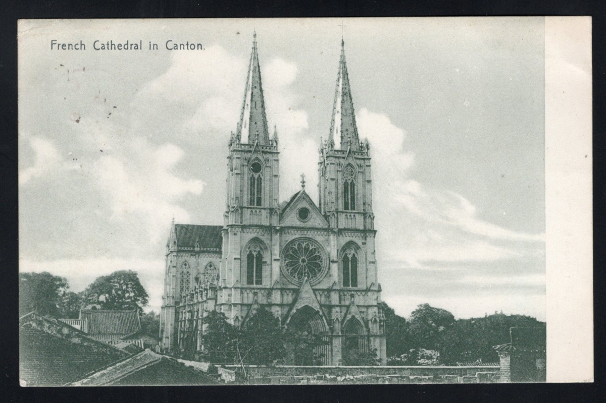 from Canton, China to England, a U.P.U. card showing “French Cathedral in Canton” mailed on SEP.20.1910 (c.d.s. ties 4c carmine KEVII Hong Kong stamp) to Lancaster, England, very fine. (Scan 1)