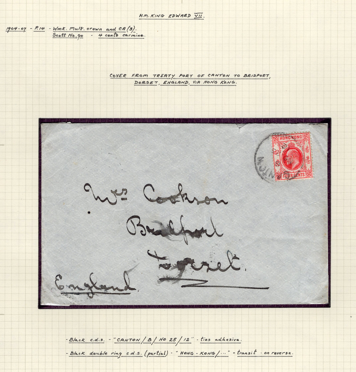 Canton, China to England, mailed on NOV.25.1912 (c.d.s. ties 2c carmine KEVII Hong Kong stamp) to Dorset, England, with a partial Hong Kong transit c.d.s. on back. Tear on back flap, else fine.