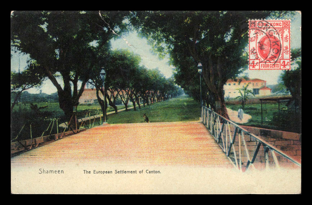 Postcard Possibly Written On Board the Empress of Russia in Hong Kong, picture side shows “Shameen / The European Settlement in Canton” and is franked with a 4c carmine KGV Hong Kong stamp tied by a Hong Kong MAR.18.1916 c.d.s. The message side