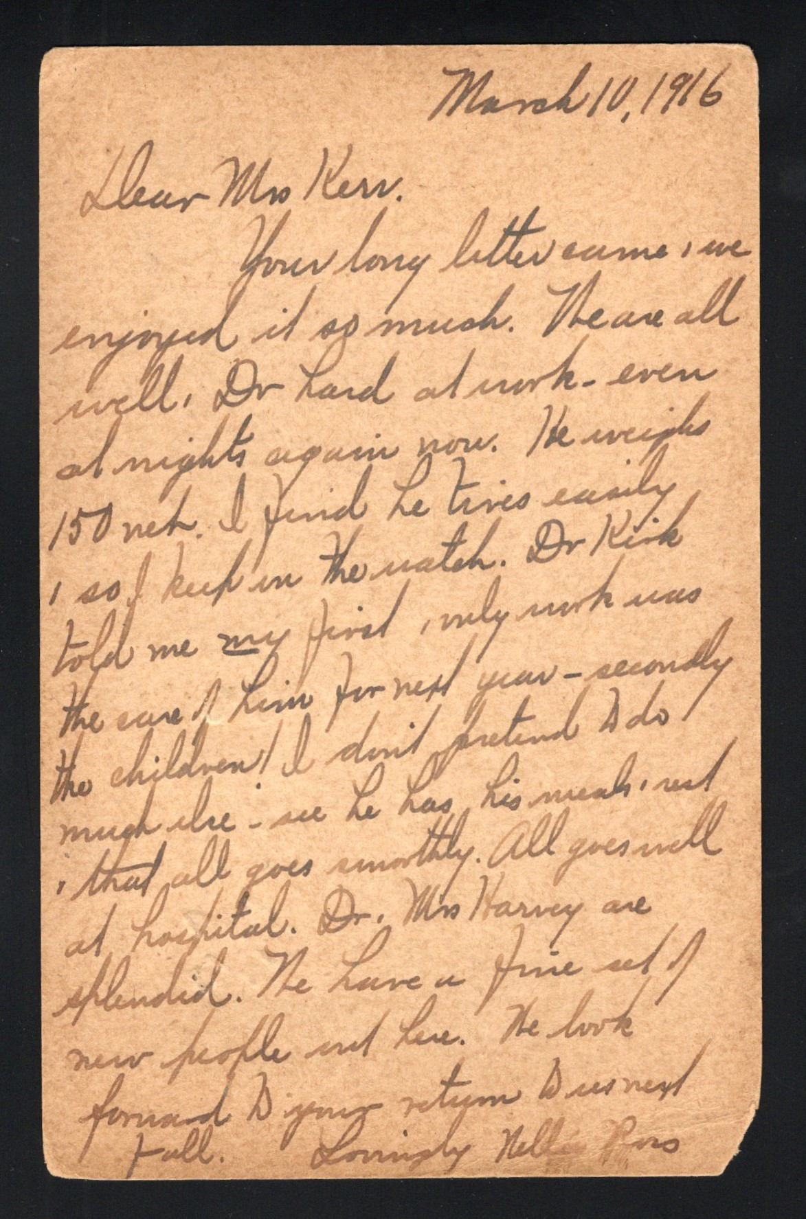 is filled with a long message and no address. It might have been privately delivered, or mailed under cover. It is datelined “17 Mar 1916” and is docketed “Received 19/4/1916” (more than a month later). The message was written by “Captain” who