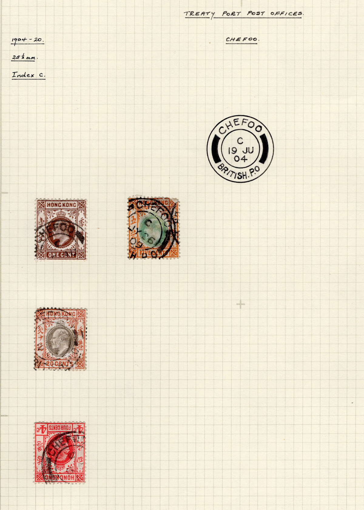 Foochow, China C.D.S. on Various Hong Kong Stamps, starts with two stamps (30c KEVII and 20c KGV) each with a dated FOOCHOW c.d.s., also a piece with three different KGV issues (4c, 20c and 50c) canceled with a single “BRITISH POST OFFICE /
