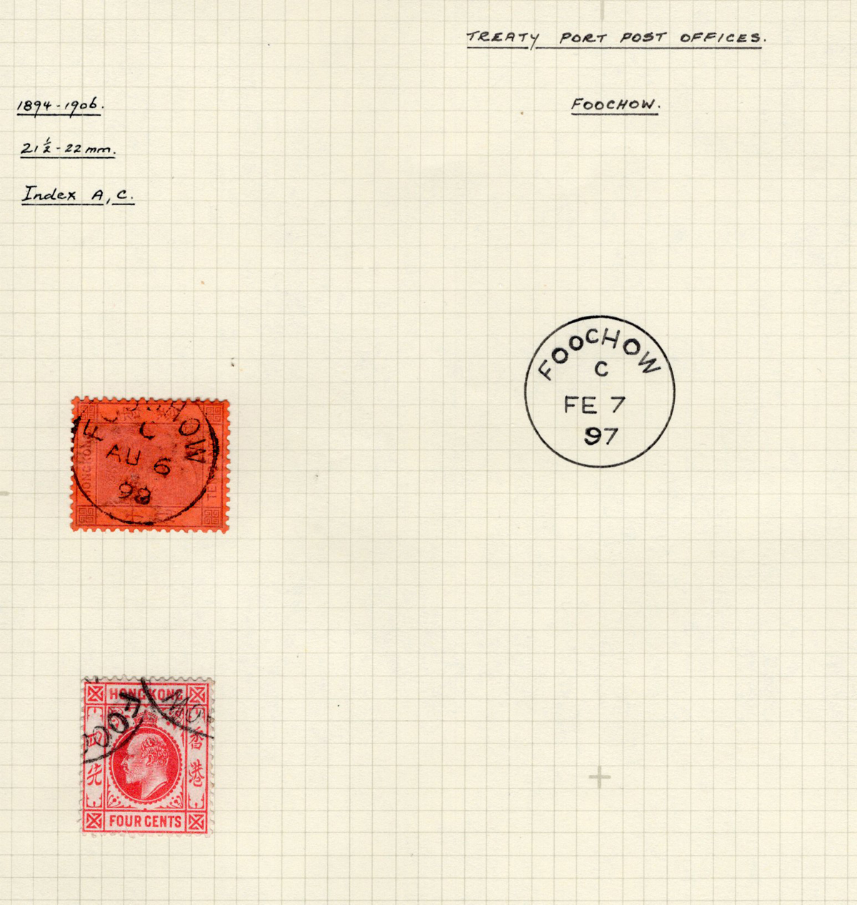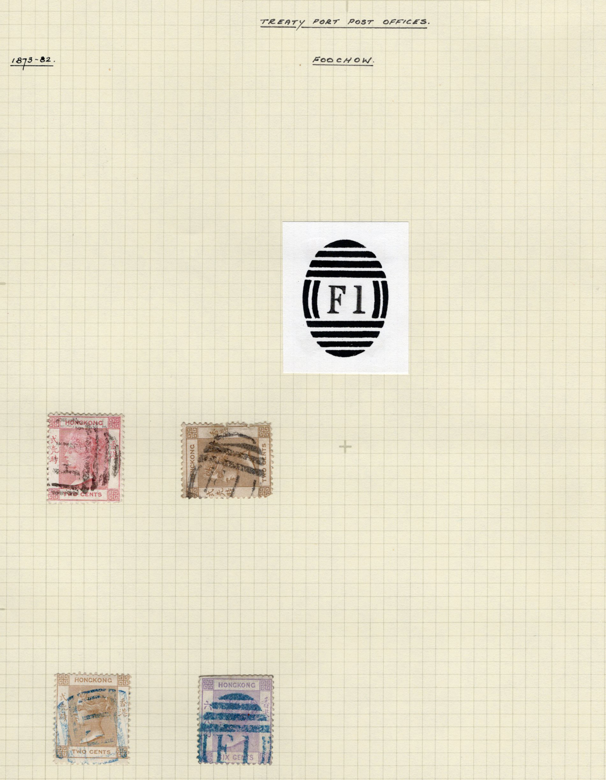 “FOOCHOWFOO” C.D.S. Cancels on Fifteen Queen Victoria (and One KEVII) Hong Kong Issues, each with a fine to very fine strike (majority are fully dated) on mostly 2c, 5c and 10c issues, overall fine.