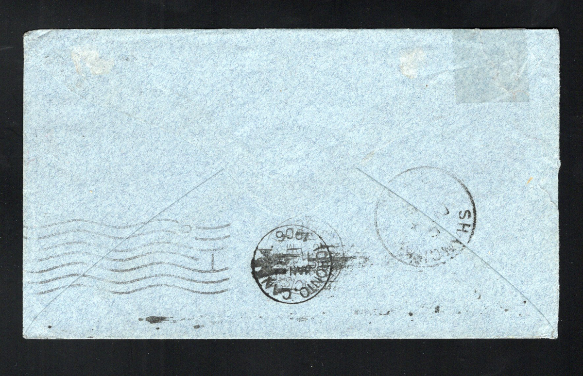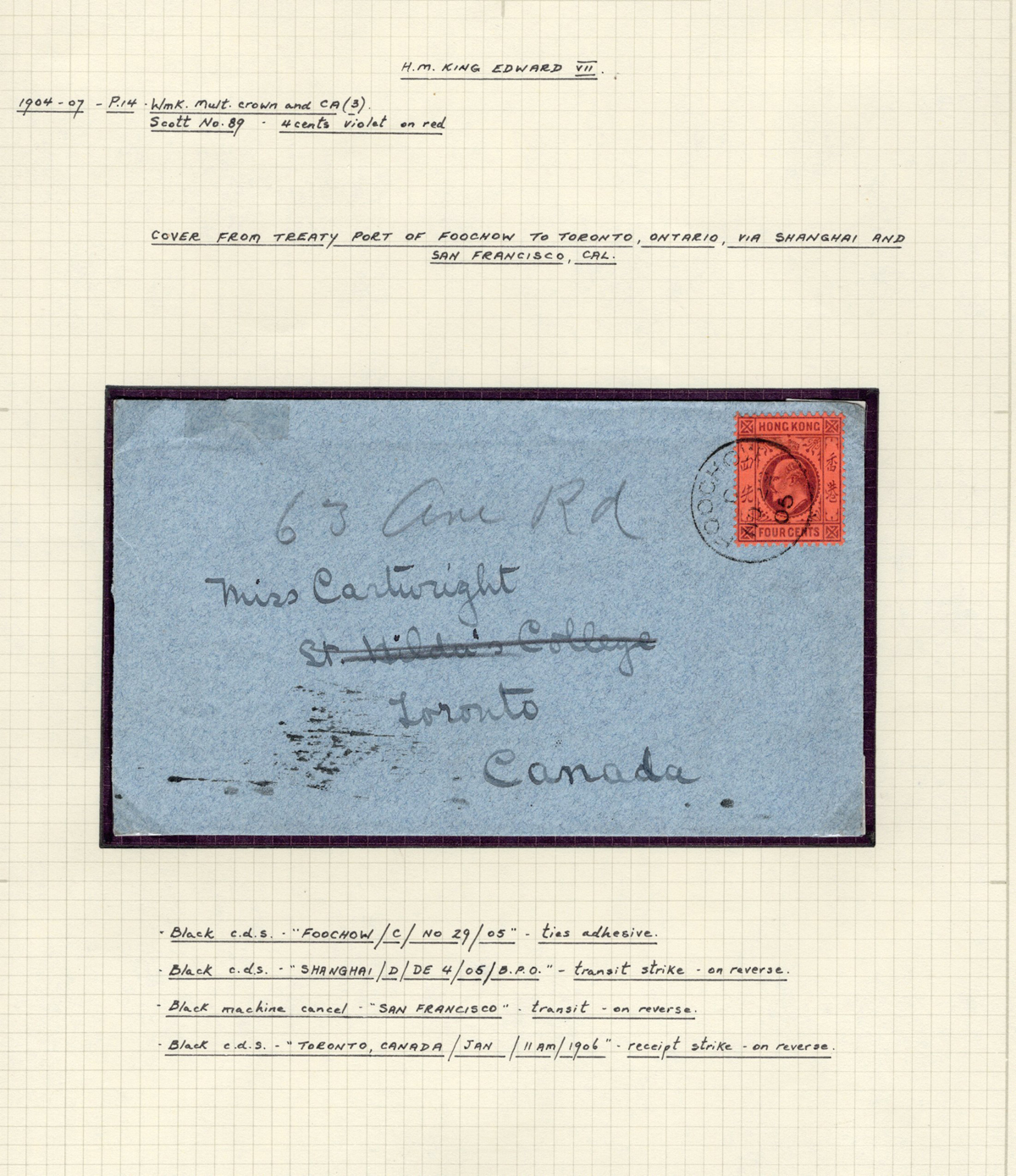 Cover to Canada, mailed on NOV.29.1905 (c.d.s. ties 4c violet on red KEVII Hong Kong stamp) to Toronto, Canada (JAN.??.1906 receiver) via Shanghai (partial December c.d.s. transit), small closed tear upper left, else very fine. (Scan 1)