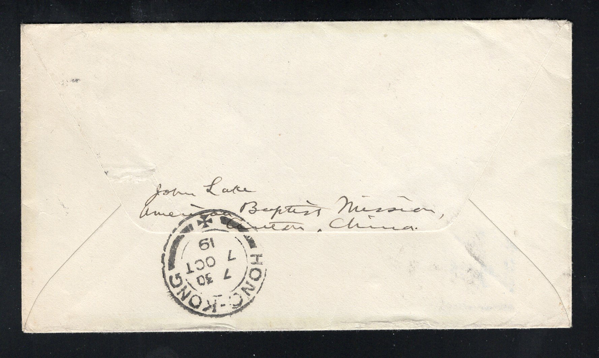 Cover to the United States, mailed on OCT.5.1919 (c.d.s. ties 10c blue KGV CHINA overprint) to Lexington, Kentucky, with a OCT.7.1919 double-circle Hong Kong transit on back.Very fine. (Scan 1)