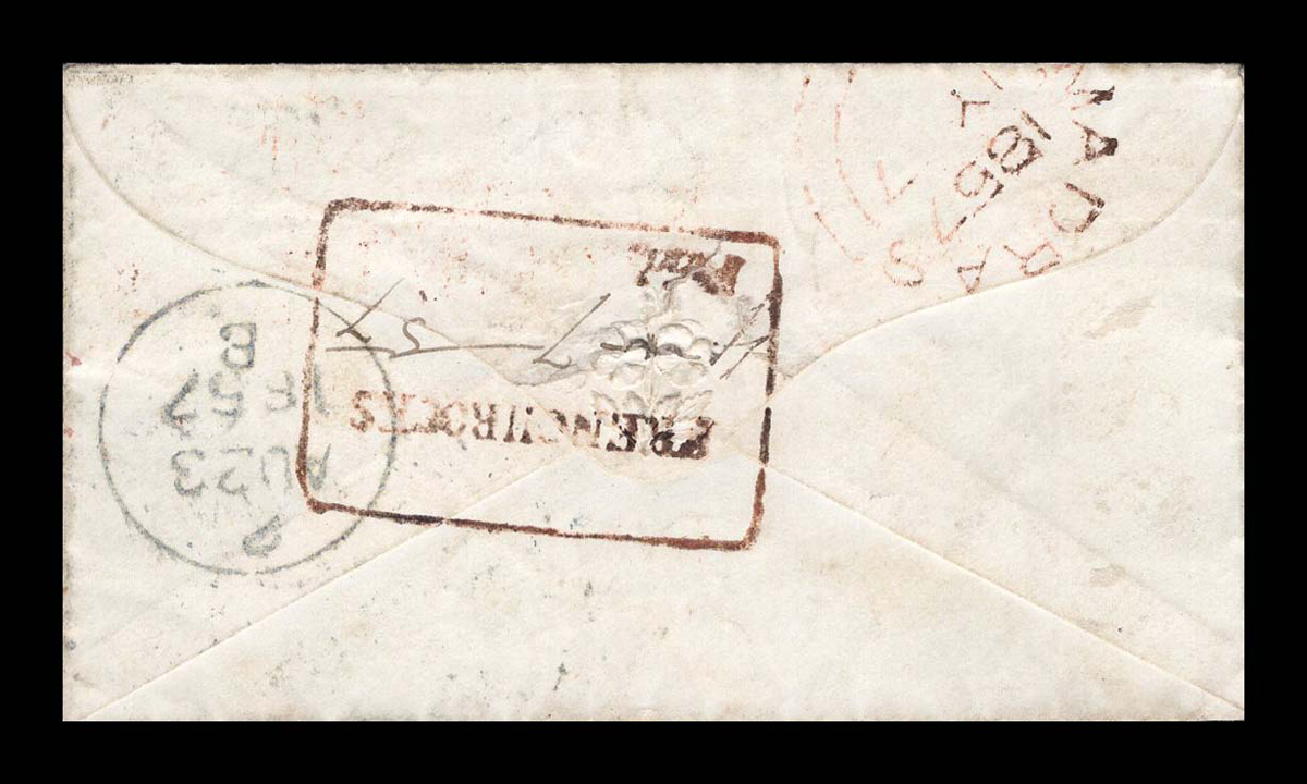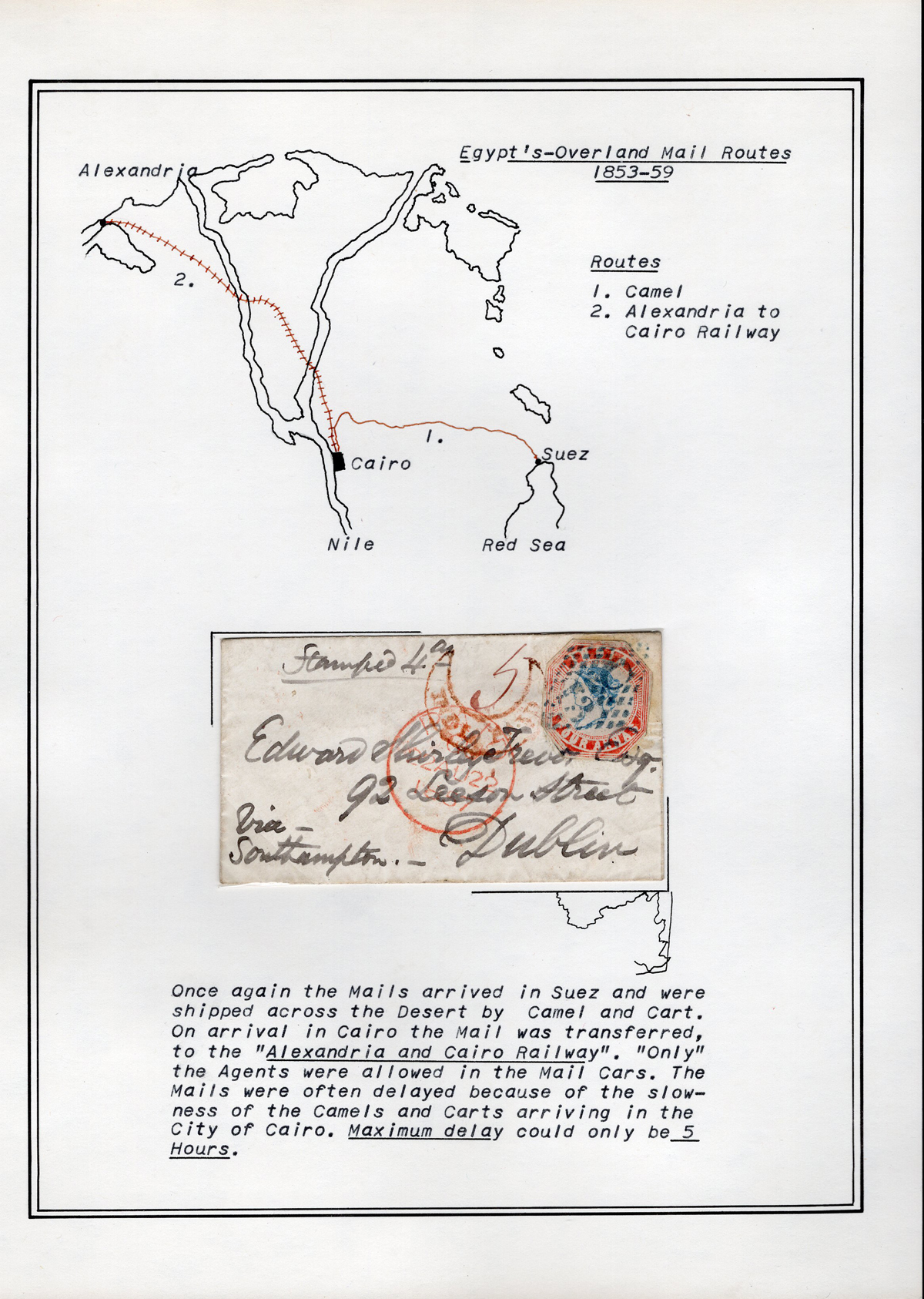 656 CVR   image1857 4a Queen Victoria Imperforate on Cover to Ireland, a lovely small cover which appears to have been mailed from "Frenchrouts" (?) on JUL.4.1857 (boxed handstamp on back), through Madras JUL.7.1857 (backstamp) to Dublin, Ireland, endorsed "via Southampton" with a red "PAID" handstamp dated AUG.22.1857 on front and AUG.23 English receiver on back. The cover is franked with a 4a blue and red Queen Victoria imperforate (Head Die III, Frame Die II, cut to shape, with margins well clear of frameline all around), canceled and tied by a "C/13" in a dotted diamond cancel (in blue, scarce thus) and a crescent-shaped "INDIA PAID" handstamp in red. The accompanying write-up describes the part of the trip where the cover was transported by camel from Suez to Cairo, then train to Alexandria. Very fine in all aspects. (Scan 1) (Scan 2) (All Scans) (All Images)