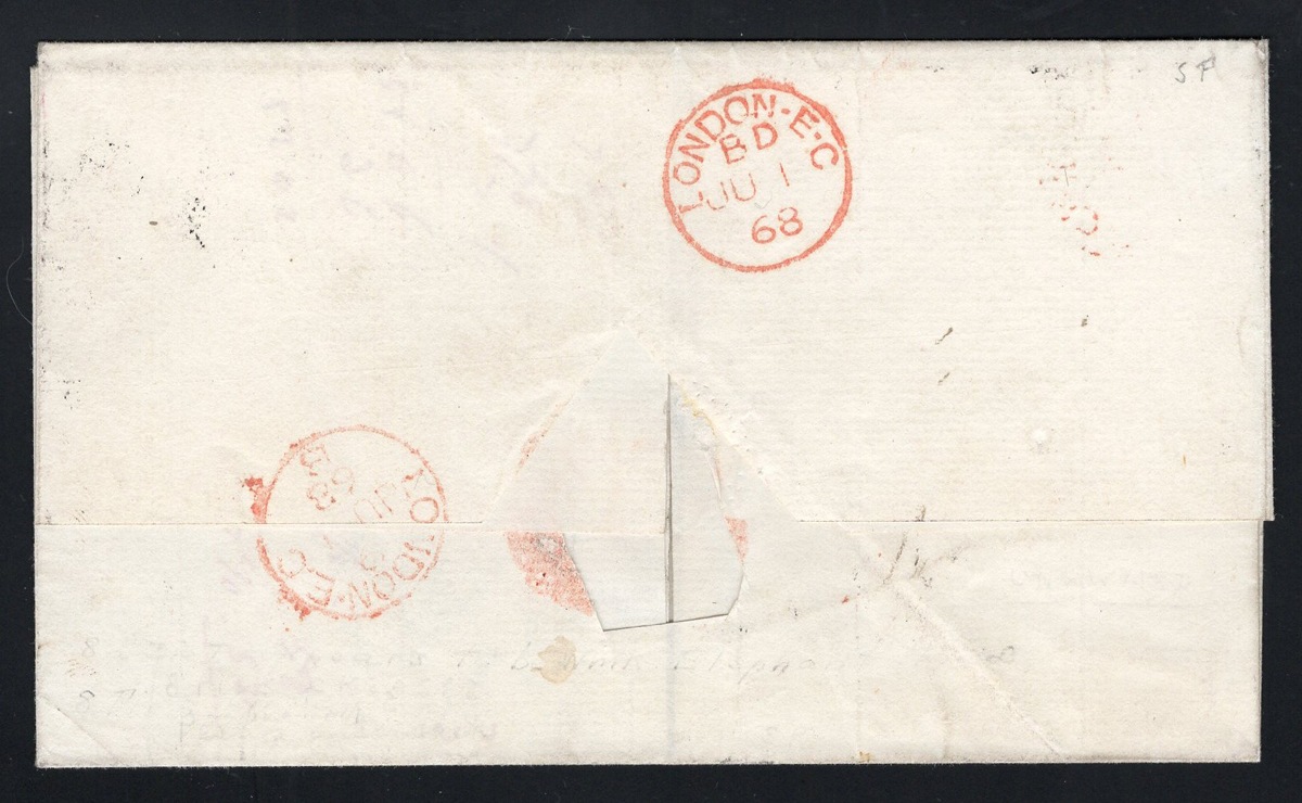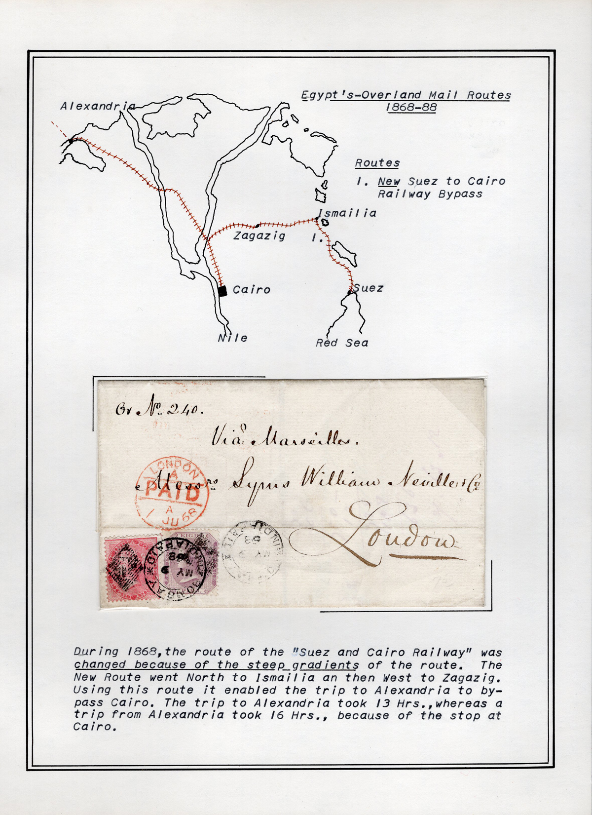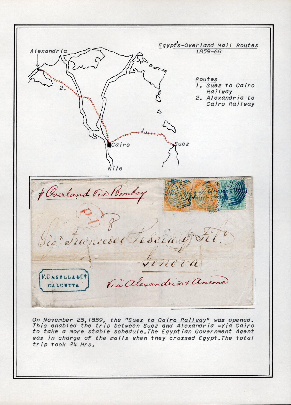 659 CVR   image1868 Folded Cover Bombay to England, mailed from Bombay on MAY.9.1868 (diamond grid "India Paid" duplex) to London England (JUN.1 "PAID" receiver in red on front, plus two JUN.1 c.d.s. receivers in red on back). The folded cover is franked with an 8a rose Queen Victoria and a 8p lilac Queen Victoria. The accompanying write-up describes the new route from Suez to Ismailia to Zagazig to Alexandria, very fine. (Scan 1) (Scan 2) (All Scans) (All Images)