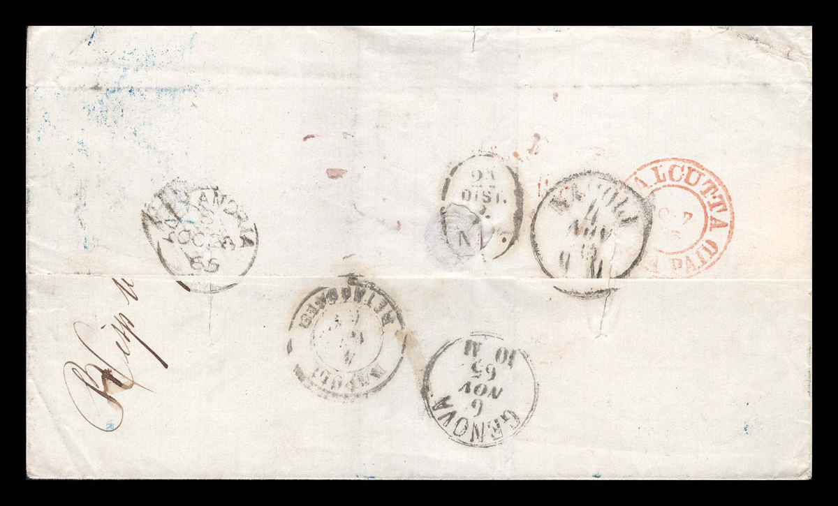 658 CVR   image1865 Cover from Calcutta to Italy, mailed from Calcutta (OCT.7.1865) to Genoa, Italy (NOV.6.1865 receiver) through Alexandria, Egypt (OCT.28), Naples (NOV.4), "Napoli / Etranger" (NOV.4 transit), endorsed "p. Overland via Bombay" and "via Alexandria & Ancona". The folded cover is franked with two 2a orange Queen Victoria and a 4a green Queen Victoria (totaling 8a), all canceled by barred "B1" in blue cancels. Bit of edge and other wear, still a fine and colourful cover. (Scan 1) (Scan 2) (All Scans) (All Images)