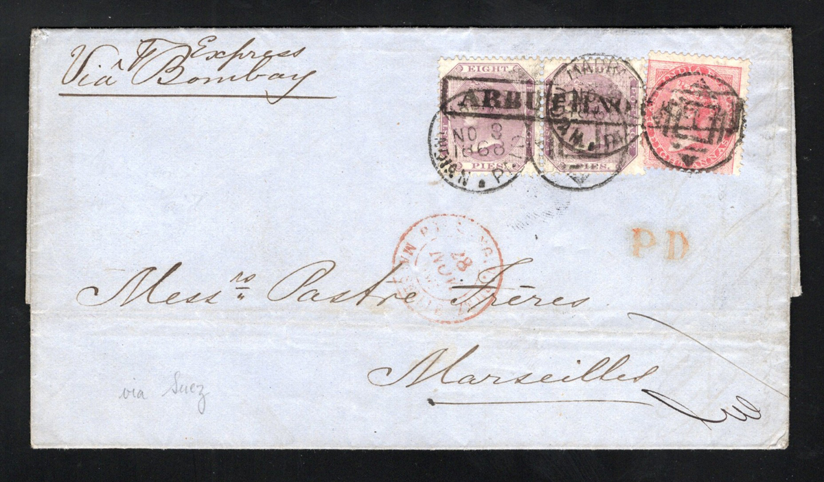 660 CVR   image1868 Folded Letter Madras to France, mailed from Madras on NOV.3.1868 (star duplex cancels) to Marseilles, France (red NOV.28 receiver on front) with "PD" handstamp in red, through forwarding agent "Areuthnot & Pcod" (? - boxed cancel on the stamps), with Bombay NOV.7 backstamp, endorsed "via Express Bombay". The folded letter is franked with an 8a rose and pair of 8p lilac Queen Victoria issues, very fine.