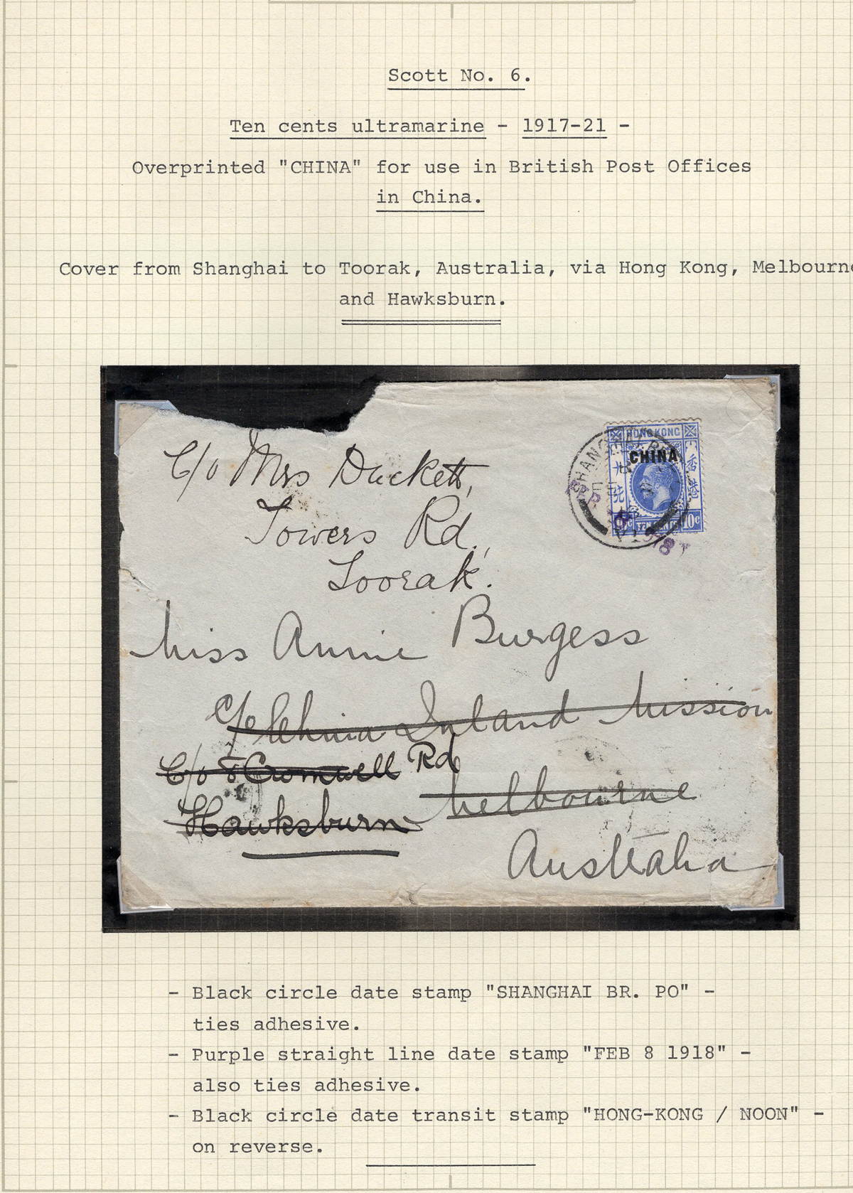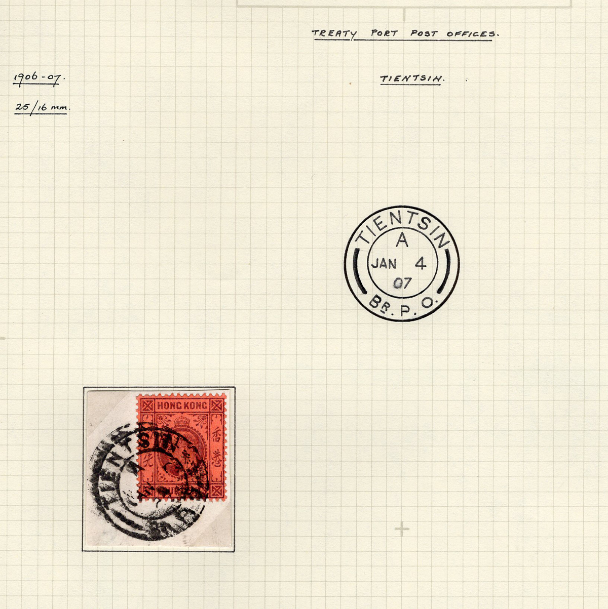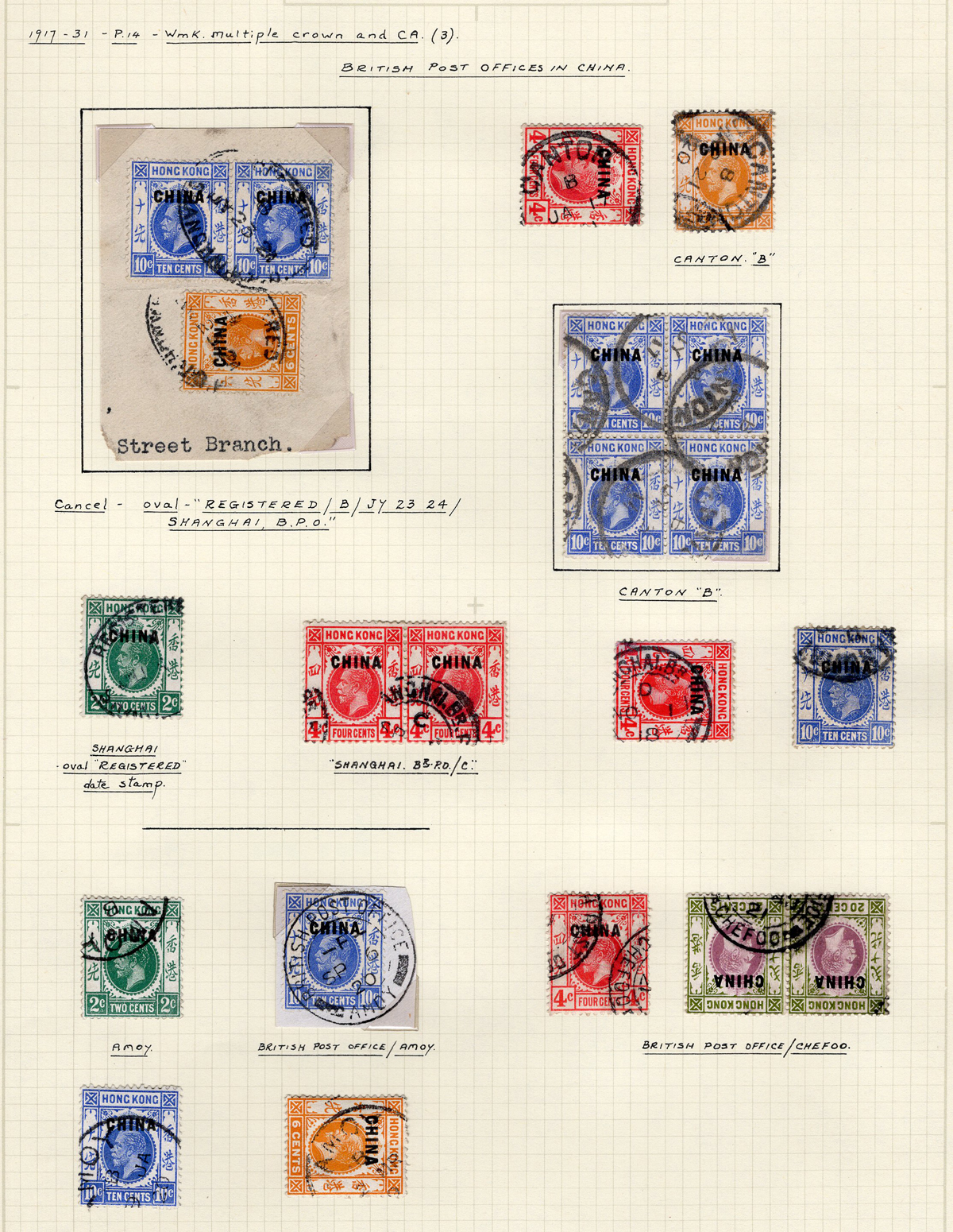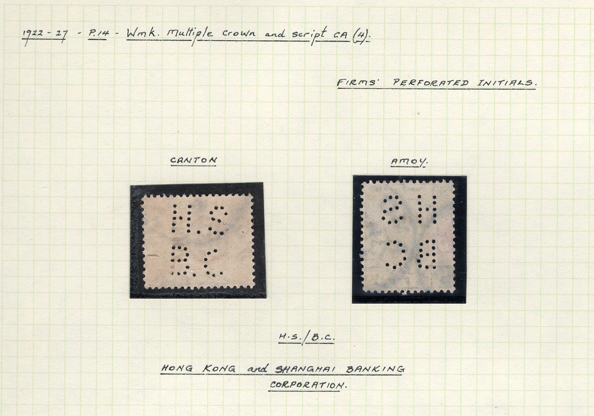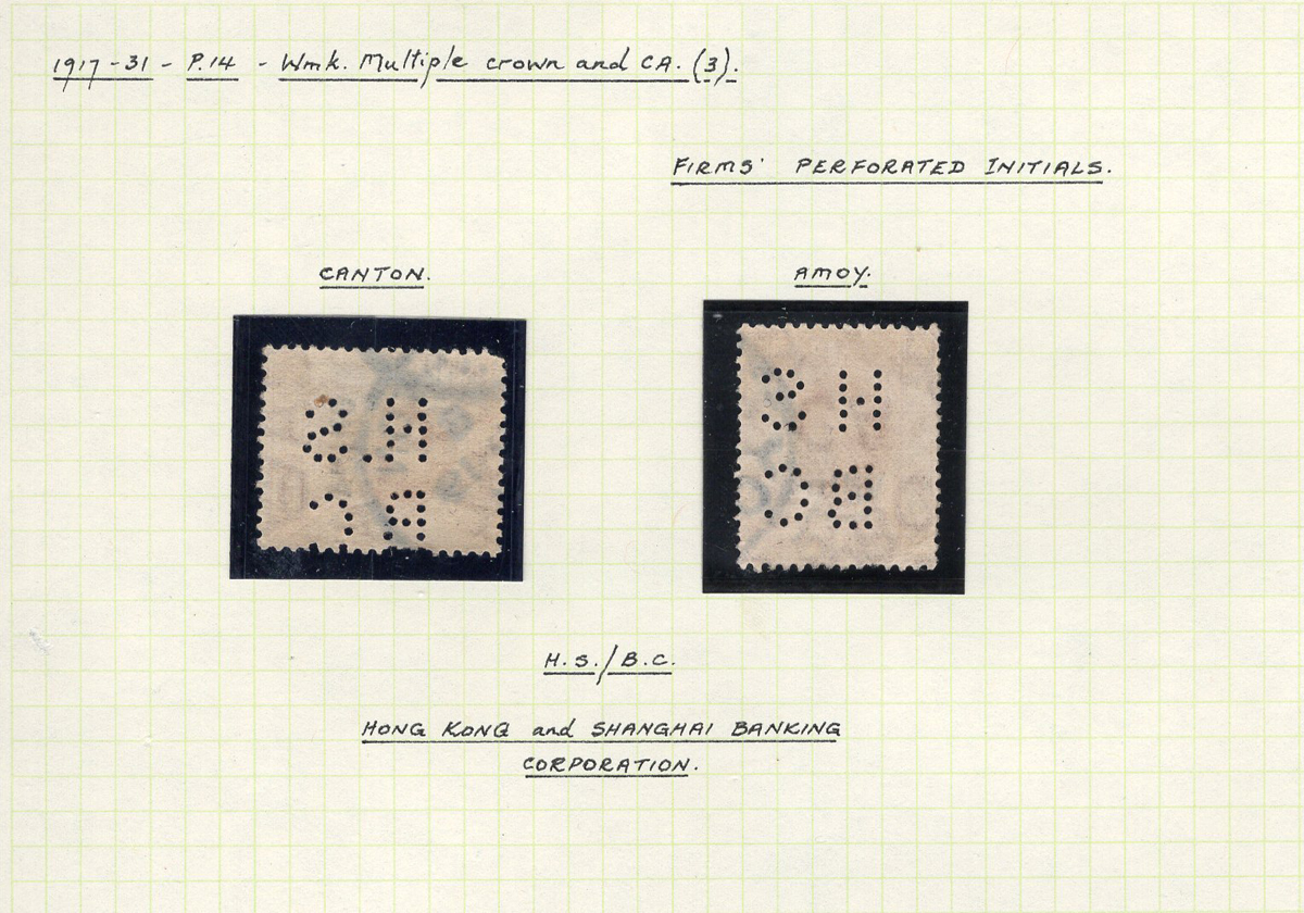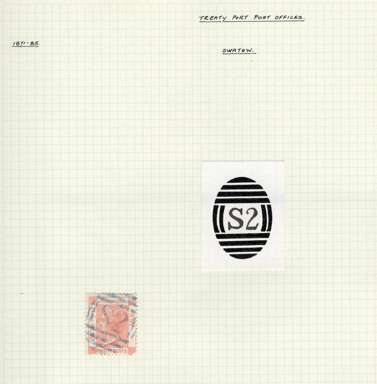 653   imageRemainder Lot of the Hong Kong Treaty Port Collection, starts with the owner's seven detailed introduction pages which include three picture postcards (monument of Sir Harry in Shanghai, the British Consulate in Shanghai, and the Chefoo Harbour), as well as some illustrations and two Foochow Local Post stamps. The second part consists of 7 pages pertaining to the CHINA overprinted Hong Kong stamps and their postmarks, with three pages containing 51 stamps and a stationery cut-out, all sorted by their various postmarks, all neatly described by the owner. Also includes a cover mailed in 1918 from Shanghai to Australia (tear) and 4 private perfin stamps "HSBC" from Canton and Amoy (two of each watermark). A useful lot for the enthusiast, all pages scanned online. (Scan 1) (Scan 2) (Scan 3) (Scan 4) (Scan 5) (Scan 6) (Scan 7) (Scan 8) (Scan 9) (Scan 10) (Scan 11) (Scan 12) (Scan 13) (Scan 14) (All Scans) (All Images)