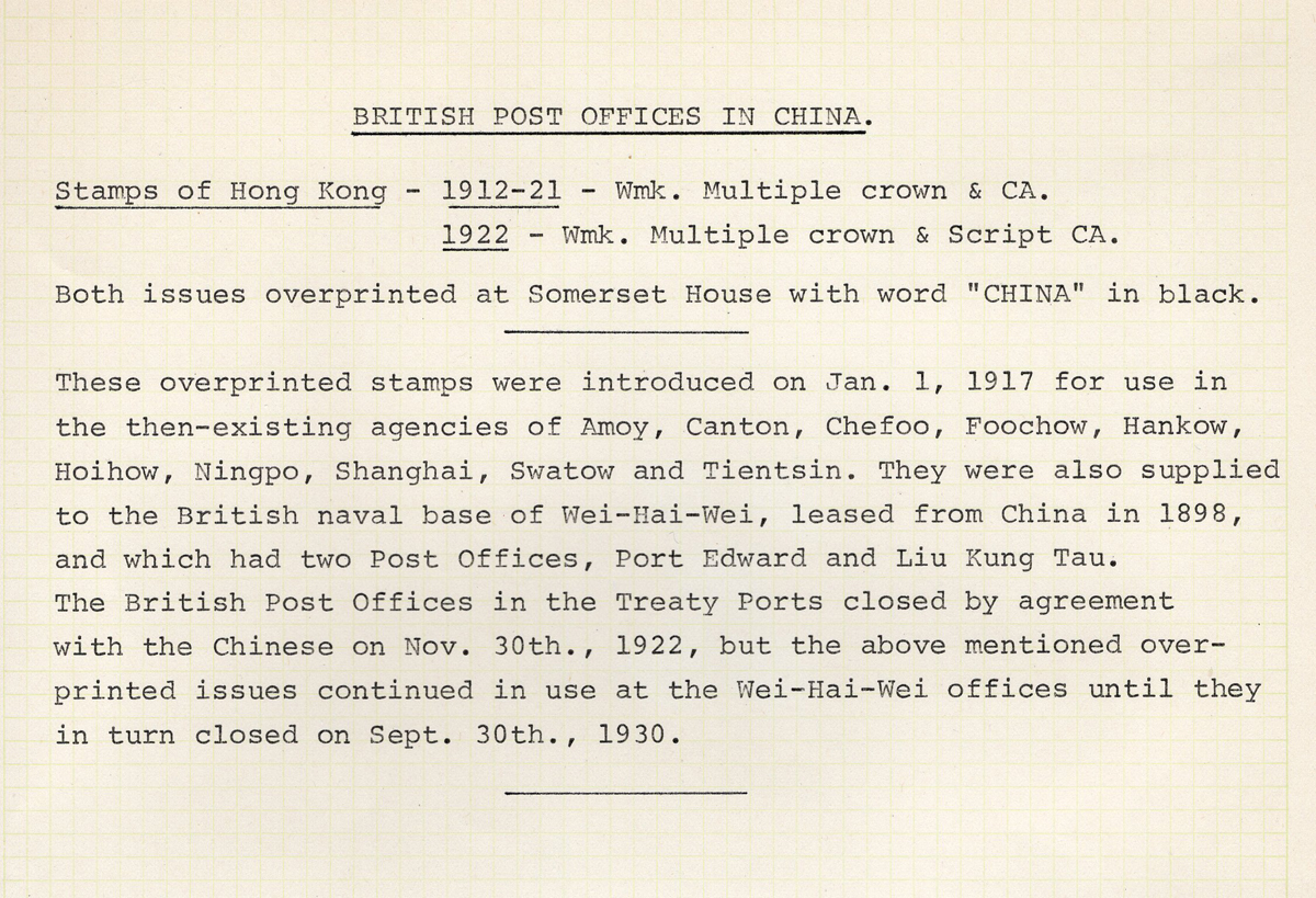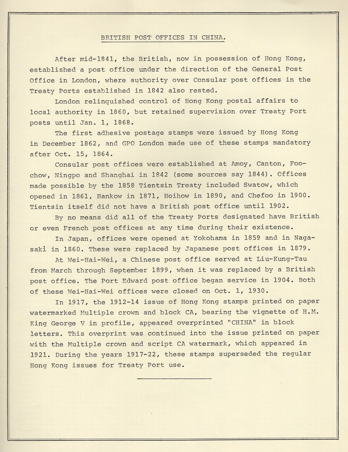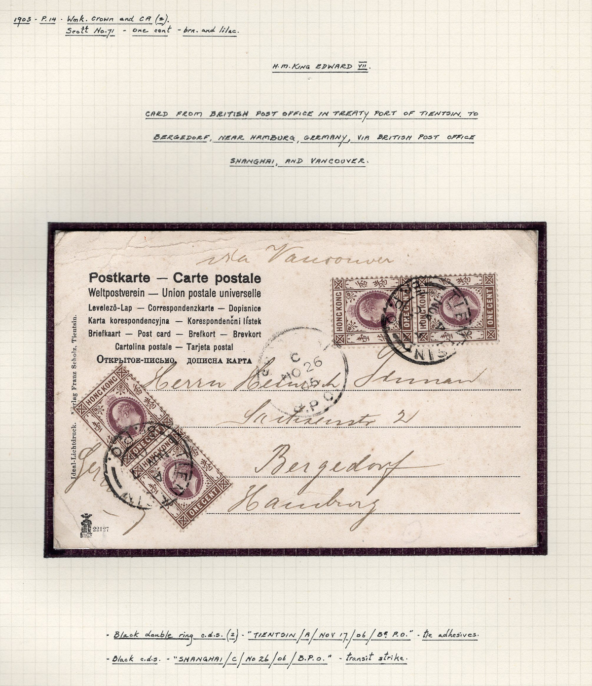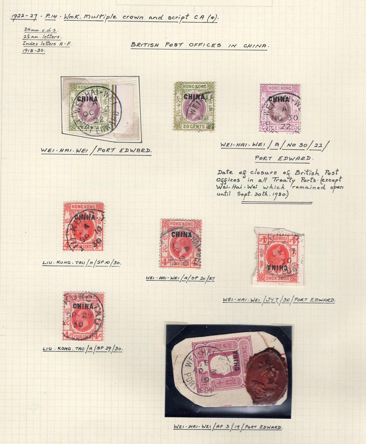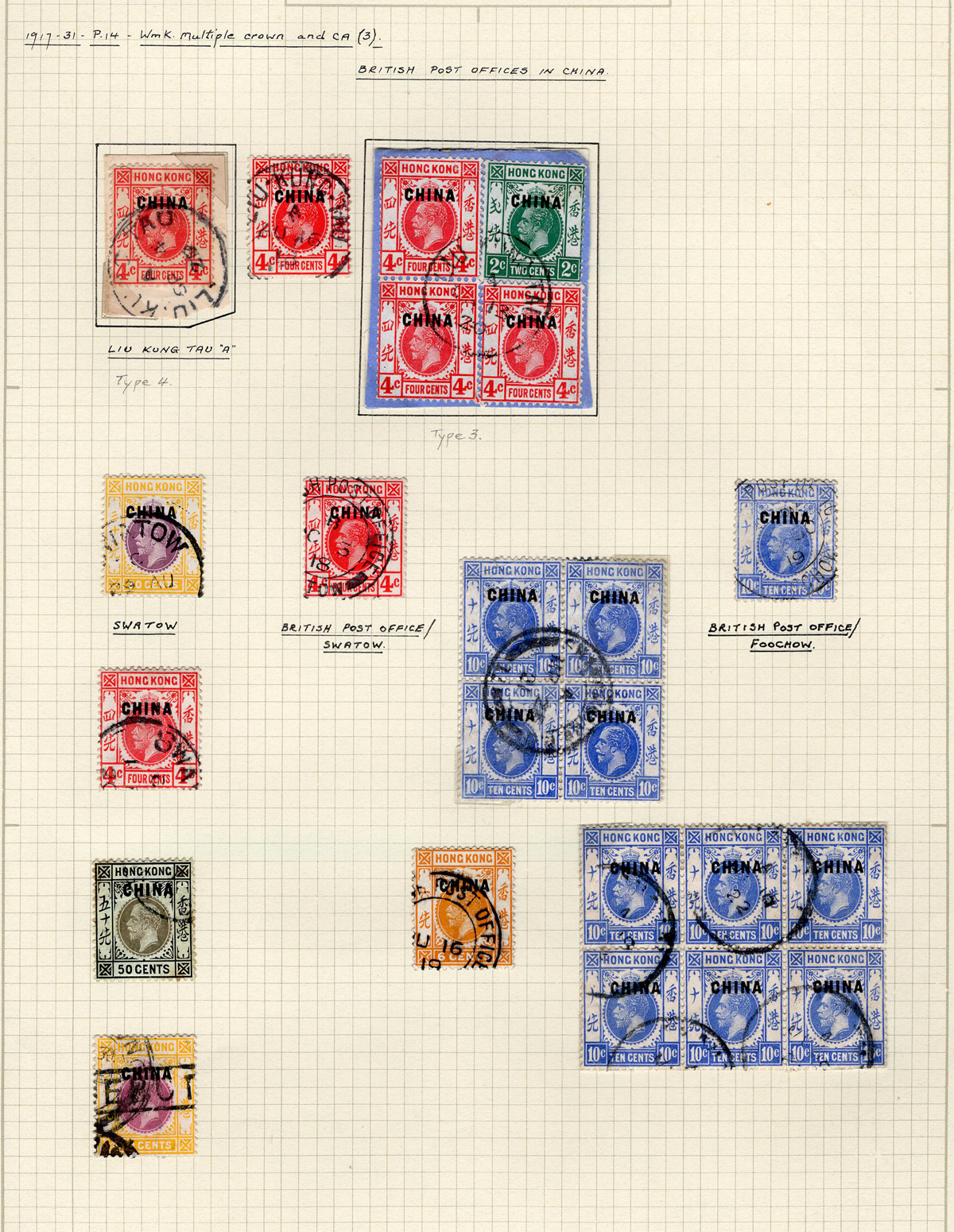 653   imageRemainder Lot of the Hong Kong Treaty Port Collection, starts with the owner's seven detailed introduction pages which include three picture postcards (monument of Sir Harry in Shanghai, the British Consulate in Shanghai, and the Chefoo Harbour), as well as some illustrations and two Foochow Local Post stamps. The second part consists of 7 pages pertaining to the CHINA overprinted Hong Kong stamps and their postmarks, with three pages containing 51 stamps and a stationery cut-out, all sorted by their various postmarks, all neatly described by the owner. Also includes a cover mailed in 1918 from Shanghai to Australia (tear) and 4 private perfin stamps "HSBC" from Canton and Amoy (two of each watermark). A useful lot for the enthusiast, all pages scanned online. (Scan 1) (Scan 2) (Scan 3) (Scan 4) (Scan 5) (Scan 6) (Scan 7) (Scan 8) (Scan 9) (Scan 10) (Scan 11) (Scan 12) (Scan 13) (Scan 14) (All Scans) (All Images)