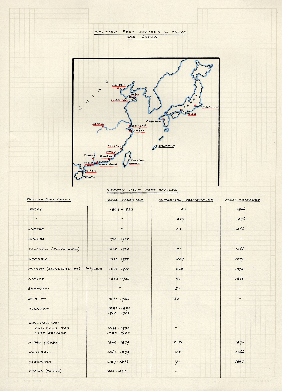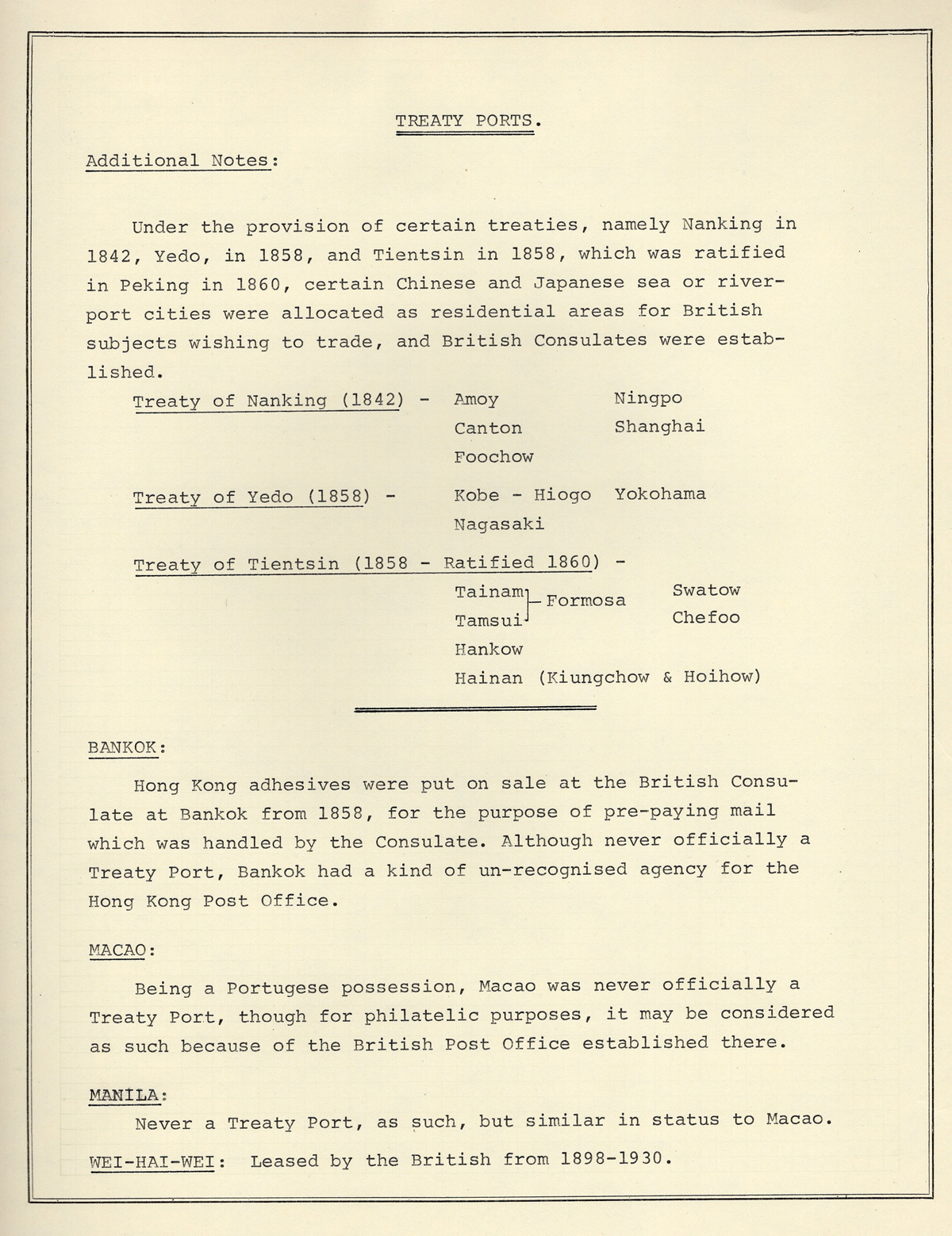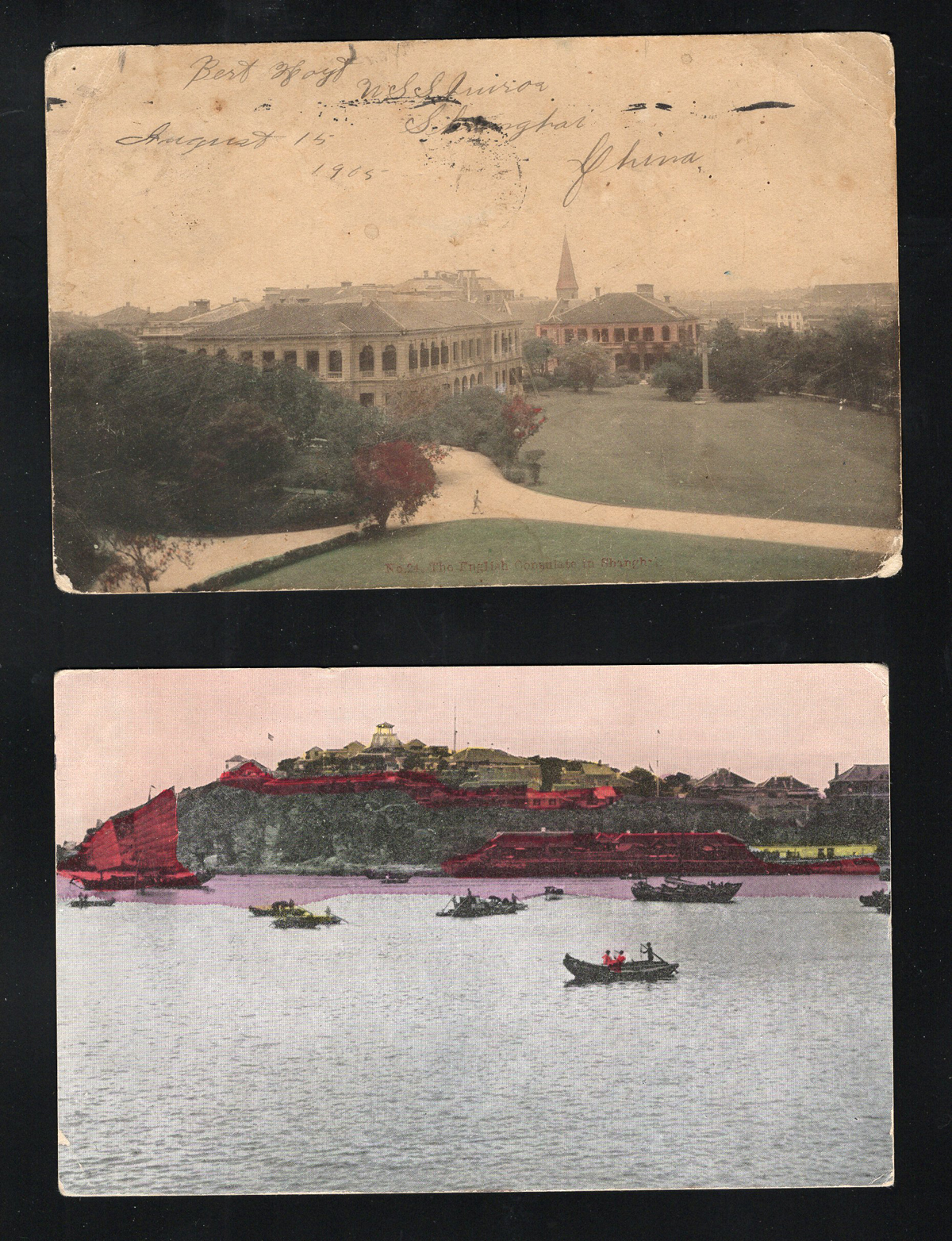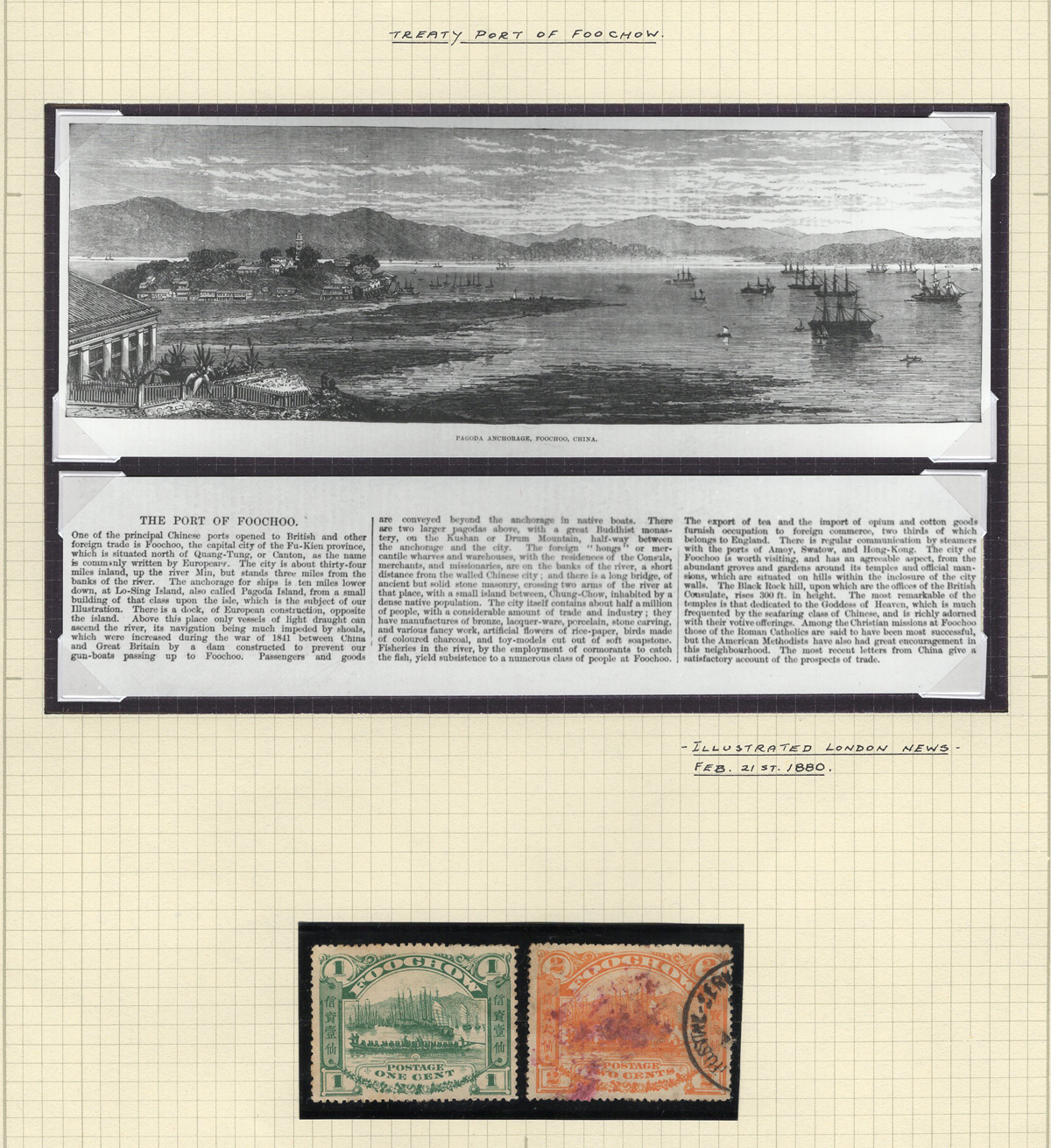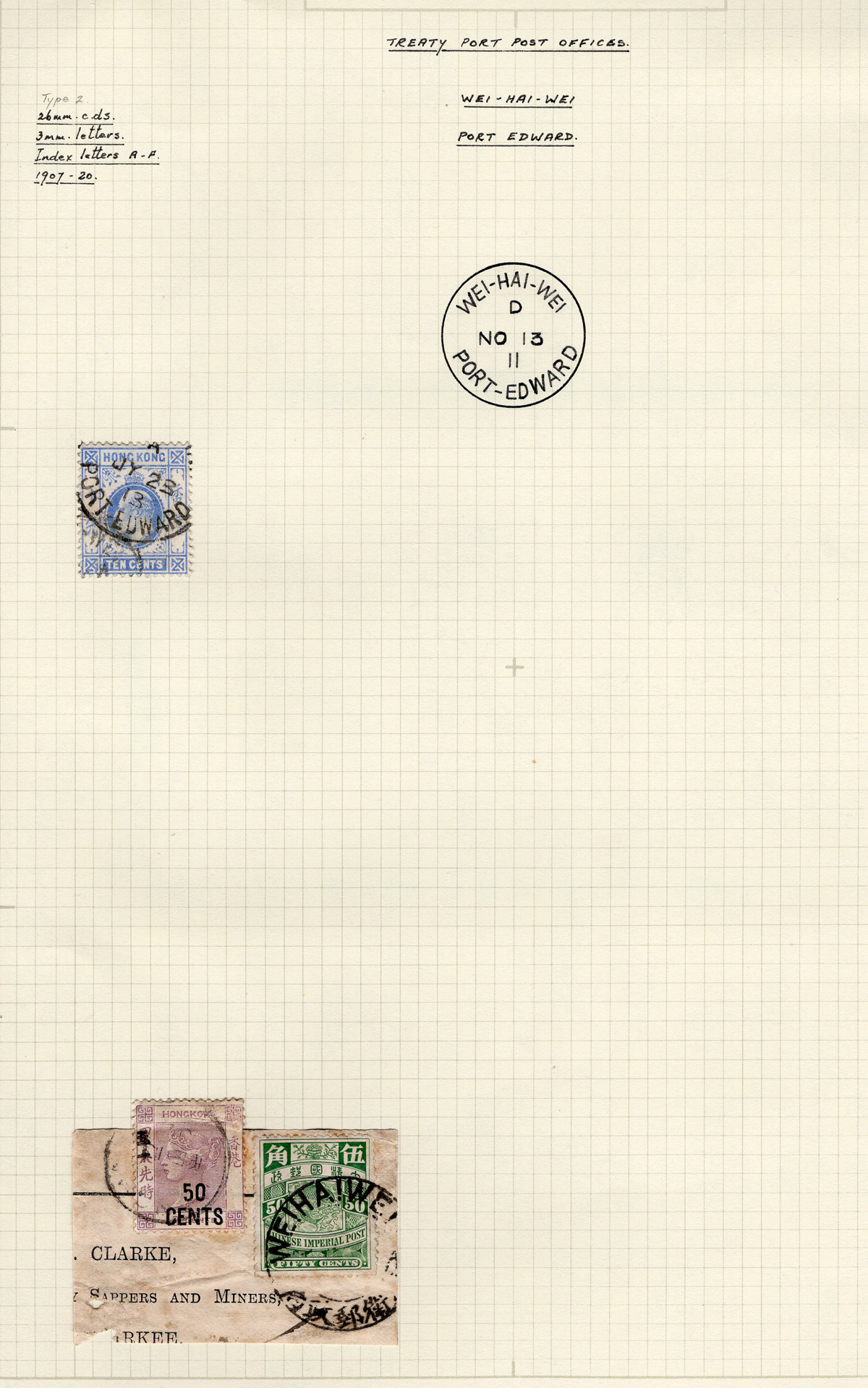 653   imageRemainder Lot of the Hong Kong Treaty Port Collection, starts with the owner's seven detailed introduction pages which include three picture postcards (monument of Sir Harry in Shanghai, the British Consulate in Shanghai, and the Chefoo Harbour), as well as some illustrations and two Foochow Local Post stamps. The second part consists of 7 pages pertaining to the CHINA overprinted Hong Kong stamps and their postmarks, with three pages containing 51 stamps and a stationery cut-out, all sorted by their various postmarks, all neatly described by the owner. Also includes a cover mailed in 1918 from Shanghai to Australia (tear) and 4 private perfin stamps "HSBC" from Canton and Amoy (two of each watermark). A useful lot for the enthusiast, all pages scanned online. (Scan 1) (Scan 2) (Scan 3) (Scan 4) (Scan 5) (Scan 6) (Scan 7) (Scan 8) (Scan 9) (Scan 10) (Scan 11) (Scan 12) (Scan 13) (Scan 14) (All Scans) (All Images)