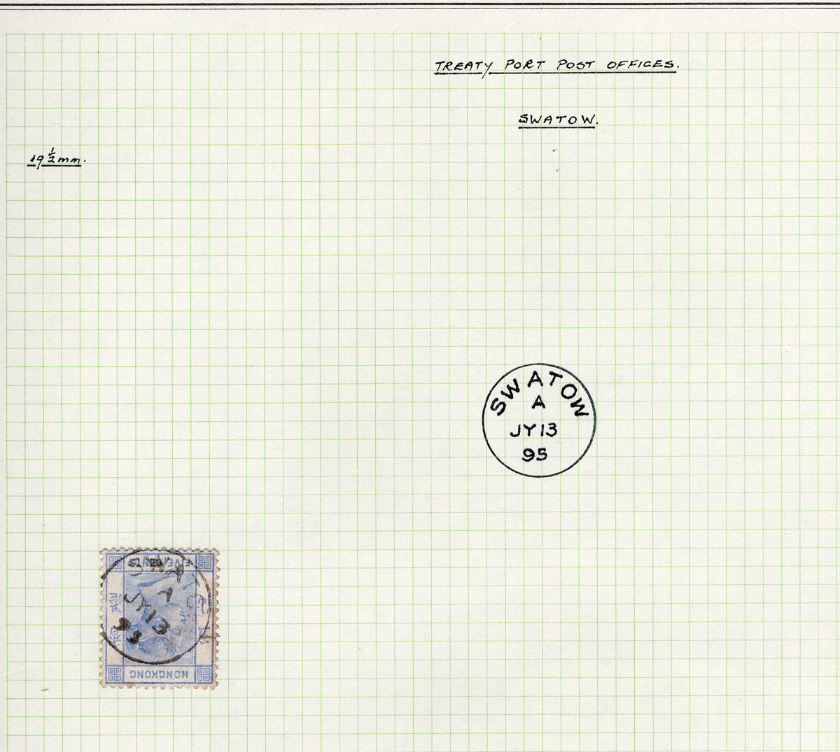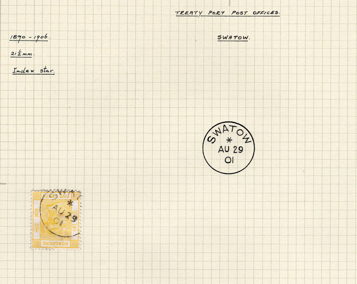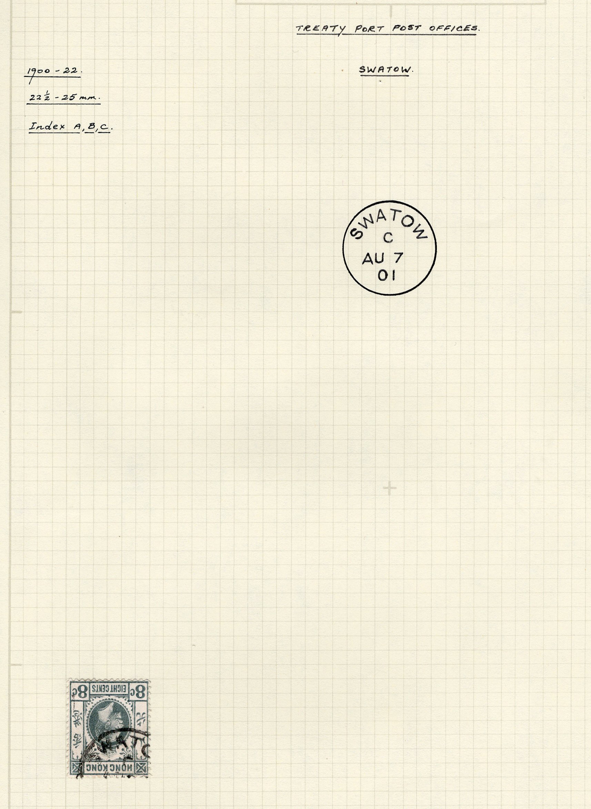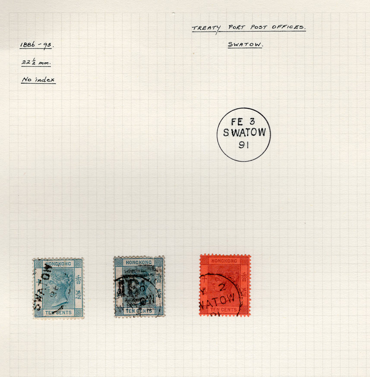 641 O   image1871-1922 “S2” and “SWATOW” (Straight and Curved C.D.S.) Cancels on Seven QV to KGV Hong Kong Stamps, starts with a “S2" (in blue on a 30c orange vermilion QV (listed but unpriced in both Scott and Stanley Gibbons), SWATOW (straight c.d.s.) on three QV issues, SWATOW (curved c.d.s.) with * Index on a 5c yellow QV, "A" Index on a 5c blue QV and "C" Index on 8c KGV. Overall fine. (Scan 1) (Scan 2) (Scan 3) (Scan 4) (Scan 5) (All Scans) (All Images)