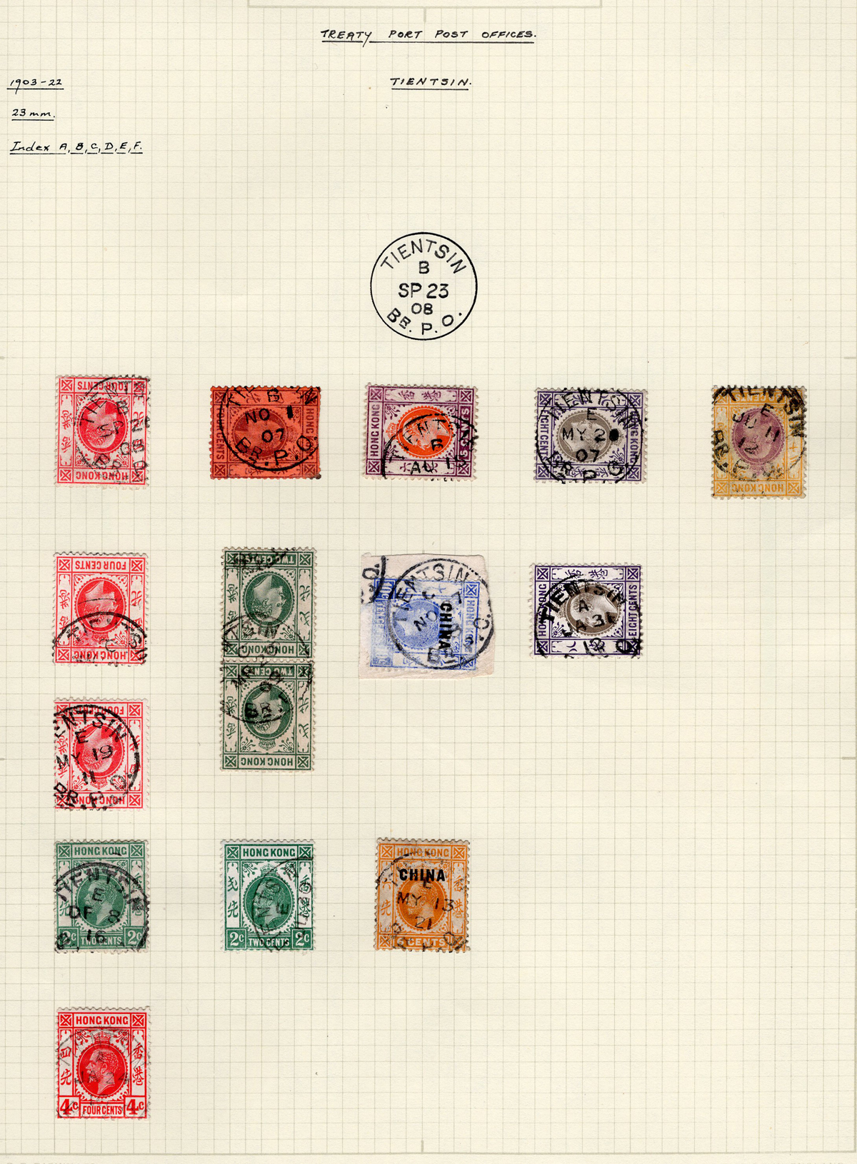 643 O   image1903-22 “TIENTSIN / Br. P.O.” C.D.S. Cancels on Fifteen KEVII and KGV Hong Kong Stamps, with a variety of issues, including two CHINA overprints, several well dated, etc. Also includes a “TIENTSIN / Br. P.O.” double circle cancel on a 4c KEVII stamp. Overall fine or better. Scott catalogue value (excluding the CHINA overprints) is $250, SG £224. (Scan 1) (Scan 2) (All Scans) (All Images)