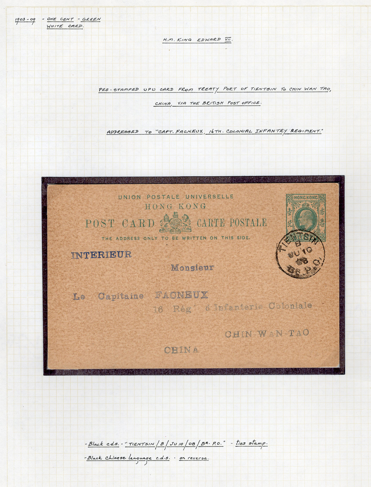 644 PC   image1908 U.P.U. Postal Card from Tientsin China to Chin Wan Tao China, mailed on JUN.8.1908 (TIENTSIN / Br. P.O. cancels 1c green KEVII stationery card stamp), with a Chinese language receiver on back. Addressed to a Captain in the 16th Colonial Infantry Regiment, very fine. (Scan 1) (Scan 2) (All Scans) (All Images)
