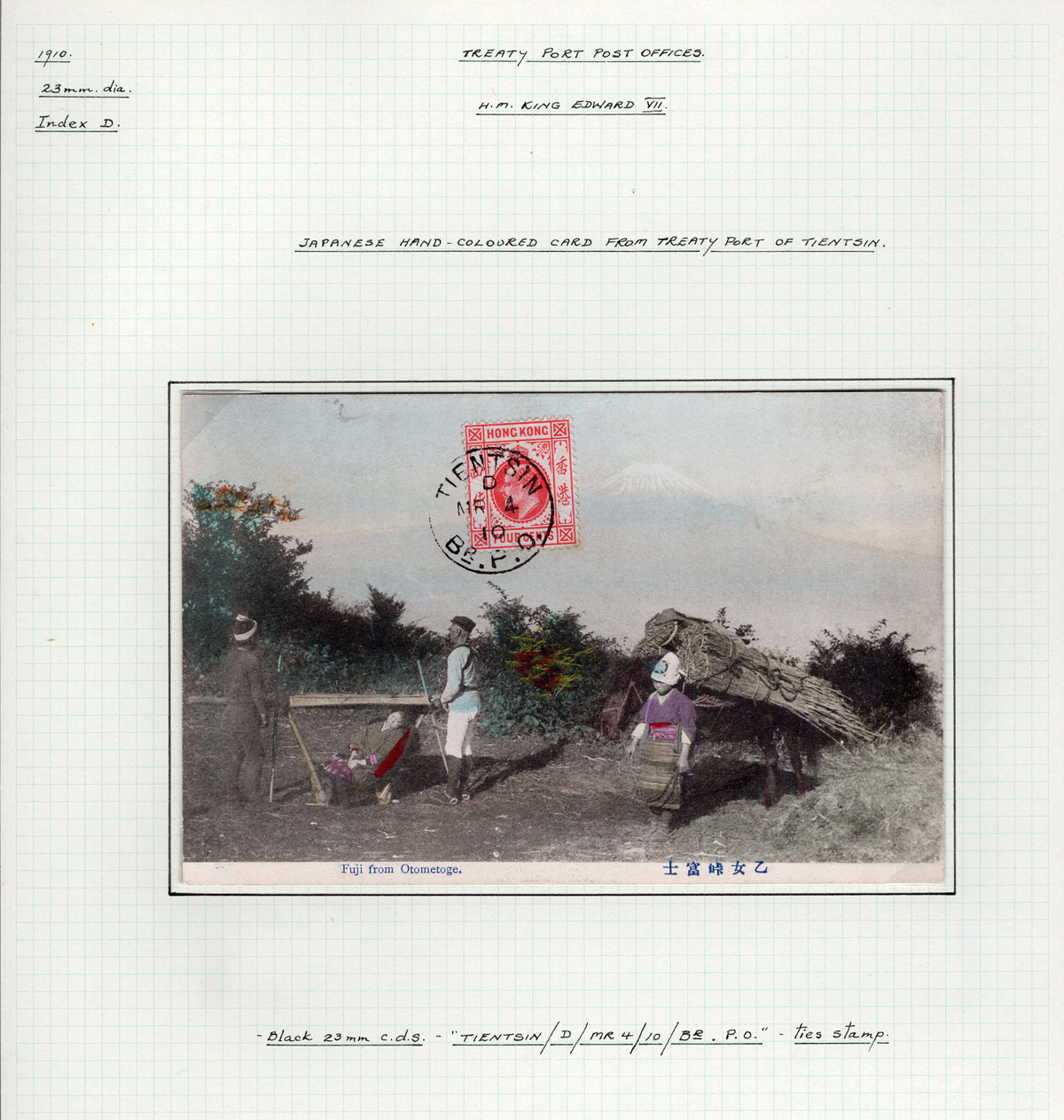 645 PC   image1910 Unmailed Japanese Picture Postcard from Tientsin China, postmarked (on picture side) MAR.4.1910 (TIENTSIN / Br. P.O. cancels a 4c KEVII Hong Kong stamp). The hand-coloured picture side shows a farming scene captioned “Fuji from Otometoge”, very fine. (Scan 1) (Scan 2) (All Scans) (All Images)