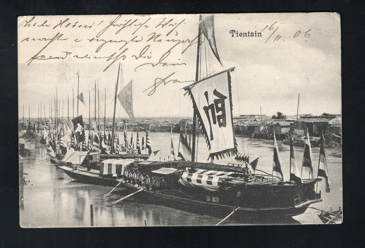646 PC   image1906 Picture Postcard from Tientsin China to Germany, mailed on NOV.17.1906 (double ring cancels tie two pairs of 1c KEVII stamps) to Bergdorf Germany, via Shanghai (SHANGHAI / B.P.O. NOV.26 transit), endorsed “via Vancouver”. The picture side shows a large Chinese ship, captioned “Tientsin”. Corner creases, else fine. (Scan 1) (Scan 2) (All Scans) (All Images)