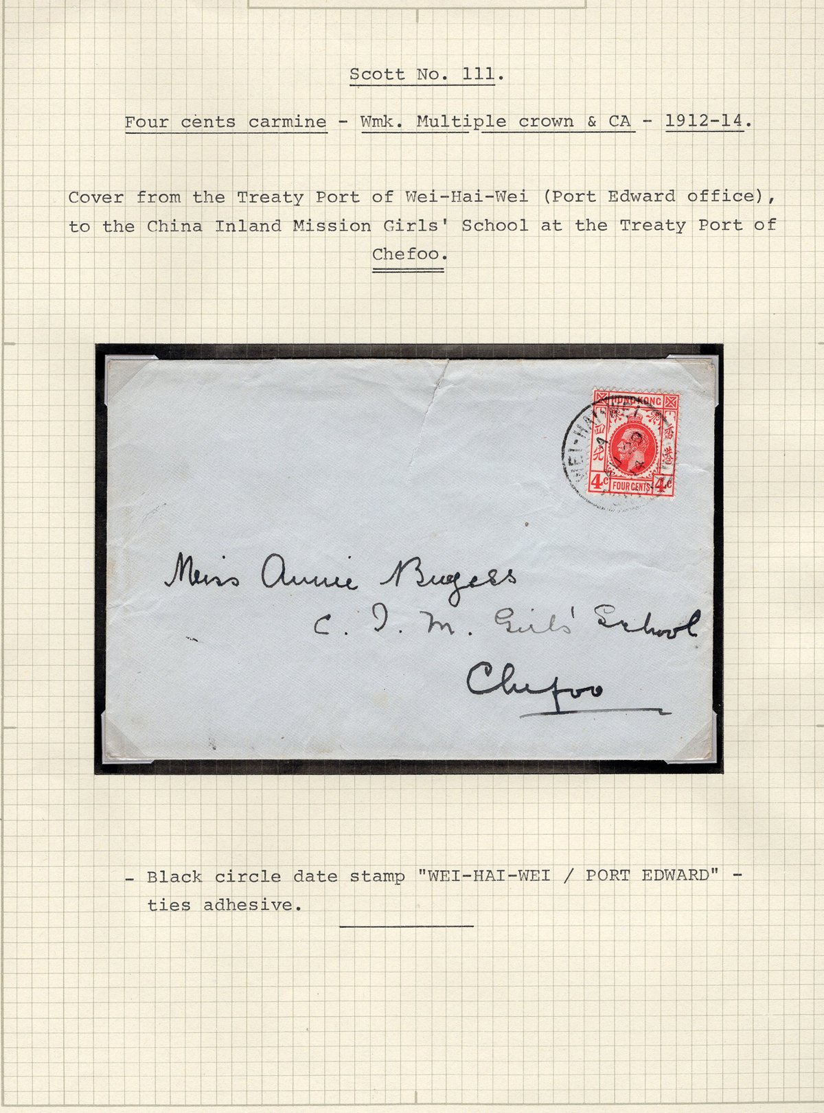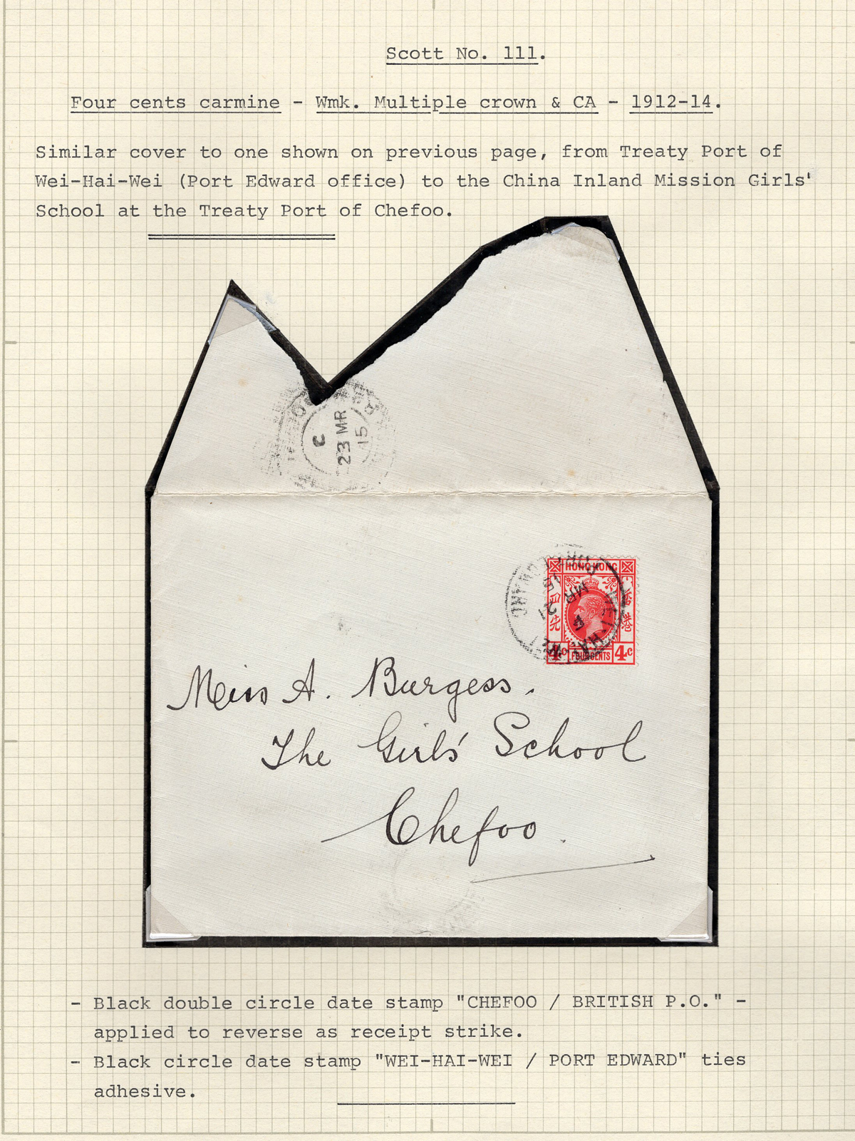 647 O/CVR   image1914 Cover from Wei-Hai-Wei China to Chefoo China, mailed on AUG.29.1914 (WEI-HAI-WEI / PORT EDWARD c.d.s. ties 4c KGV Hong Kong stamp) to a Girl’s School in Chefoo. Tear at top and on back flap, else fine. Accompanied by three stamps canceled with the same c.d.s. (a 10c KEVII and a piece with a 50c on 28c purple QV surcharge and a 50c green China stamp). (Scan 1) (Scan 2) (All Scans) (All Images)