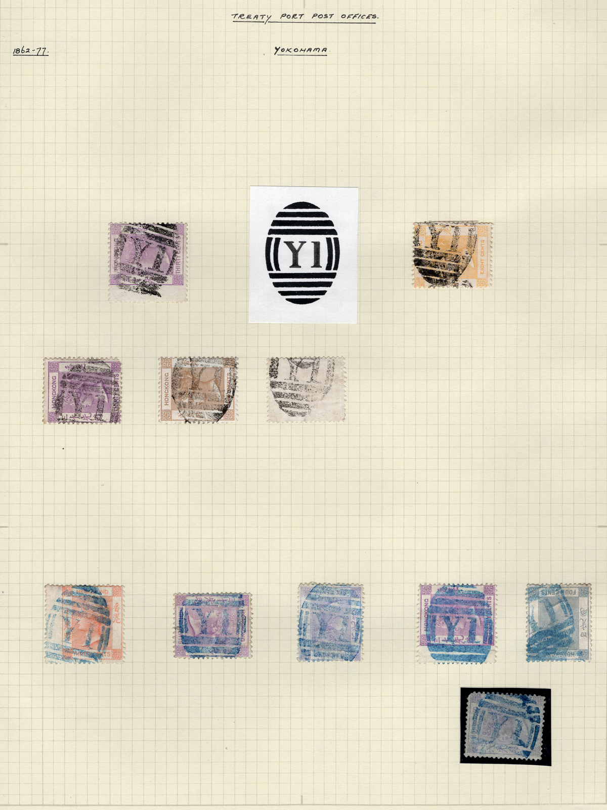 649 O   image1862-77 Yokohama “Y1” Cancels on Eleven Queen Victoria Hong Kong Issues, includes 6 in blue and the rest in black, all very nice strikes on a variety of different values. Scott catalogue value (not counting two faulty stamps) is $311, SG £278.