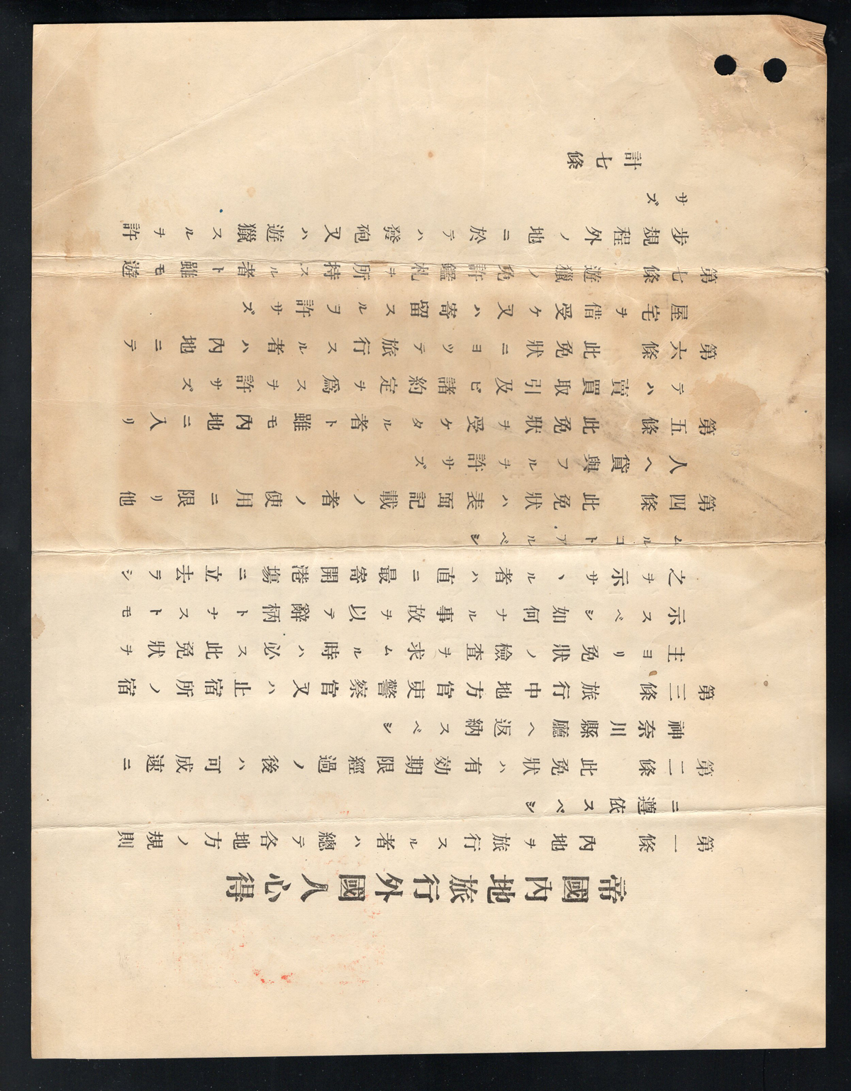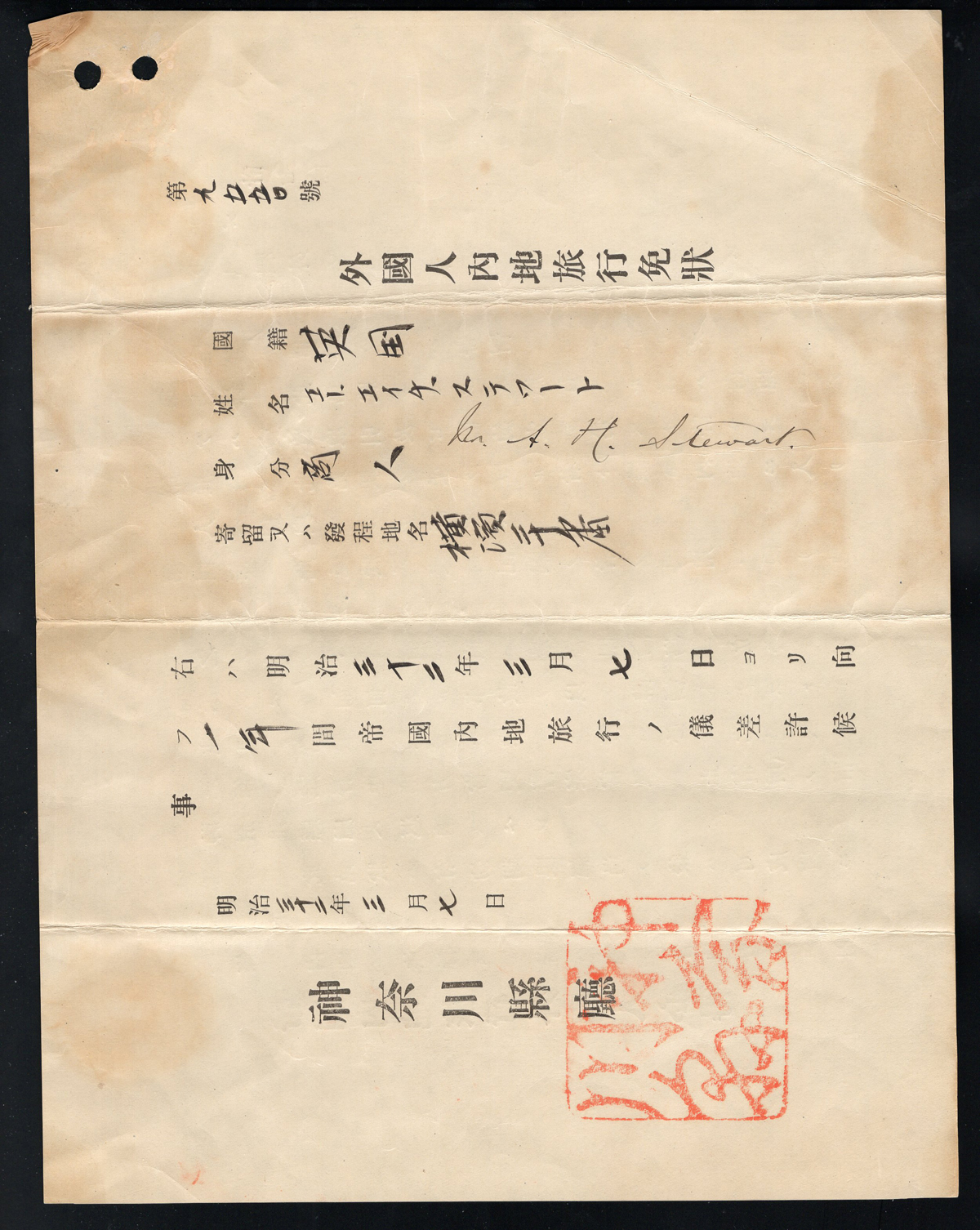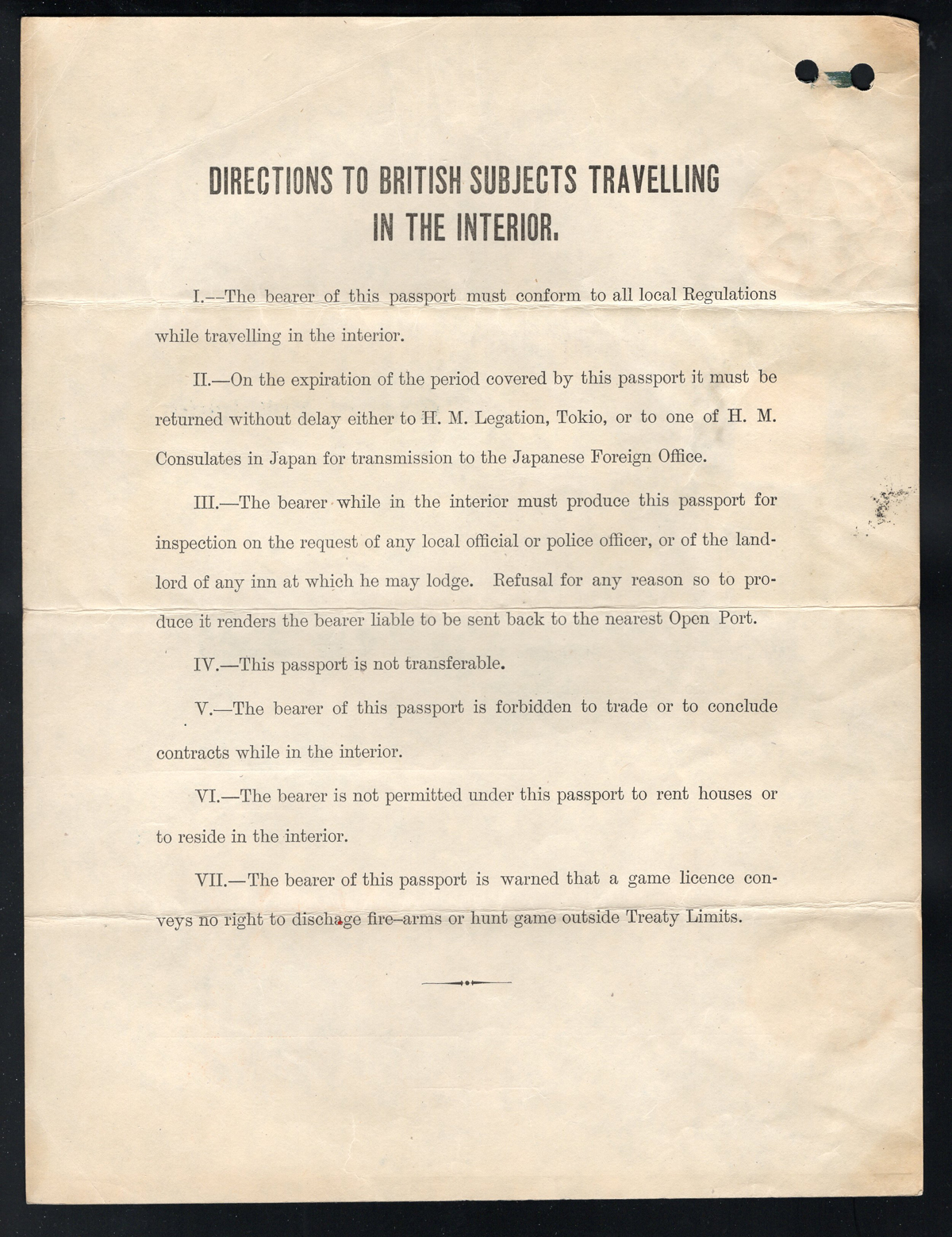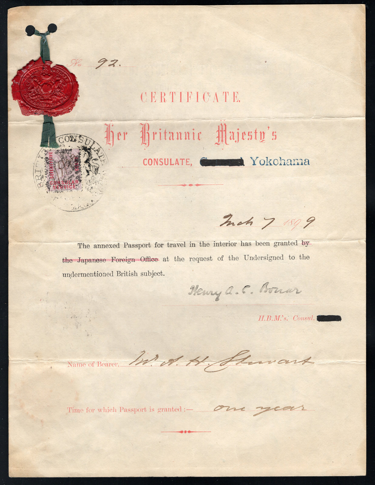 650   image1899 Yokohama Consulate Travel Passport, a folded 4-page document franked with a purple Queen Victoria fiscal stamp (Barefoot #56) overprinted in red “SEVENTY FIVE / CENTS / CONSULAR / SERVICE” with a large British Consulate crowned handstamp. The document was prepared for a British subject traveling in the interior of China and was valid for one year. Elaborate wax seal in red, very fine and scarce. (Scan 1) (Scan 2) (Scan 3) (Scan 4) (All Scans) (All Images)