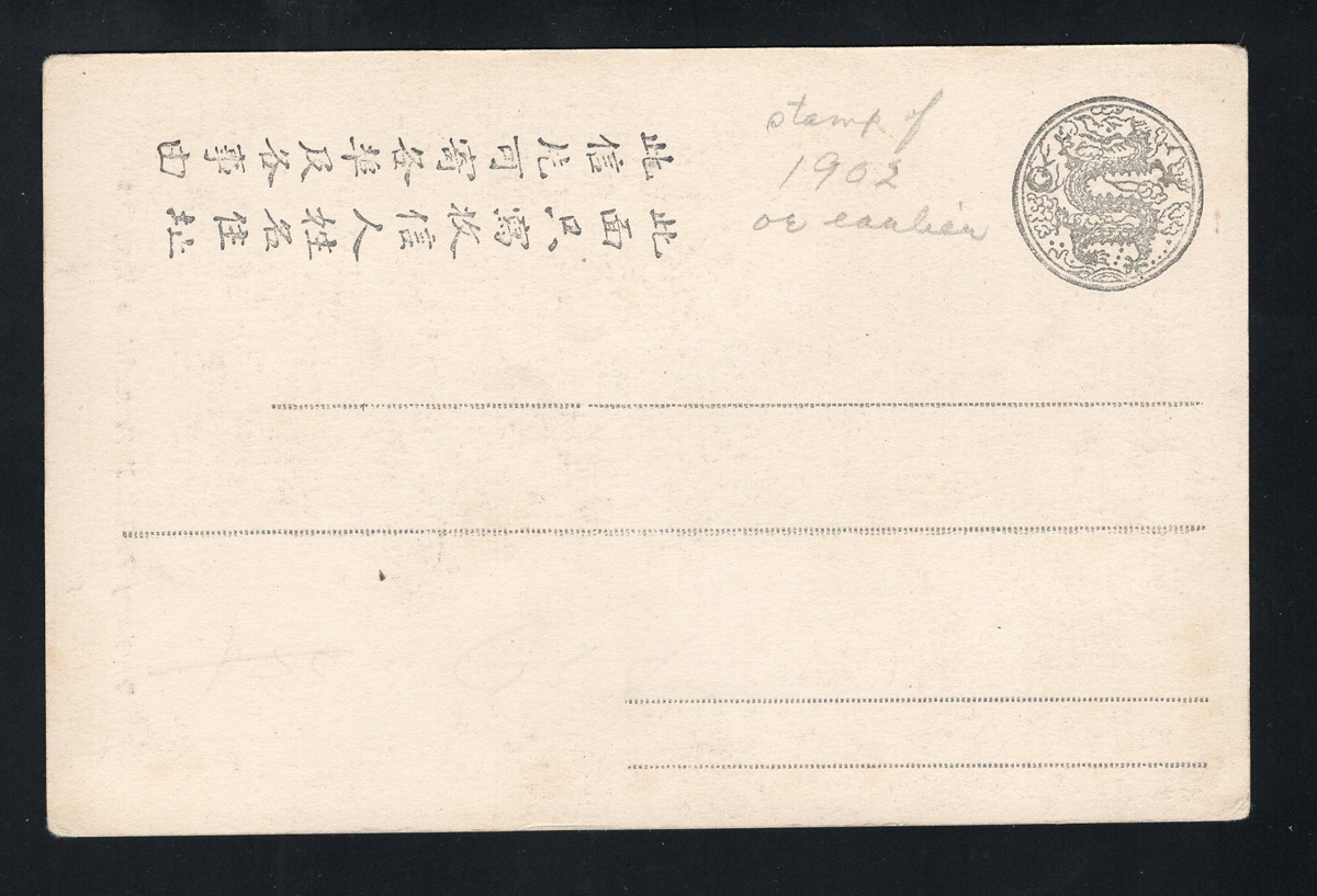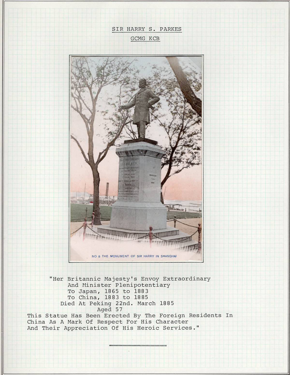 651 PC   imageEarly Unused Postcard of "Sir Harry Parkes' Memorial in Shanghai", with Chinese characters reading "Bronze Statue in Huangpu Beach, Shanghai", also depicting a 2c Hong Kong stamp. Message side has a dragon imprint (stamp?) and the usual "This side only for the name and address", etc. Very fine and mounted on a page with an elaborate write-up on Sir Harry Parkes. (Scan 1) (Scan 2) (All Scans) (All Images)