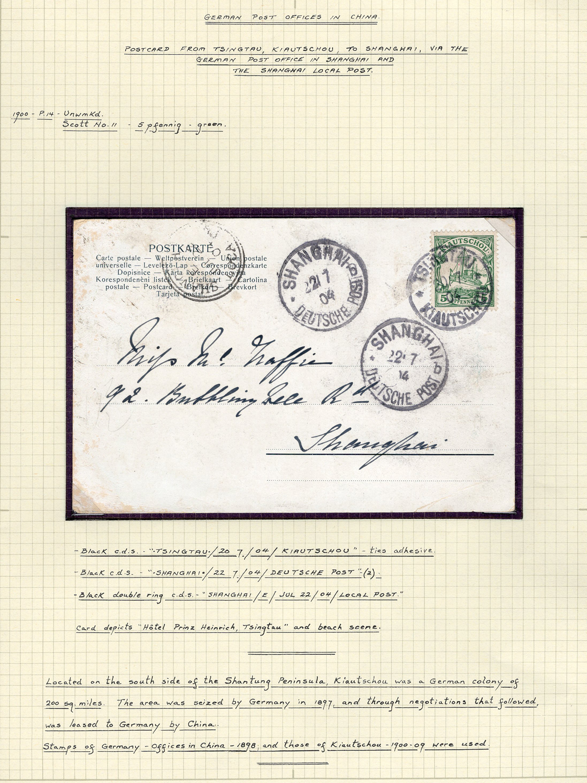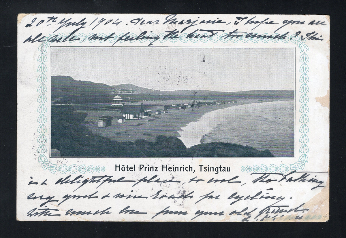 652 PC   image1904 Picture Postcard from Tsingtau, Kiautschou to Shanghai, China, via the German Post Office in Shanghai and the Shanghai local post. Mailed JUL.20.1904 and franked with a 5pf green Kiautschou issue, to Shanghai, with two "Shanghai / Deutsche Post" c.d.s. dated JUL.22 and a partial Shanghai Local Post JUL.22 receiver. The picture side shows the "Hotel Prinz Heinrich, Tsingtau". Light edge faults, else fine and scarce. (Scan 1) (Scan 2) (All Scans) (All Images)
