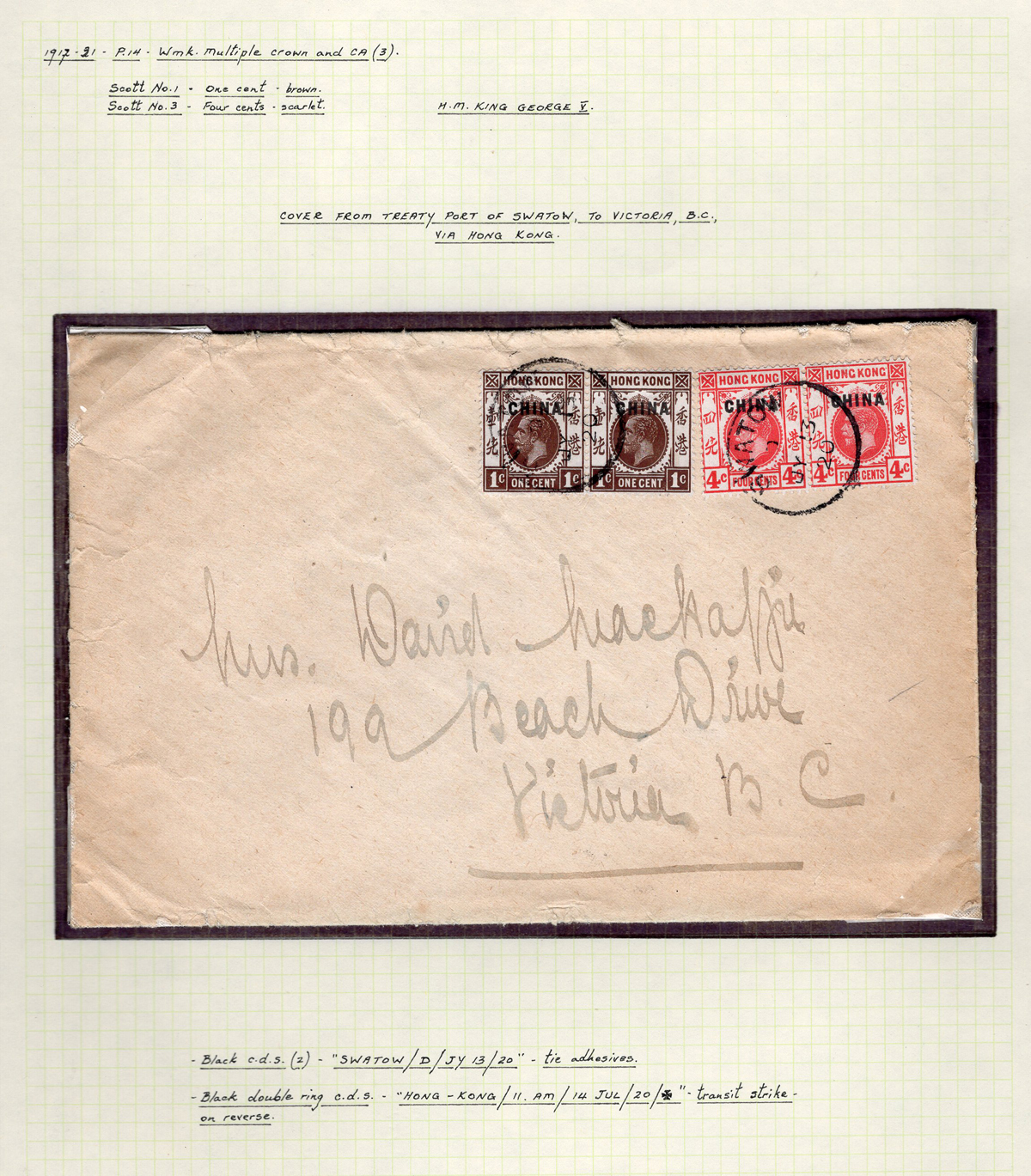 642 CVR   image1920 Swatow, China Cover to British Columbia, Canada, mailed on JUL.13.1920 (two Swatow c.d.s. tie a 1c and a 4c pair KGV CHINA overprints) to Victoria, BC, via Hong Kong (JUL.14.1920 double circle transit on back), fine. (Scan 1) (Scan 2) (All Scans) (All Images)