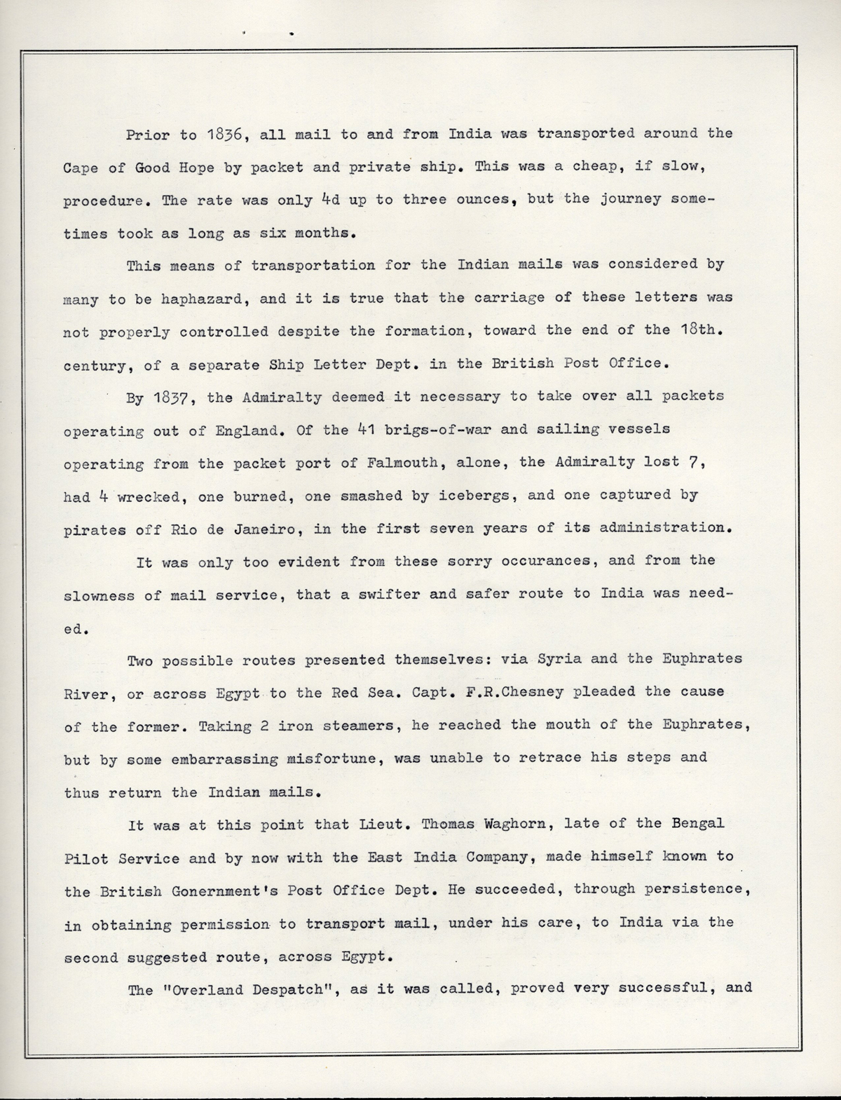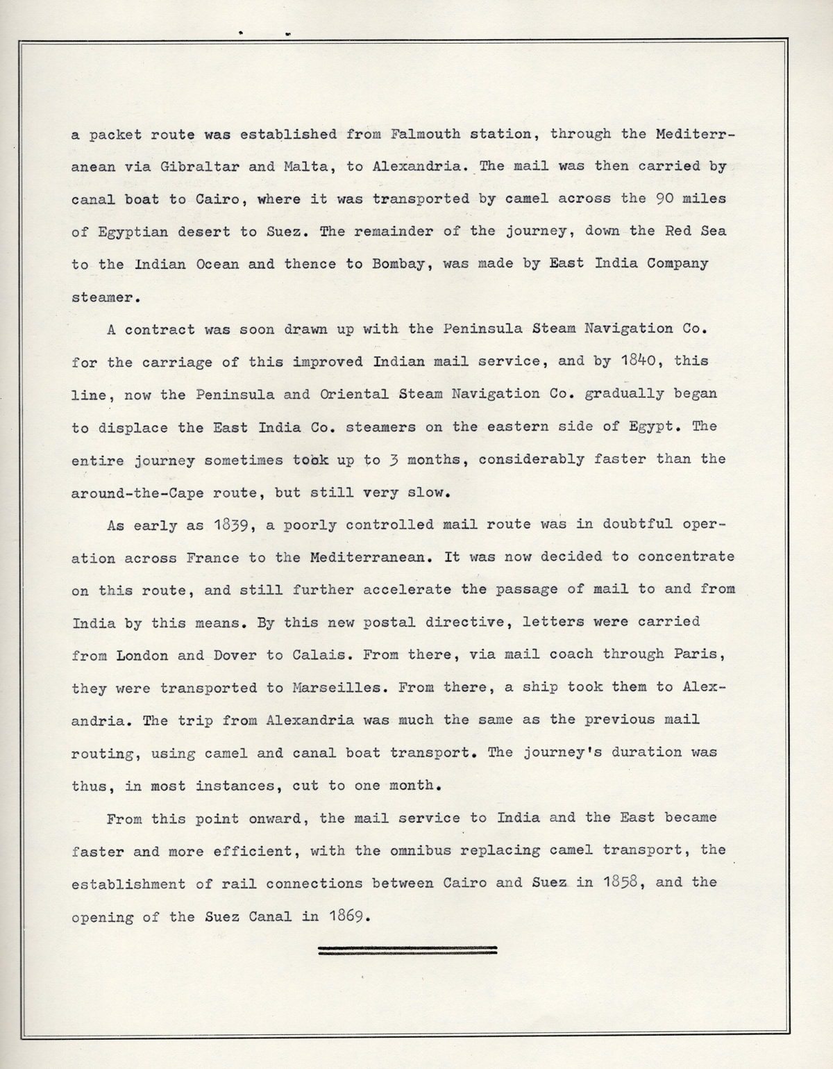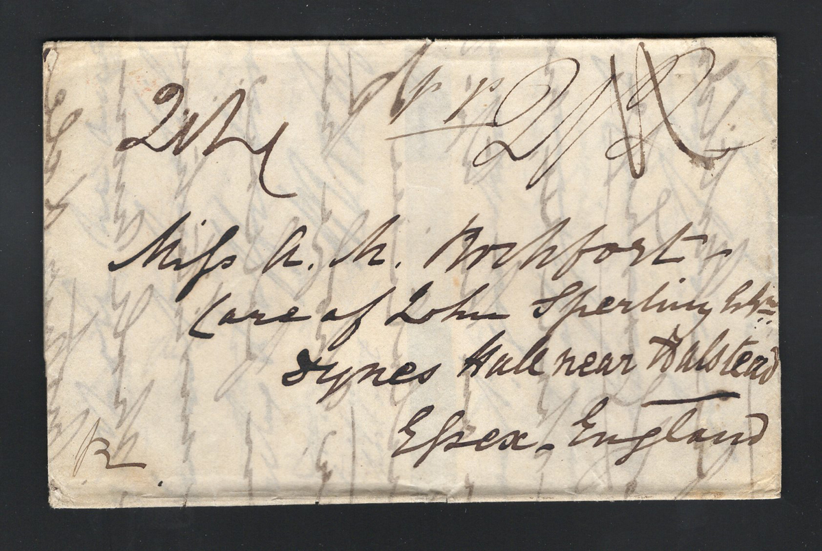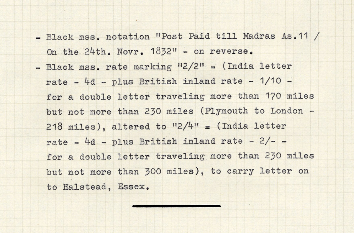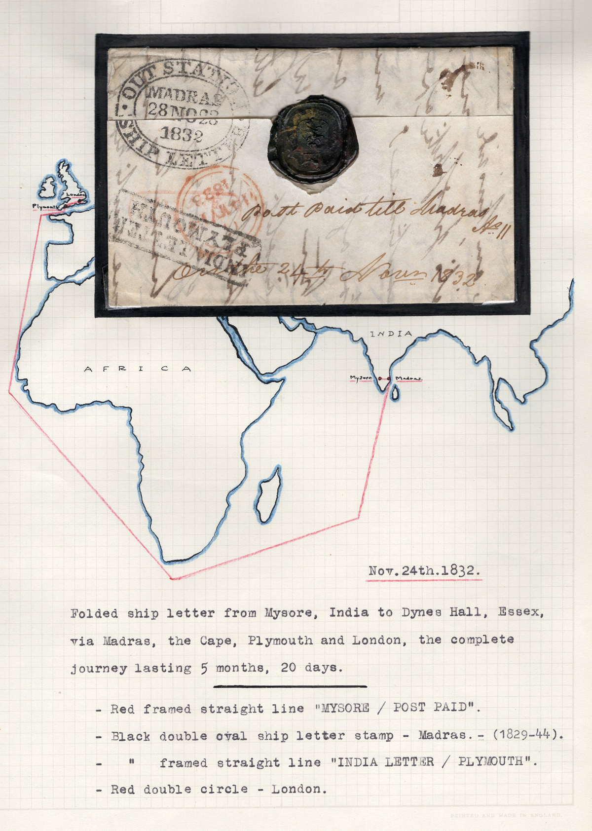 654 CVR   image1832 Folded Letter from India to England, mailed from Mysore, India on NOV.24.1832 (docketing) to Essex, via Madras (NOV.28.1832 large double circle oval “OUT STATION / MADRAS / SHIP LETTER”, with boxed "INDIA LETTER / PLYMOUTH” handstamp and a MAY.14.1832 double circle London transit. Endorsed “Post paid till Madras / No. 11” and manuscript rated 2/2, modified to 2/4, very fine. Displayed and written-up on two album pages with a hand-drawn map showing its travel south around the South African cape, which took 5 months and 20 days. (Scan 1) (Scan 2) (Scan 3) (All Scans) (All Images)