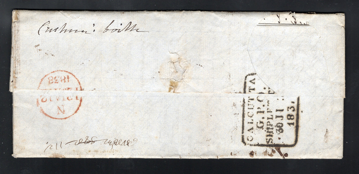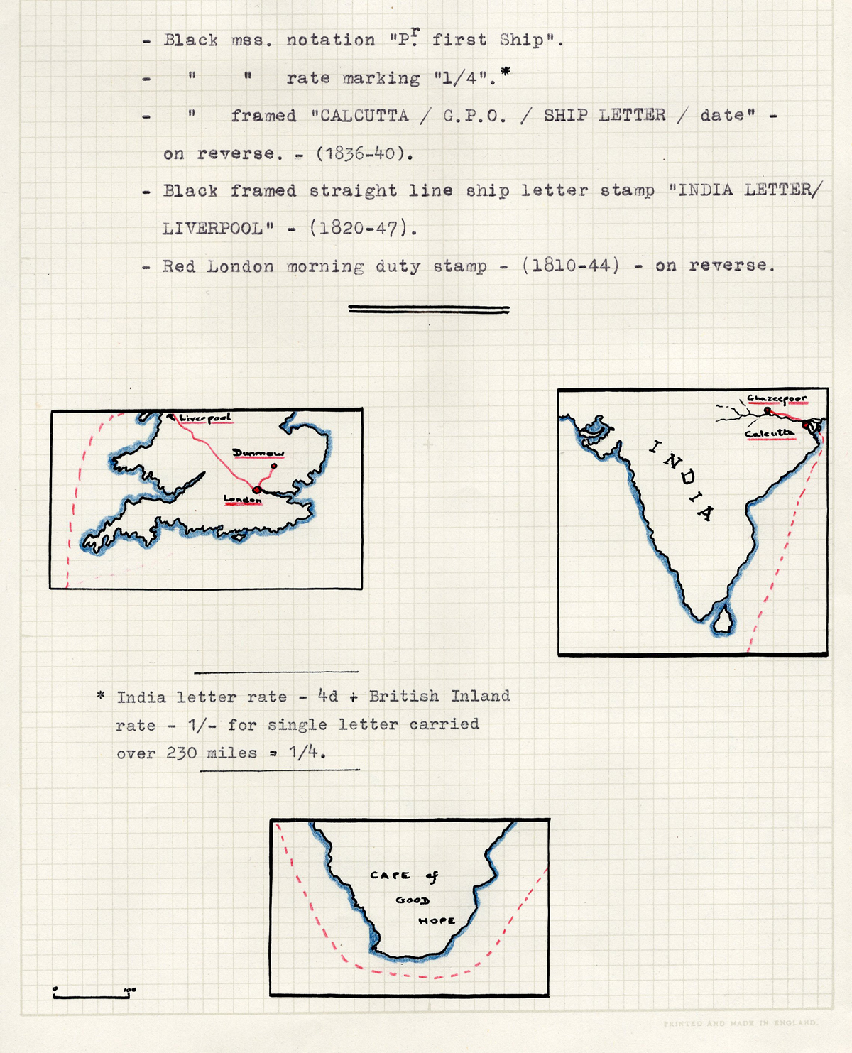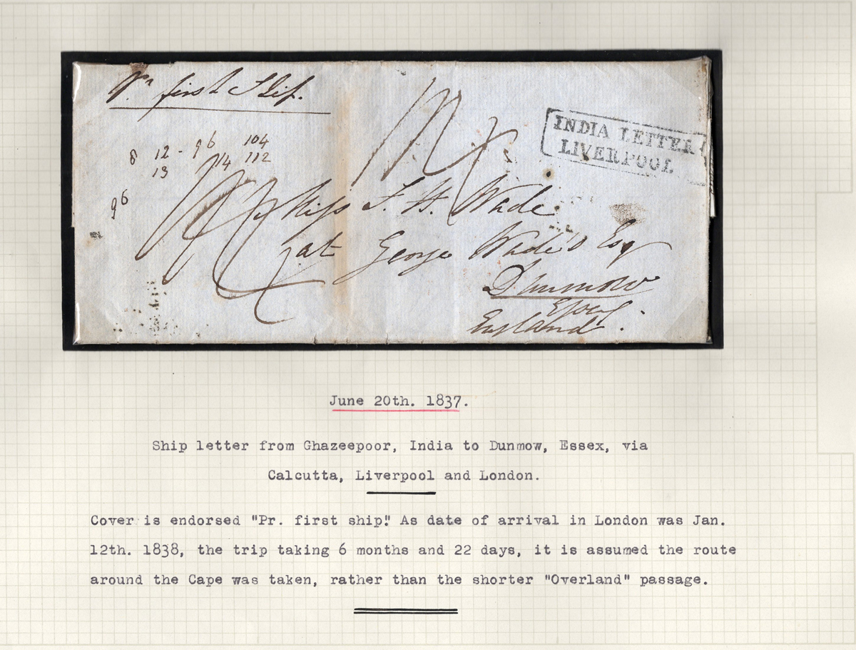 655 CVR   image1837 Folded Letter from India to England, mailed from Ghazeepoor, India on JUN.20.1837 (dateline inside) to Dunmow, with boxed “INDIA LETTER / LIVERPOOL”, boxed “CALCUTTA / G.P.O. / SHIP LETTER / 30 JU / 1837” and JAN.12.1838 London receiver in red, making for a 6 month and 22 day trip. Written-up in great detail on 4 pages, including three hand-drawn maps showing the route (down from India to South Africa and back up to Europe), assuming this was the route taken, based on the long time it took. Long, cross-written letter inside, missing a small piece of the back, still very fine. (Scan 1) (Scan 2) (Scan 3) (Scan 4) (Scan 5) (All Scans) (All Images)