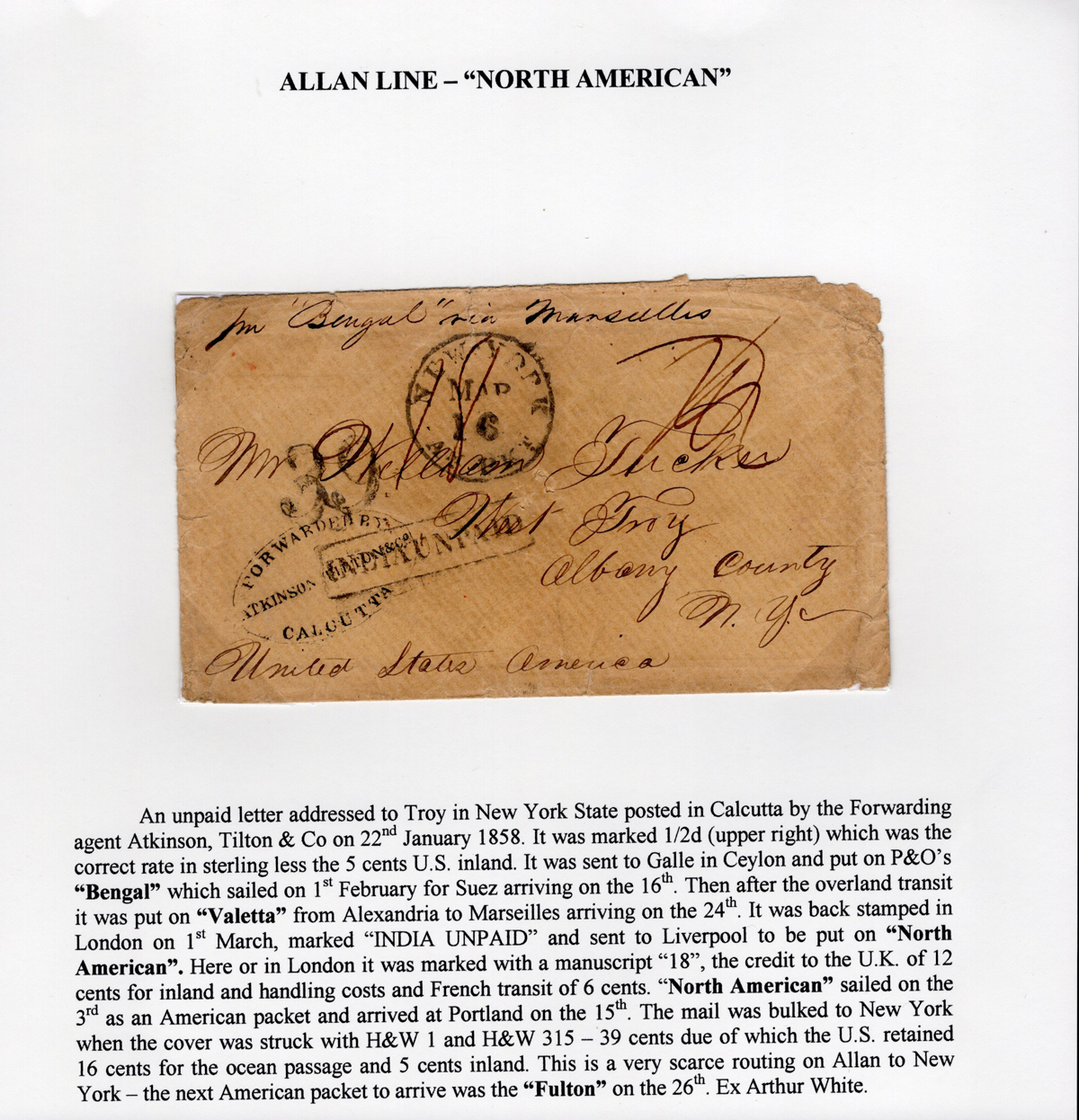 657 CVR   image1858 Cover from India to the United States, mailed from Calcutta by the forwarding agent “Atkinson, Tilton & Co.” and is addressed to Troy, New York (NEW YORK / Am PKT / MAR.16 receiver on front) via London (red transit on back) where it received a boxed “INDIA UNPAID”, endorsed “per Brindisi and Marseilles”. Mounted on a page detailing its voyage, which passed through Ceylon, ship Bengal, Suez, ship Valetta, Alexandria, Marseilles onto the ship North American, and so on. Edge faults, else a well travelled cover. Ex Arthur White.