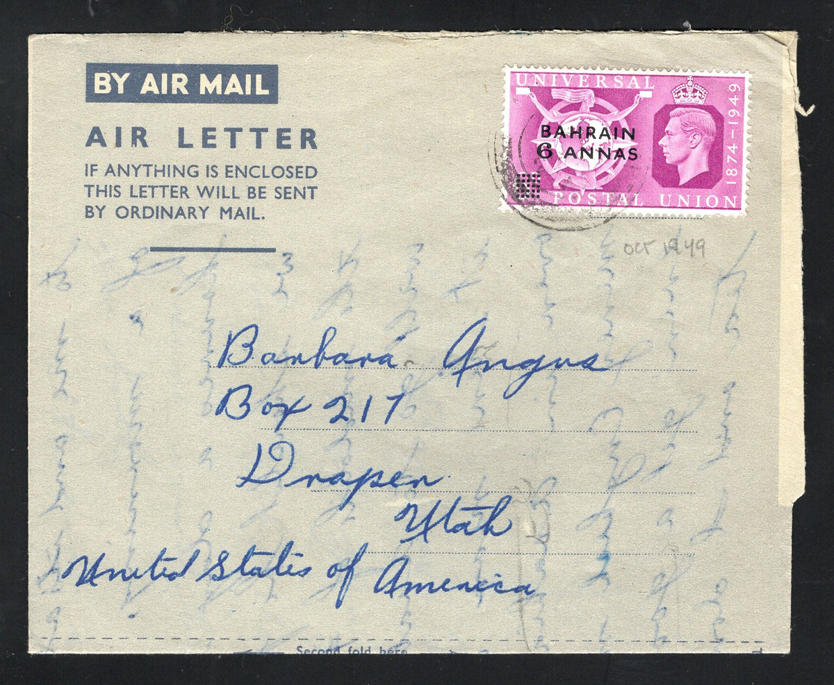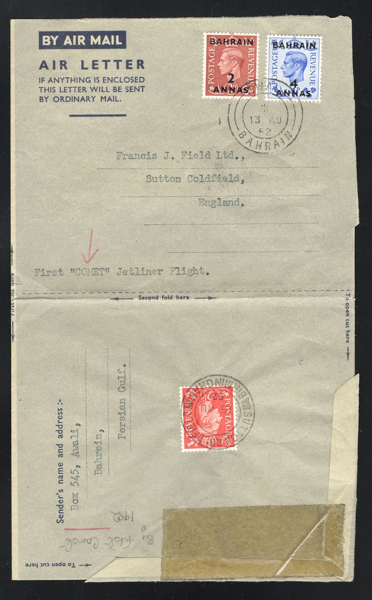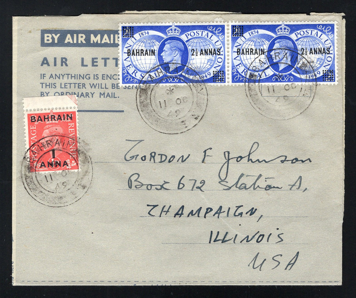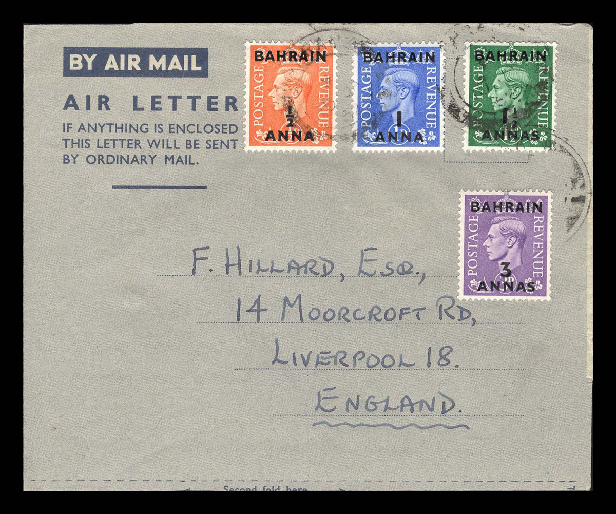 696 CVR Bahrain imageGroup of 4 KGVI Air Letters Mailed from Bahrain, OCT.20.1949 to United States, OCT.11.1949 to United States, AUG.13.1952 to England (with additional stamp on back and "by First Comet Jetliner" notation) and APR.9.1952 to United States. Each franked with a variety of Bahrain overprints paying 7 Annas (one with only 6 Annas), very fine. (Scan 1) (Scan 2) (Scan 3) (Scan 4) (All Scans) (All Images)