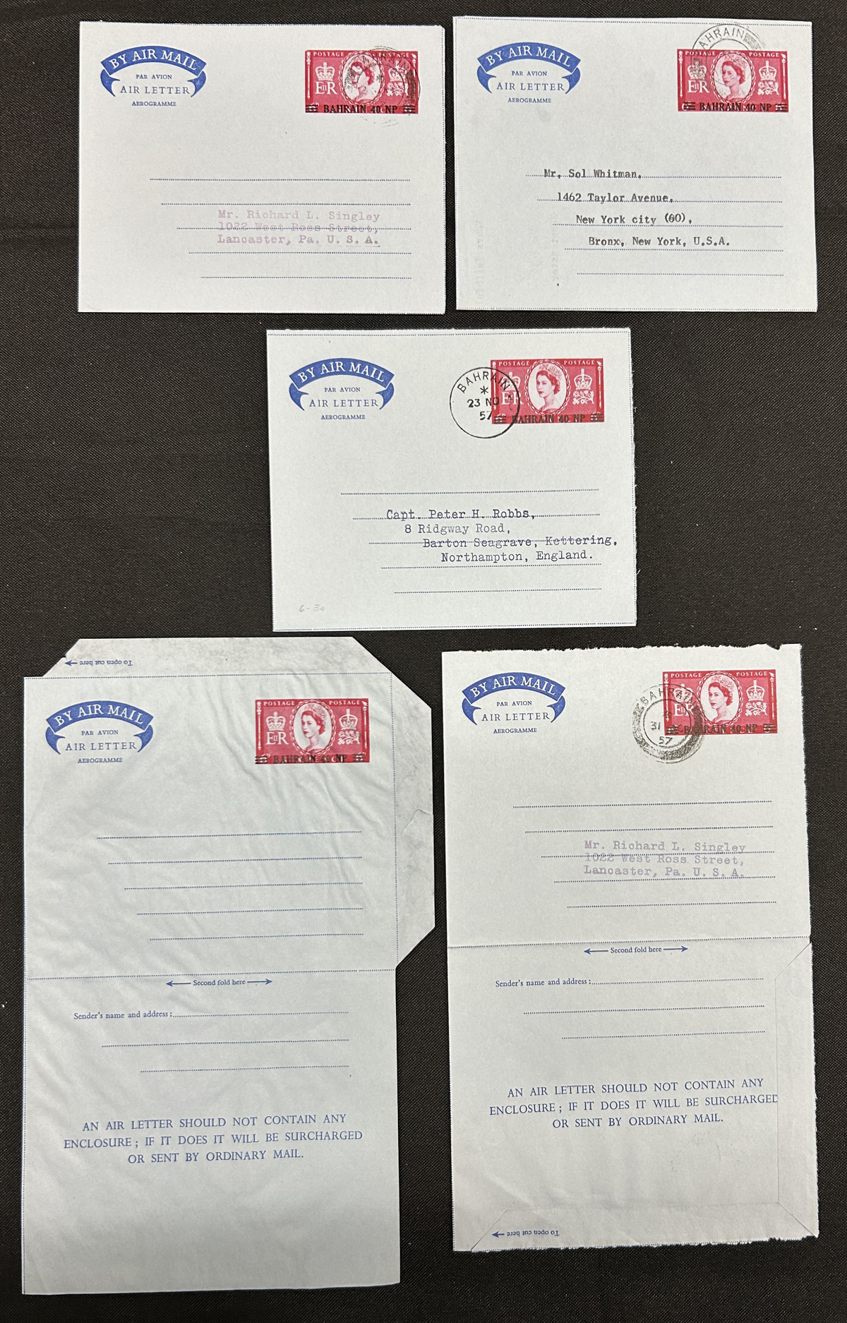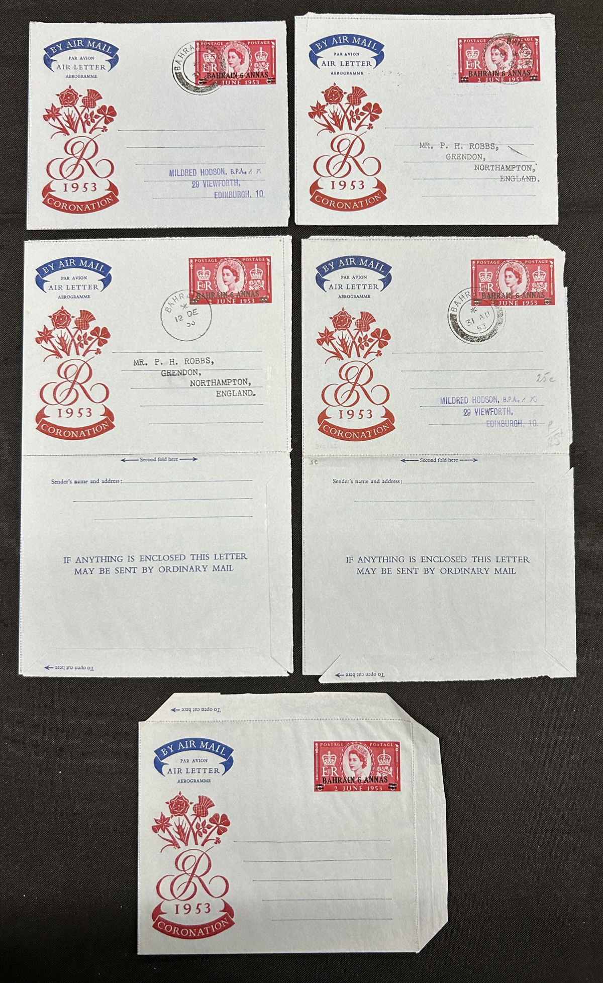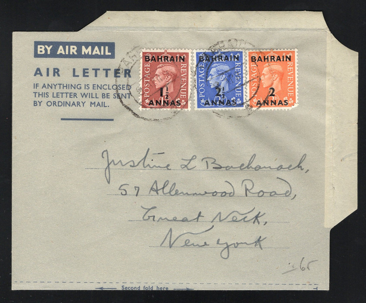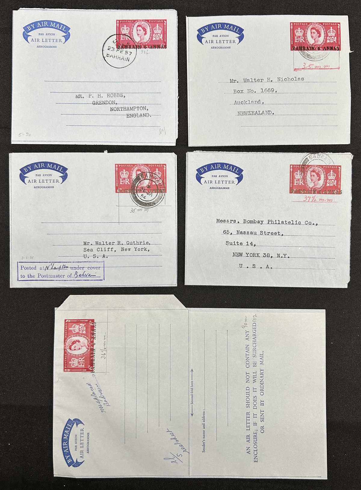 698 CVR Bahrain imageGroup of 5 KGVI Bahrain Air Letters, two were mailed to a collector in New York City (no letter inside), one was mailed to a collector in England (with long letter inside, JAN.16.1952 receiver and Qatar return address), one was mailed to Montréal Canada, and one mailed AUG.15.1842 to England (with R.A.F. Censor 796 handstamp and letter inside). Franked with a variety of Bahrain overprints, a very fine group. (Scan 1) (Scan 2) (Scan 3) (Scan 4) (Scan 5) (All Scans) (All Images)