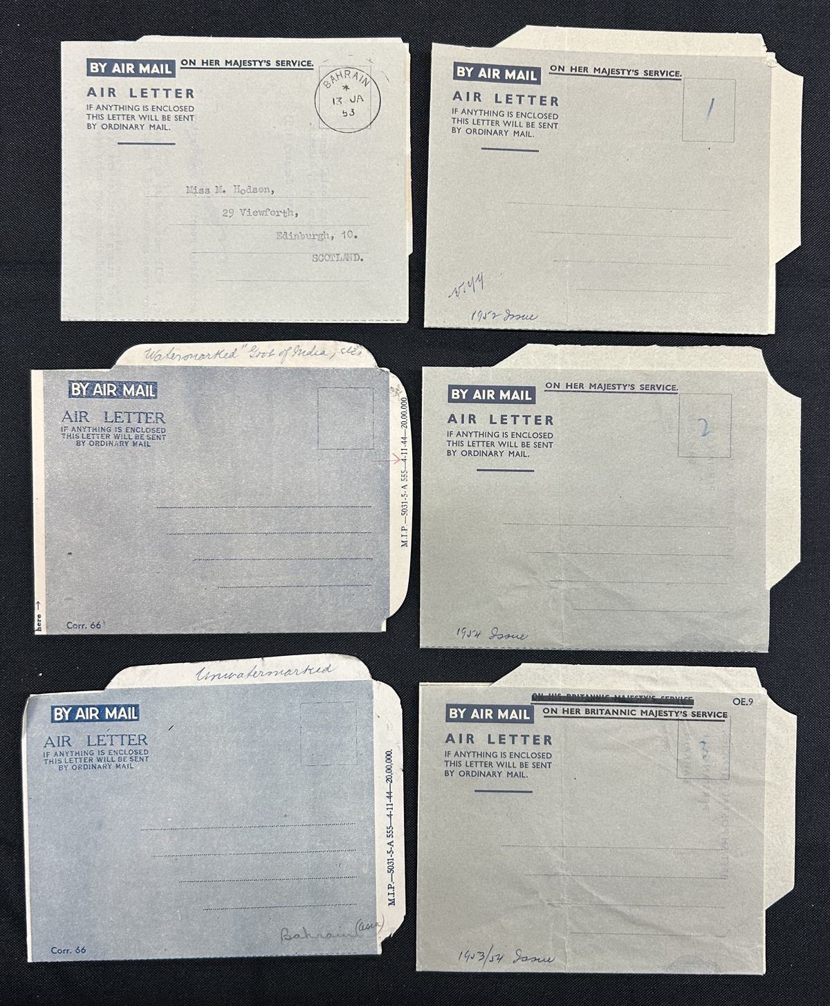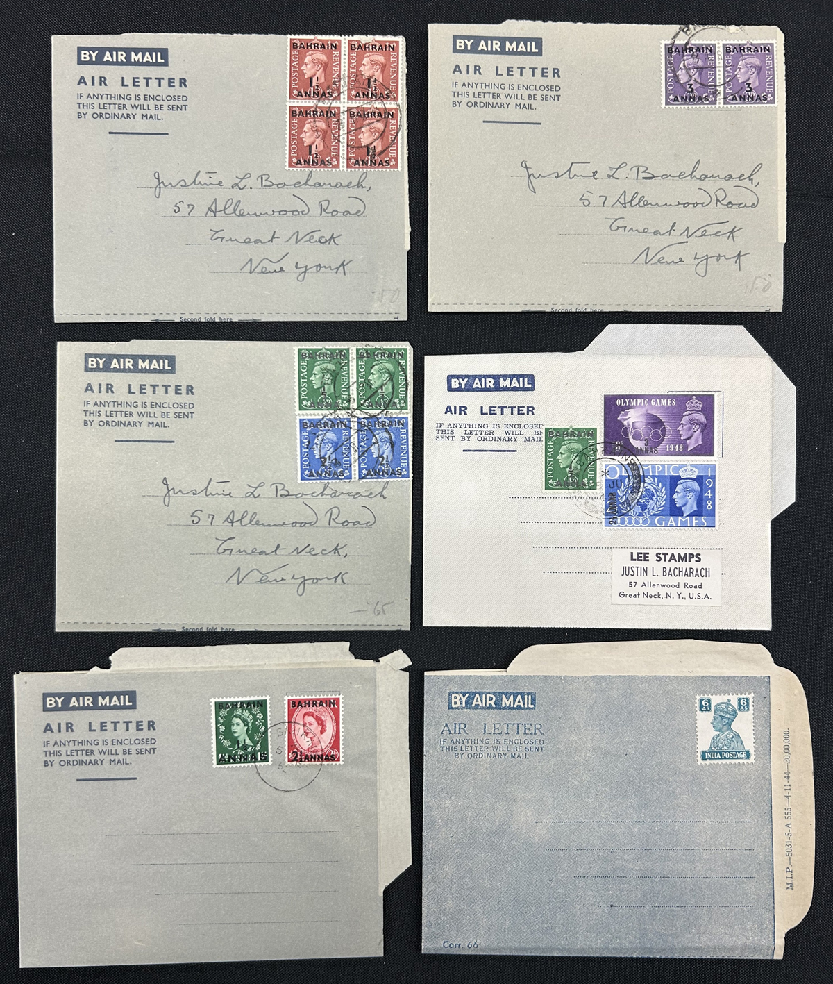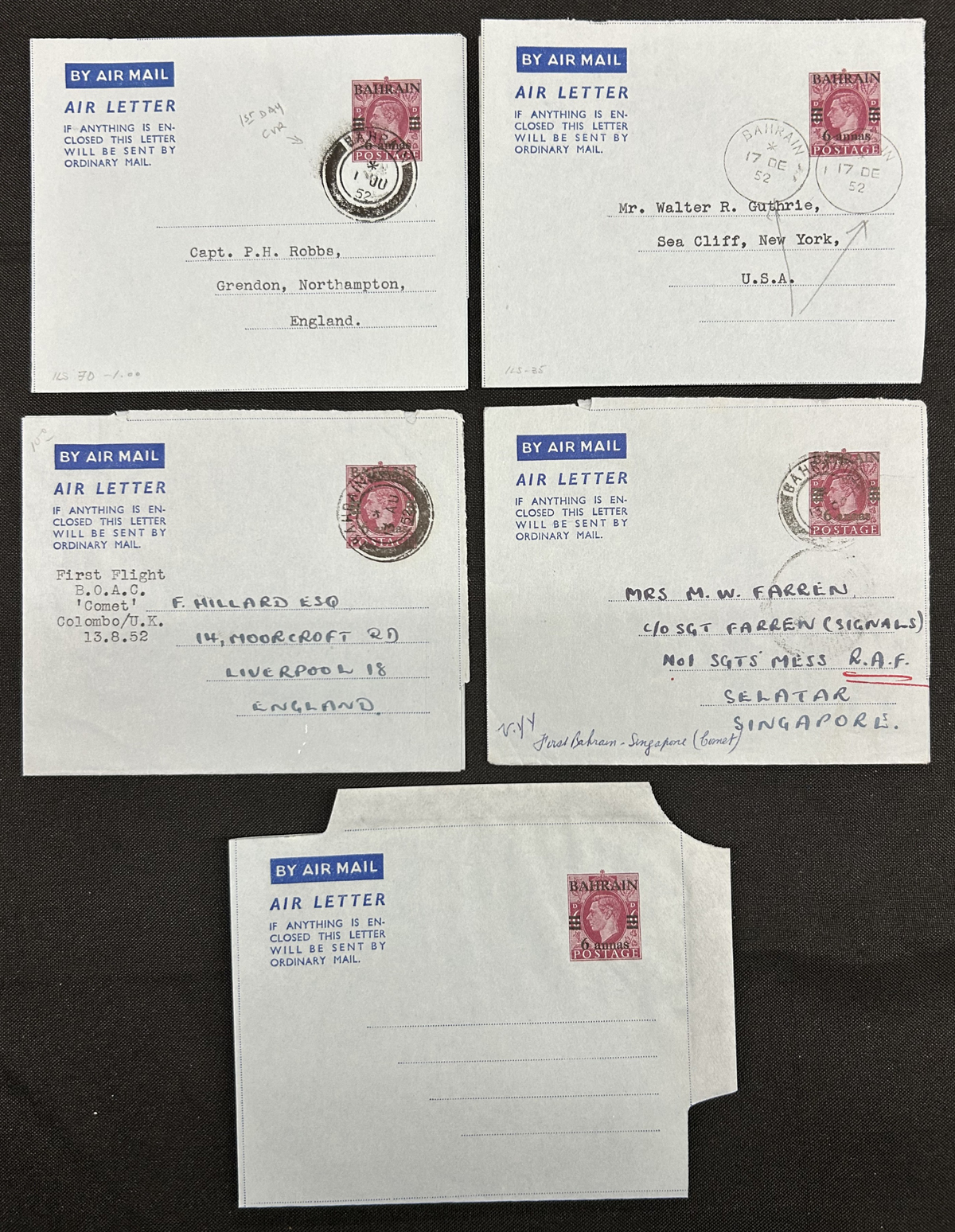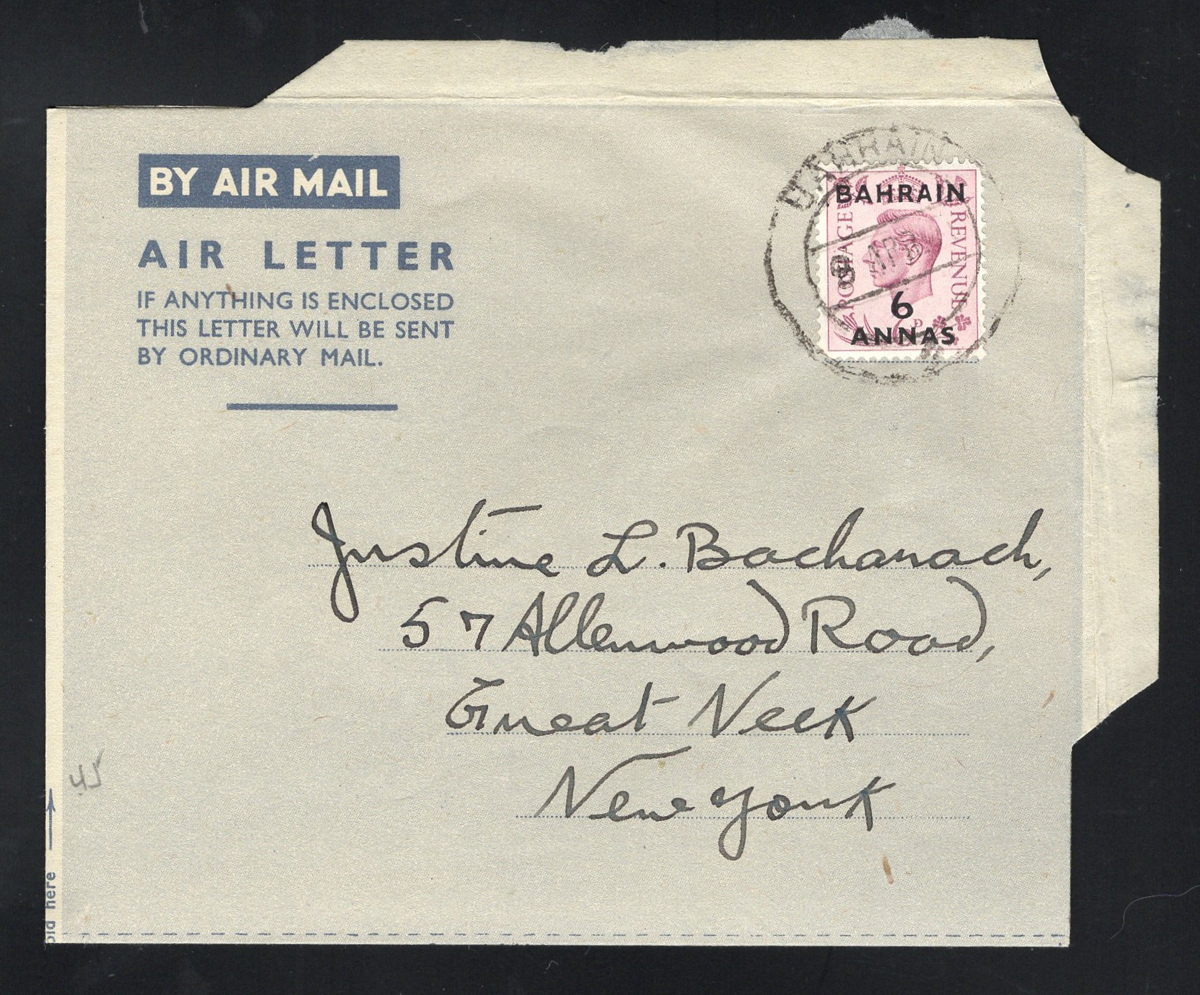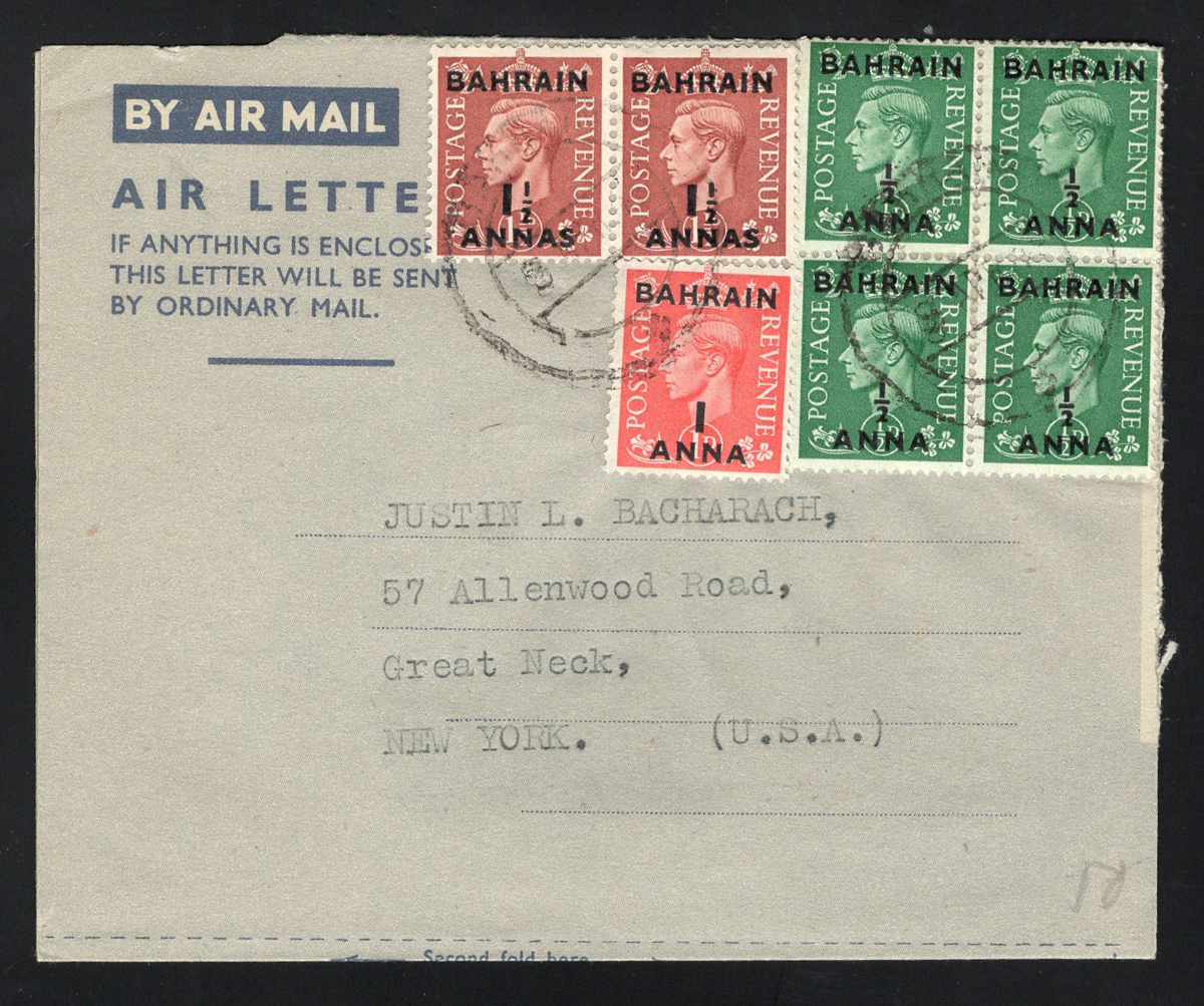 698 CVR Bahrain imageGroup of 5 KGVI Bahrain Air Letters, two were mailed to a collector in New York City (no letter inside), one was mailed to a collector in England (with long letter inside, JAN.16.1952 receiver and Qatar return address), one was mailed to Montréal Canada, and one mailed AUG.15.1842 to England (with R.A.F. Censor 796 handstamp and letter inside). Franked with a variety of Bahrain overprints, a very fine group. (Scan 1) (Scan 2) (Scan 3) (Scan 4) (Scan 5) (All Scans) (All Images)