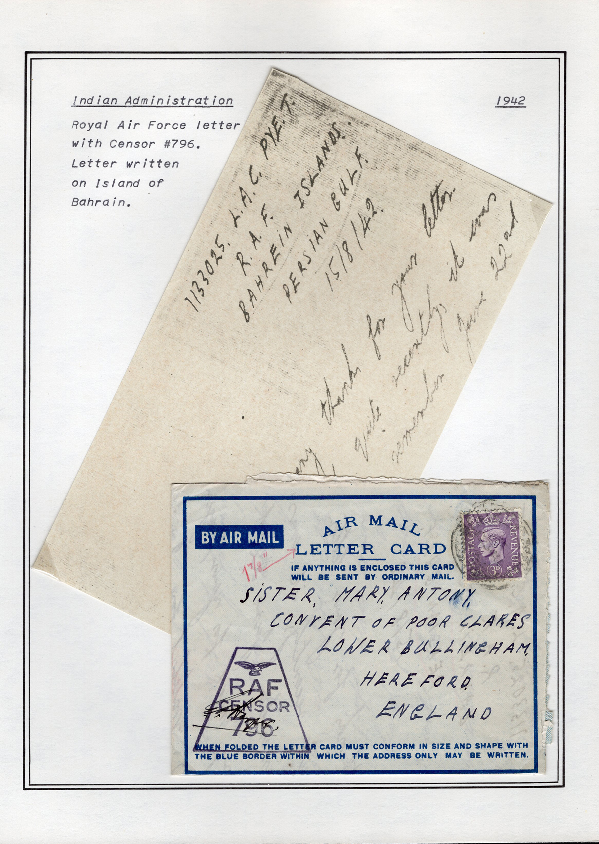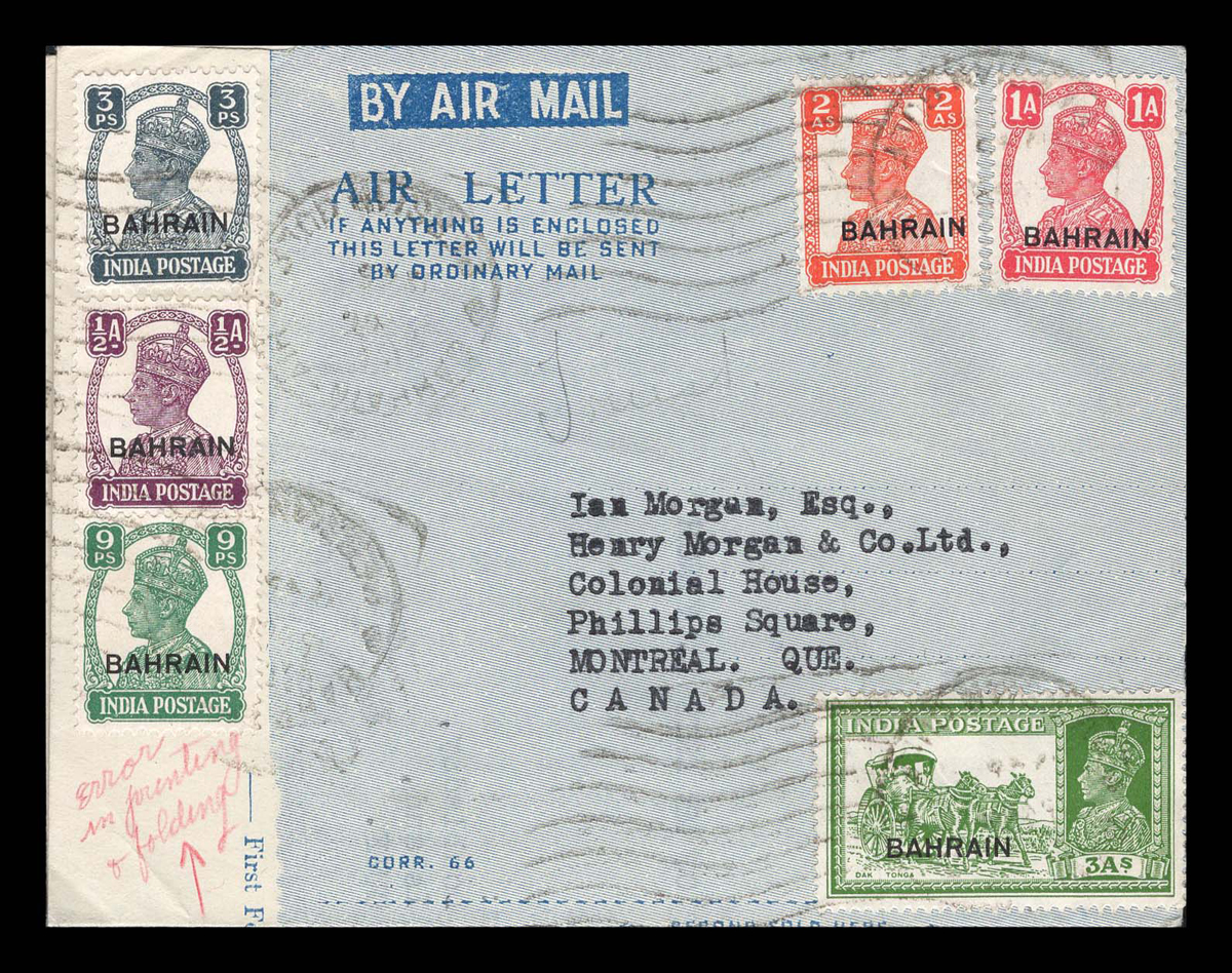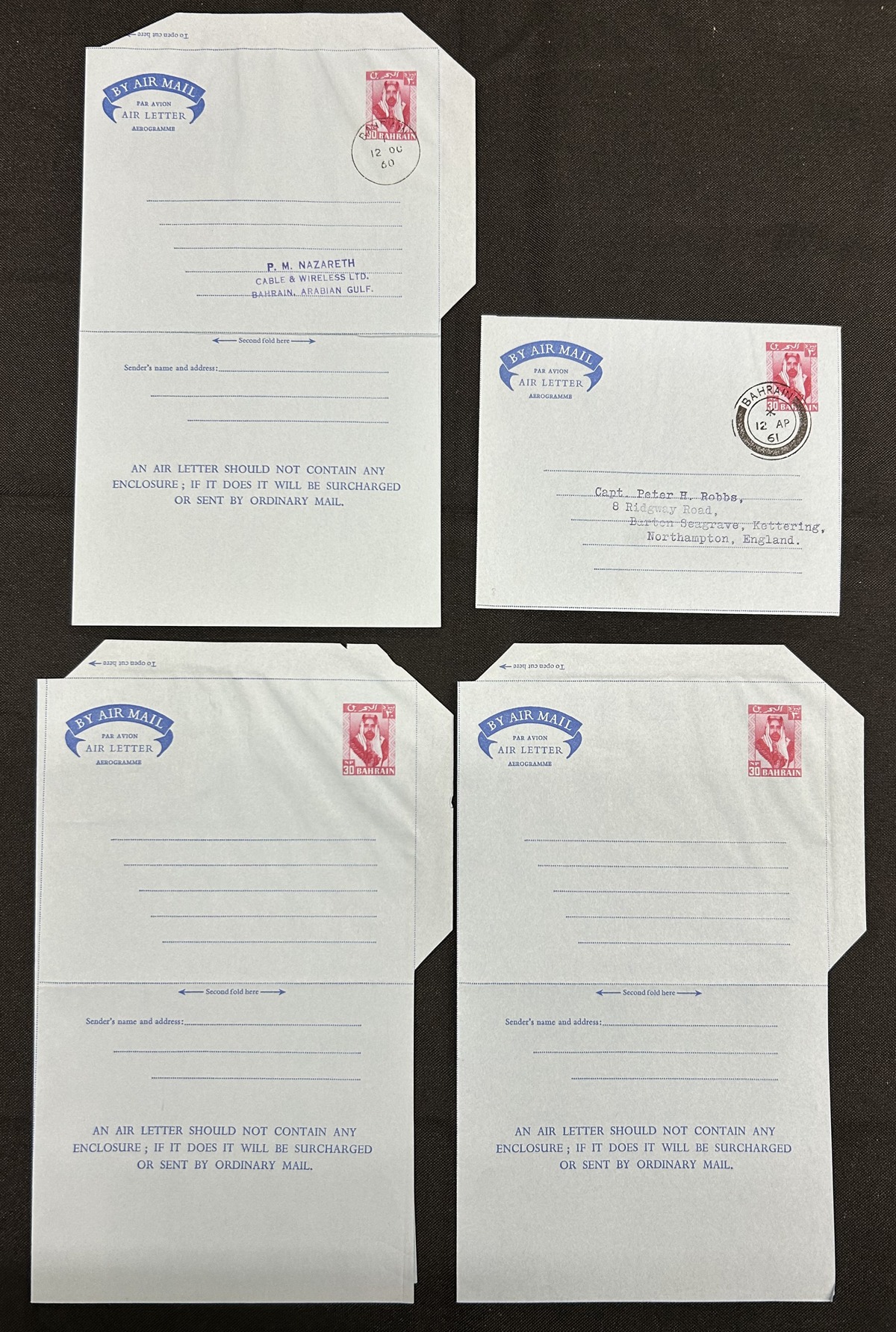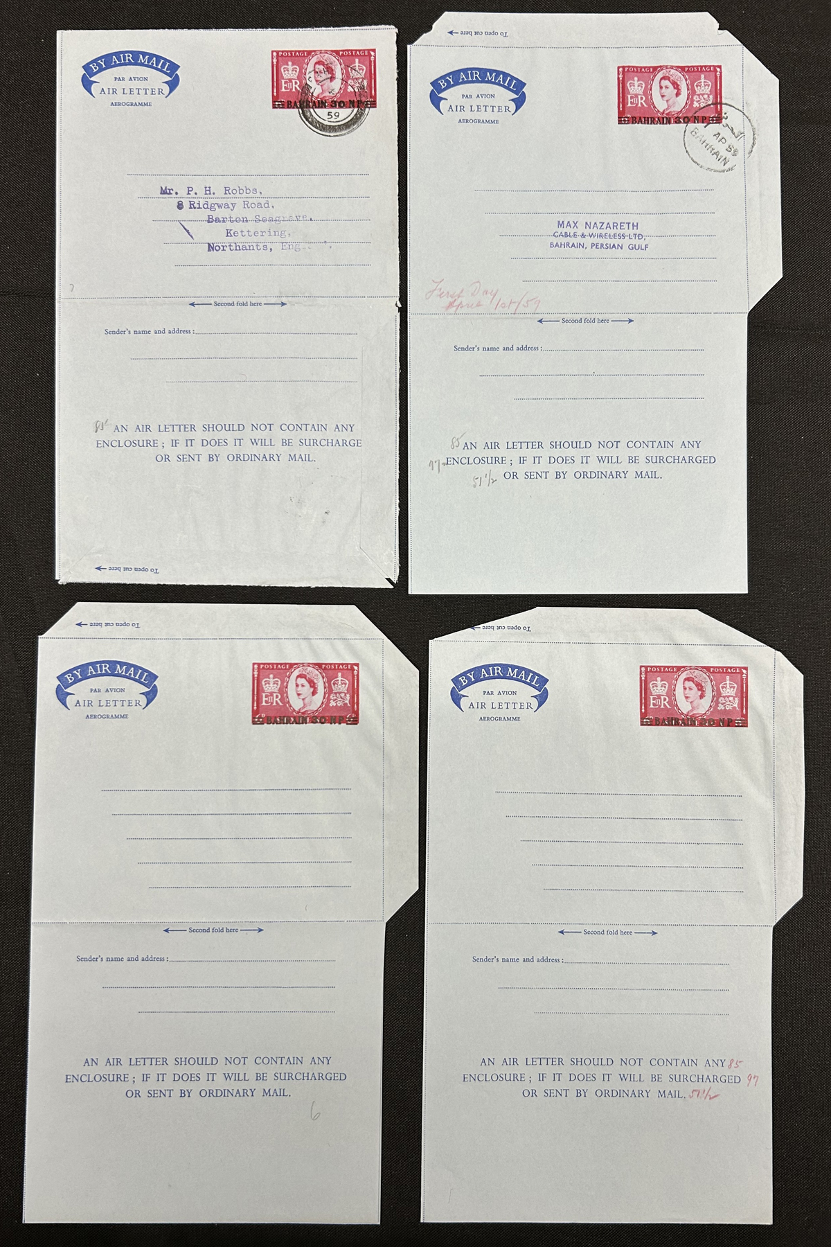 698 CVR Bahrain imageGroup of 5 KGVI Bahrain Air Letters, two were mailed to a collector in New York City (no letter inside), one was mailed to a collector in England (with long letter inside, JAN.16.1952 receiver and Qatar return address), one was mailed to Montréal Canada, and one mailed AUG.15.1842 to England (with R.A.F. Censor 796 handstamp and letter inside). Franked with a variety of Bahrain overprints, a very fine group. (Scan 1) (Scan 2) (Scan 3) (Scan 4) (Scan 5) (All Scans) (All Images)