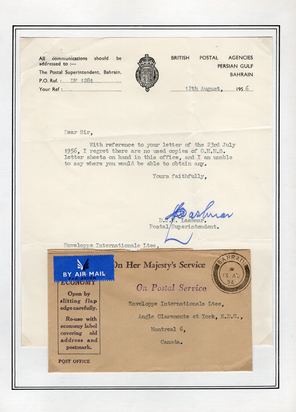 697 CVR Bahrain image1956 Bahrain O.H.M.S. Free-Frank Airmail Cover to Canada, mailed from the British Postal Agencies / Persian Gulf / Bahrain to Montréal, Canada in an O.H.M.S. Post office envelope, still containing a letter from the Postal Superintendent to an enveloppe company who was inquiring about obtaining O.H.M.S. letter sheets. Very fine.