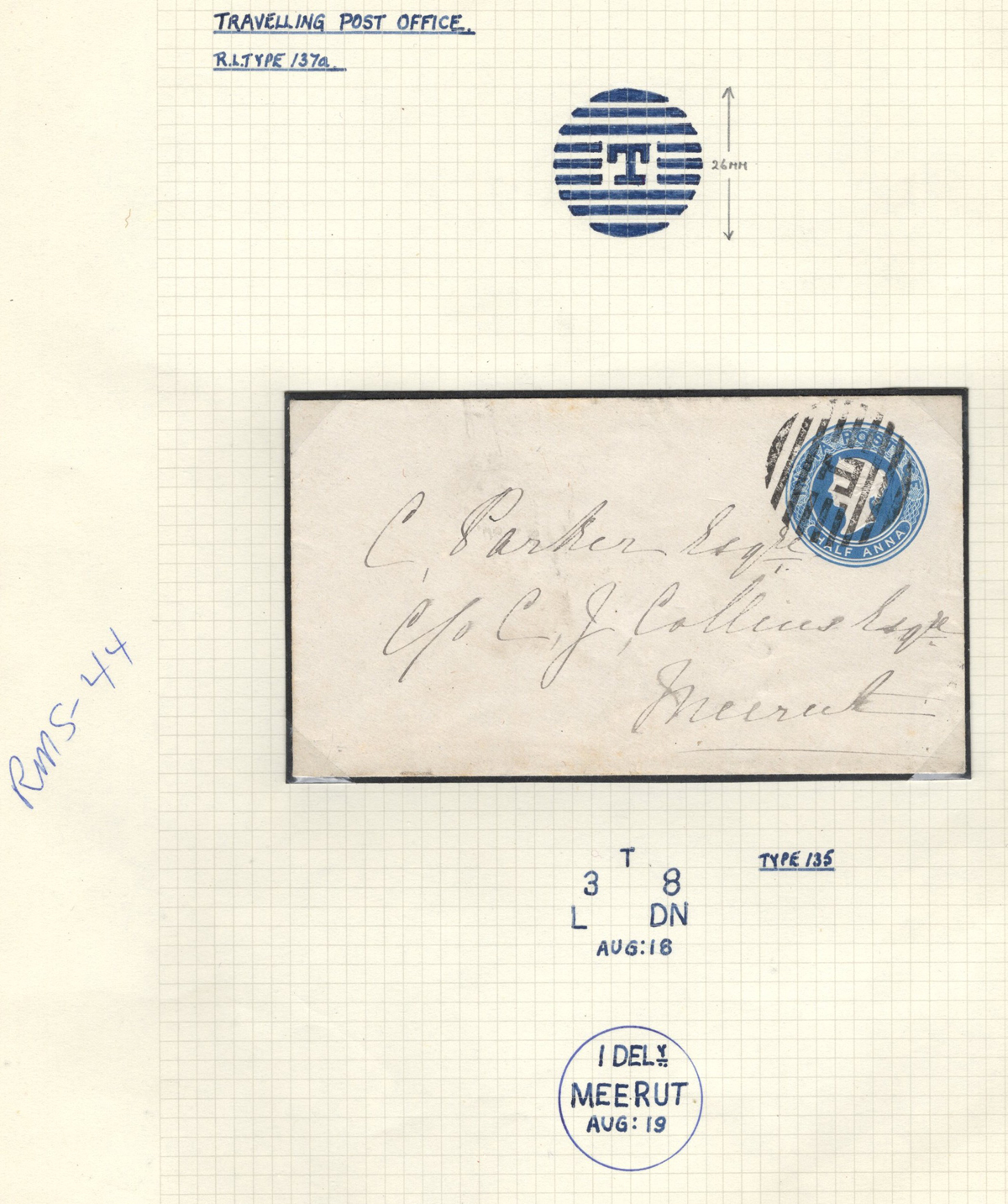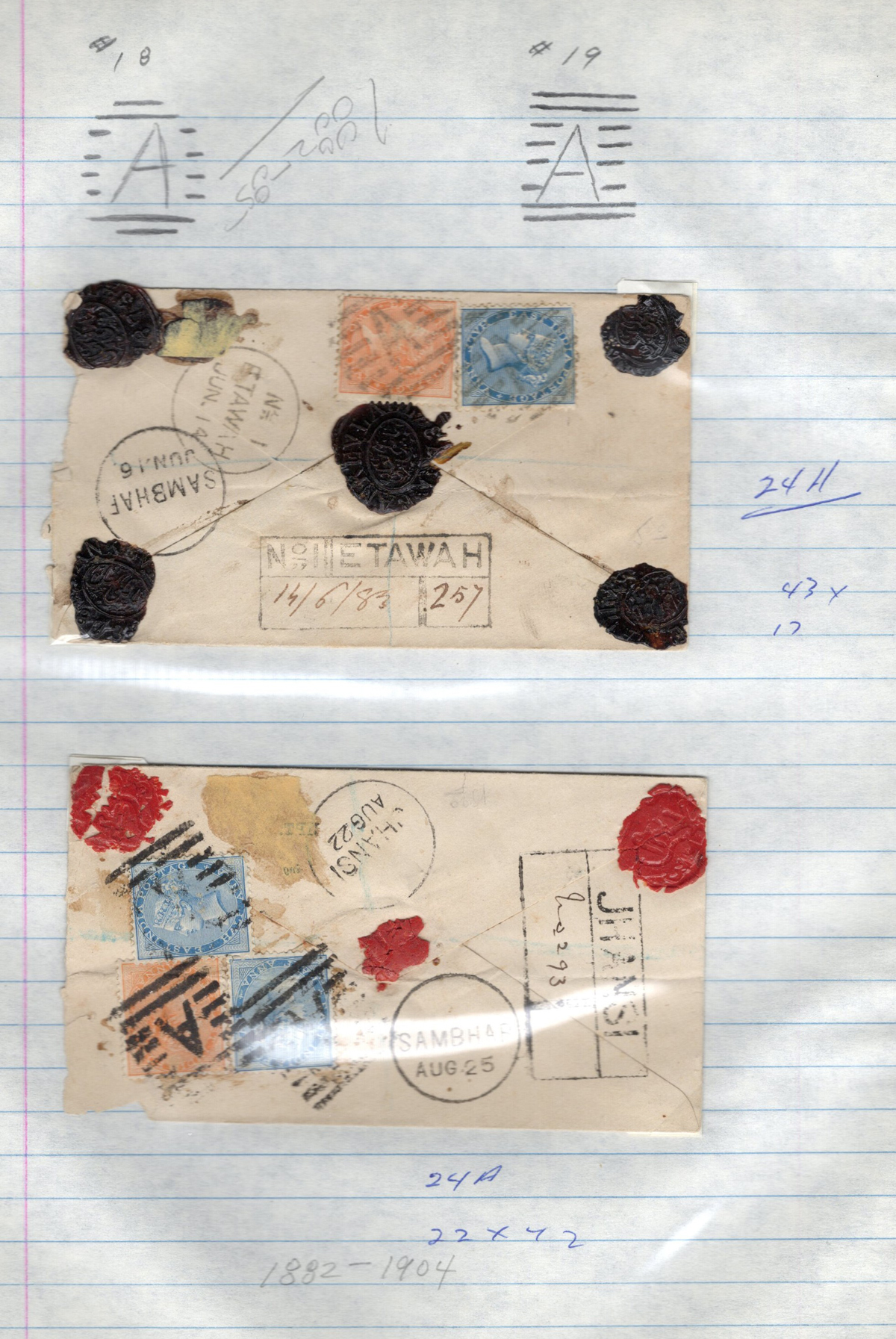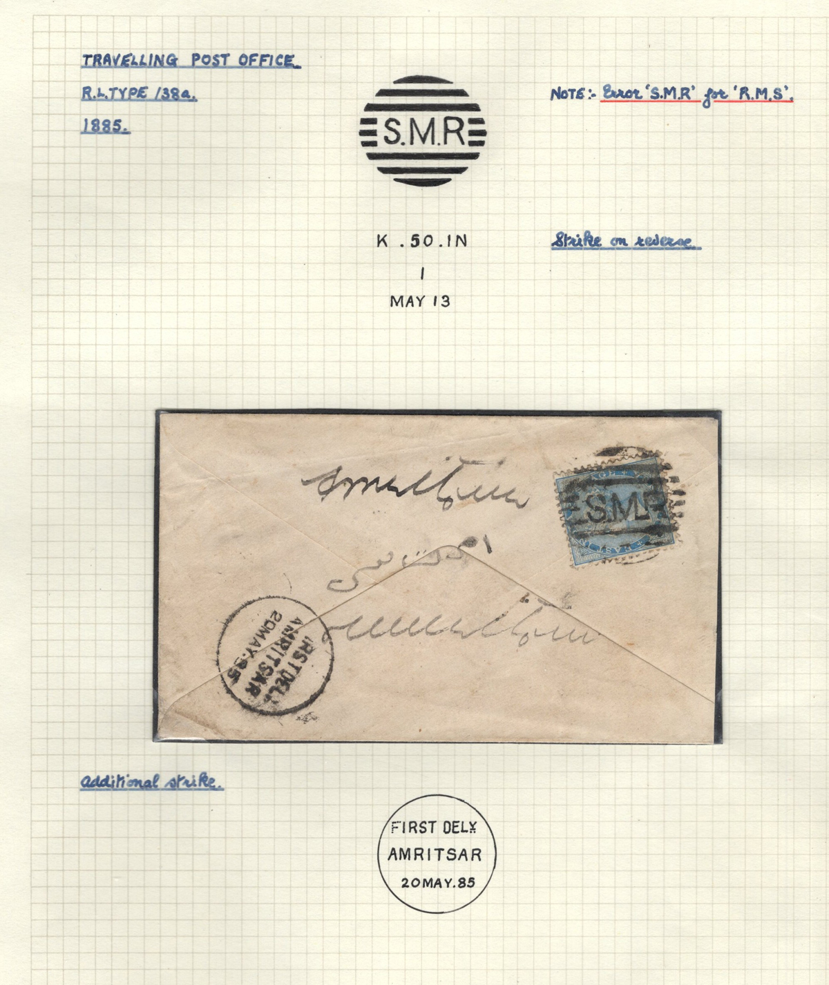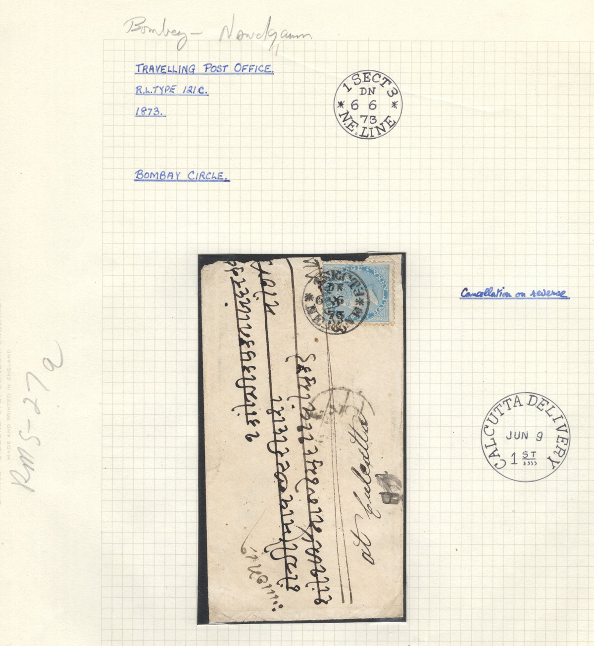 695 CVR TPO imageAdvanced Collection of Travelling Post Office Postmarks on Cover, 1867 to 1898, with 48 covers mounted on pages, with owner's descriptions of the postmarks. The collection starts with a 3-page introduction (history of the service), followed by a wide variety of T.P.O. postmarks, with very little duplication. The variety, being impressive, is added to by the vast amount of other postmarks (instructional, despatch, transit and receiving towns, etc) as well as frankings and rates. Many of the T.P.O. postmarks are better, but there are too many to list here, and we prefer showing them by image. Quality ranges from mostly fine to very fine, to roughly opened. We have shown only a portion of the collection, and only one side of those covers, but feel free to ask should you require additional photos. A great opportunity for the specialist, which comes with the book "Indian Travelling Post Offices 1864-1891" by D.R. Martin. (Scan 1) (Scan 2) (Scan 3) (Scan 4) (Scan 5) (Scan 6) (Scan 7) (Scan 8) (Scan 9) (Scan 10) (Scan 11) (Scan 12) (Scan 13) (Scan 14) (Scan 15) (Scan 16) (Scan 17) (Scan 18) (Scan 19) (Scan 20) (All Scans) (All Images)