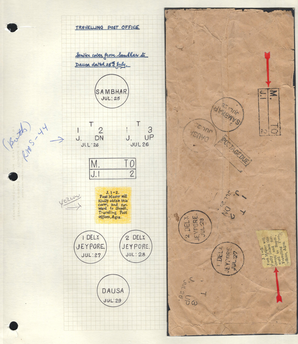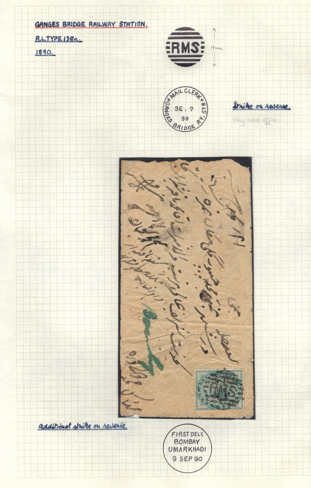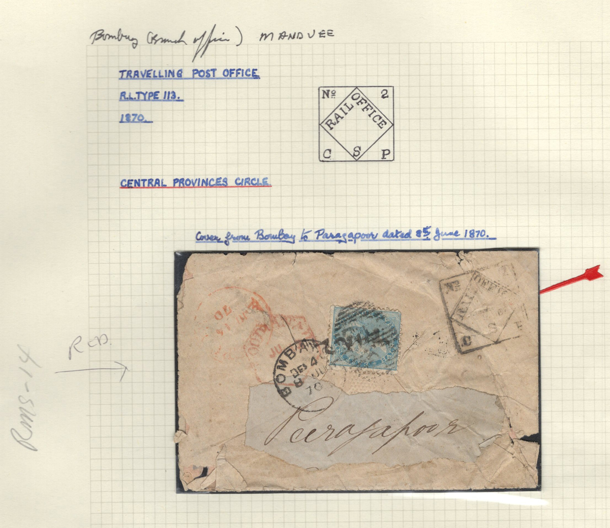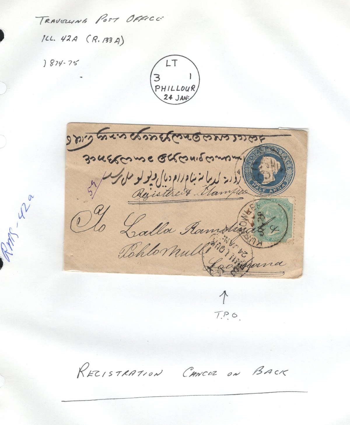 695 CVR TPO imageAdvanced Collection of Travelling Post Office Postmarks on Cover, 1867 to 1898, with 48 covers mounted on pages, with owner's descriptions of the postmarks. The collection starts with a 3-page introduction (history of the service), followed by a wide variety of T.P.O. postmarks, with very little duplication. The variety, being impressive, is added to by the vast amount of other postmarks (instructional, despatch, transit and receiving towns, etc) as well as frankings and rates. Many of the T.P.O. postmarks are better, but there are too many to list here, and we prefer showing them by image. Quality ranges from mostly fine to very fine, to roughly opened. We have shown only a portion of the collection, and only one side of those covers, but feel free to ask should you require additional photos. A great opportunity for the specialist, which comes with the book "Indian Travelling Post Offices 1864-1891" by D.R. Martin. (Scan 1) (Scan 2) (Scan 3) (Scan 4) (Scan 5) (Scan 6) (Scan 7) (Scan 8) (Scan 9) (Scan 10) (Scan 11) (Scan 12) (Scan 13) (Scan 14) (Scan 15) (Scan 16) (Scan 17) (Scan 18) (Scan 19) (Scan 20) (All Scans) (All Images)