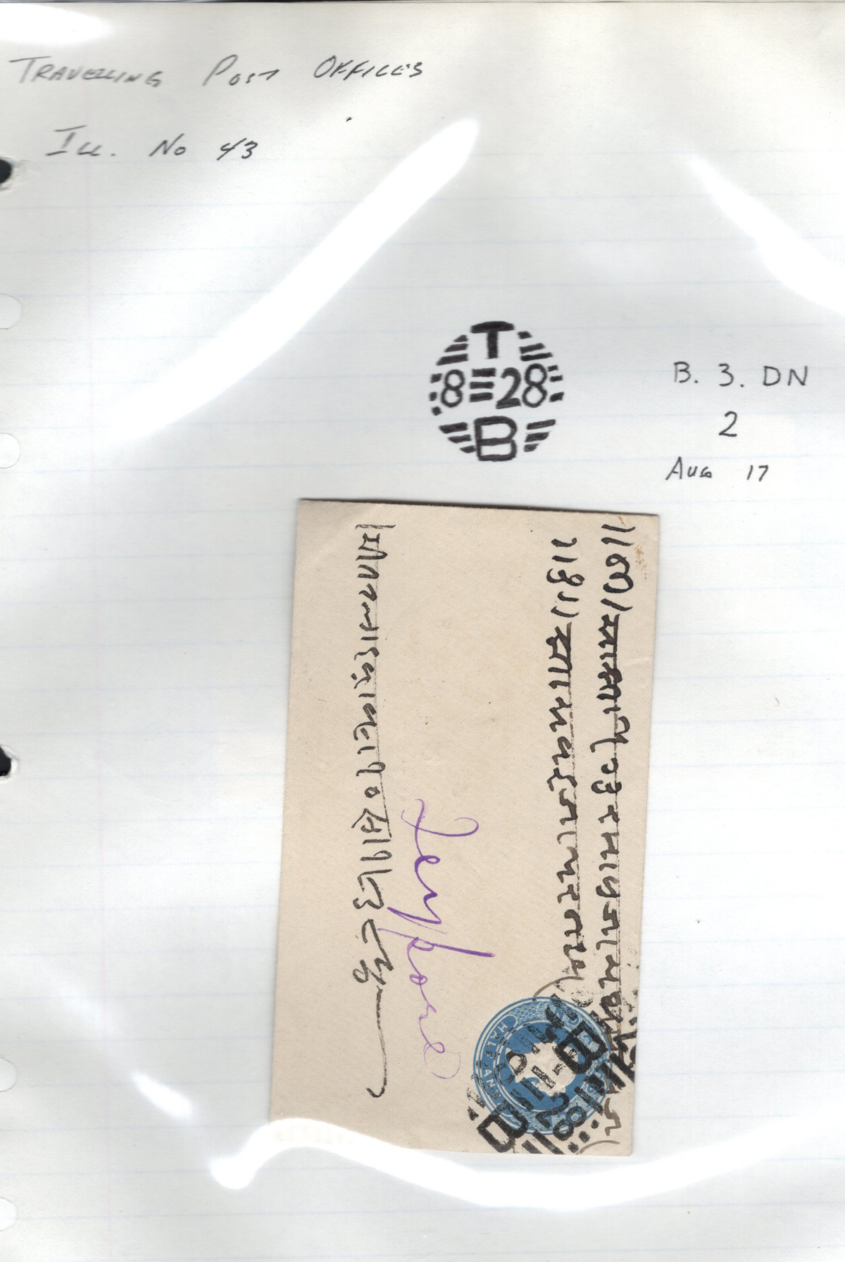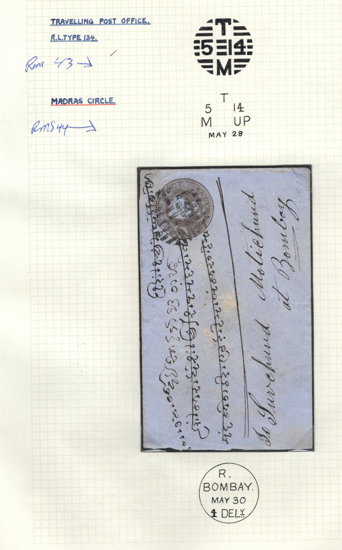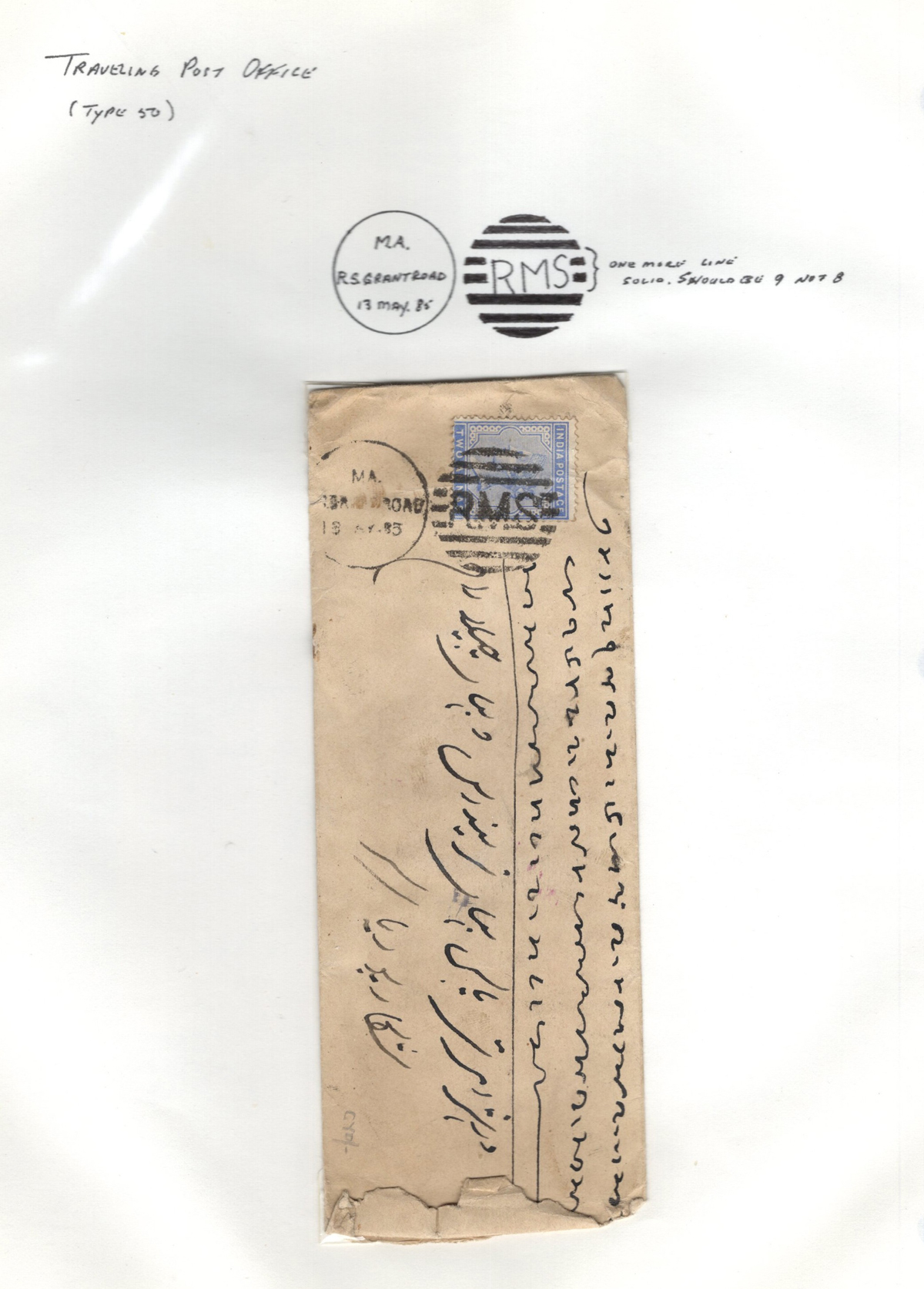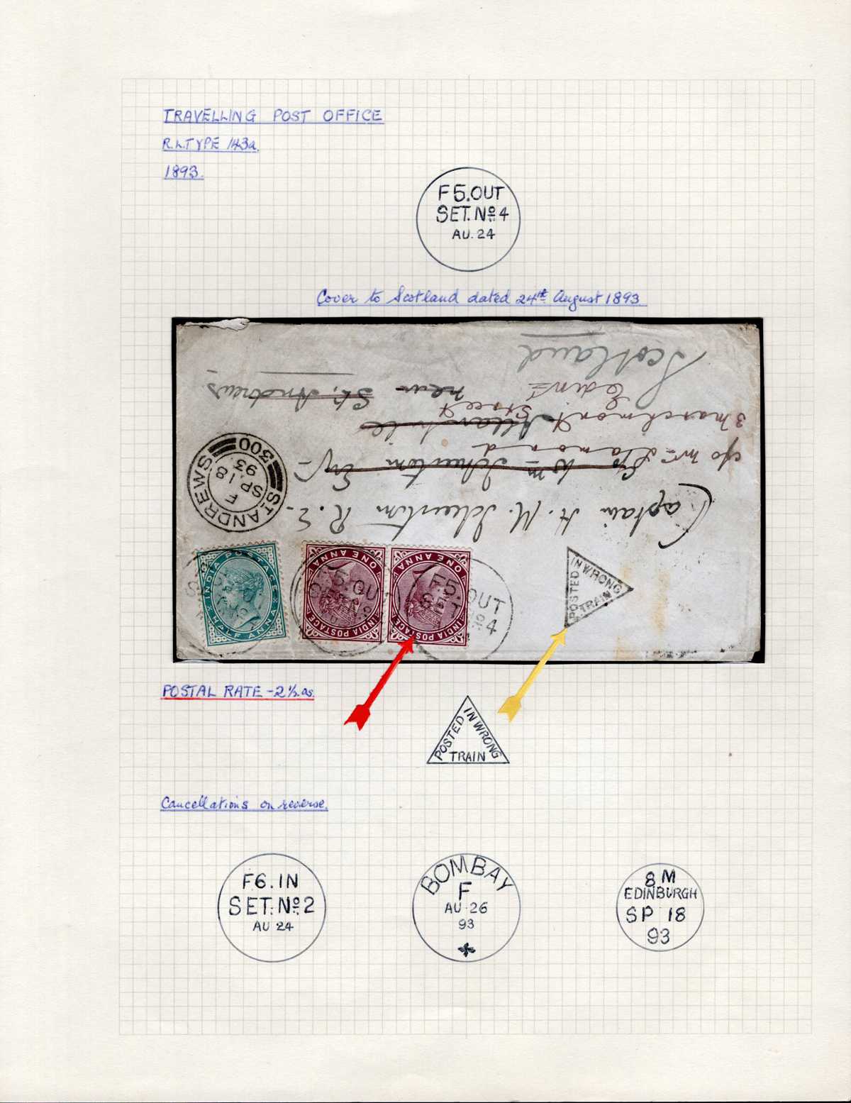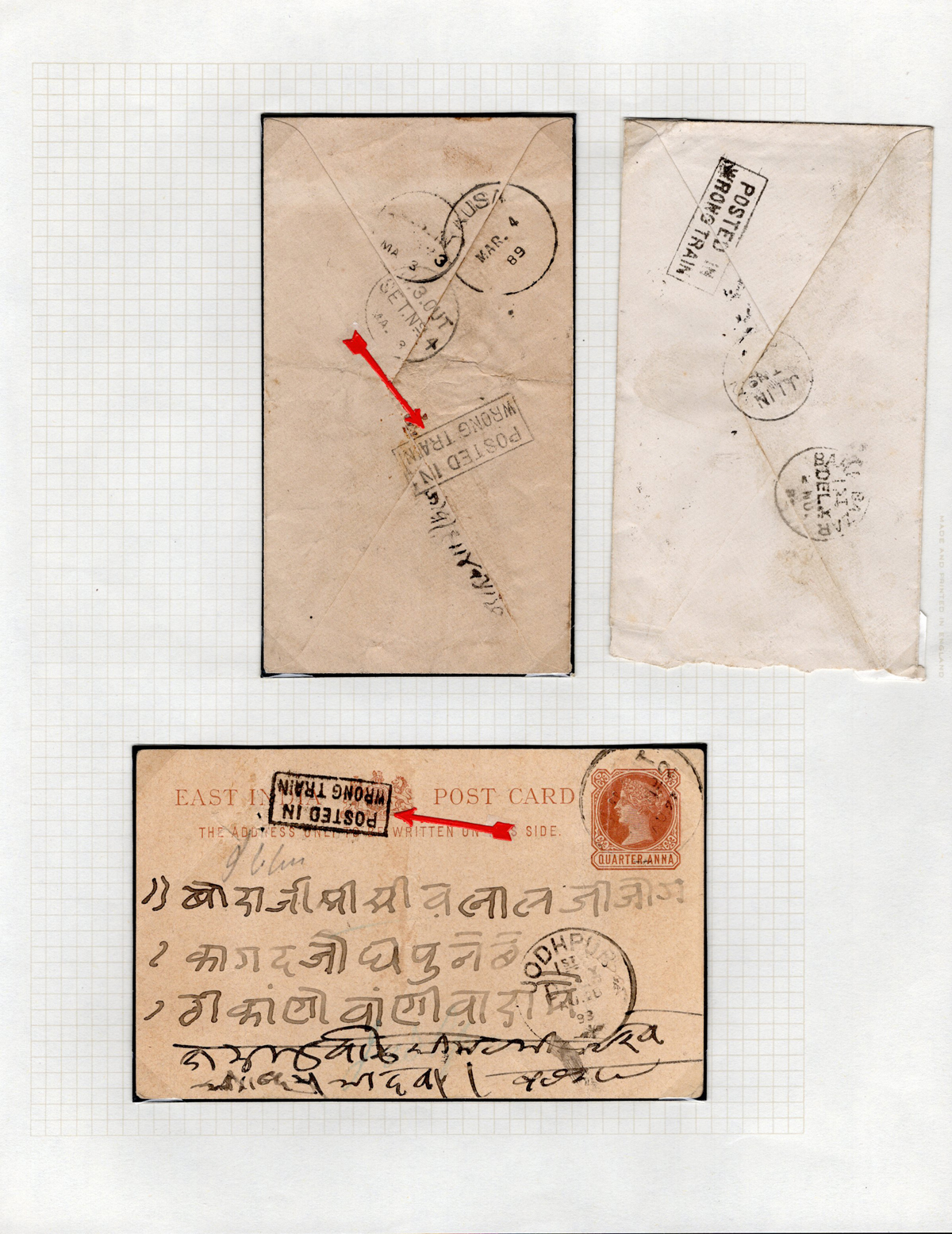 683 CVR TPO imageGroup of Four "Posted in Wrong Train" Covers, first was mailed AUG.24.1893 Bombay to Scotland via T.P.O., with "Posted in Wrong Train" in a triangle on front. Also "Posted in Wrong Train" in a rectangle on front of an 1898 postal card (crease) as well as on the back of two 1885 covers (one opened roughly). An overall fine group of these scarce postmarks. (Scan 1) (Scan 2) (All Scans) (All Images)