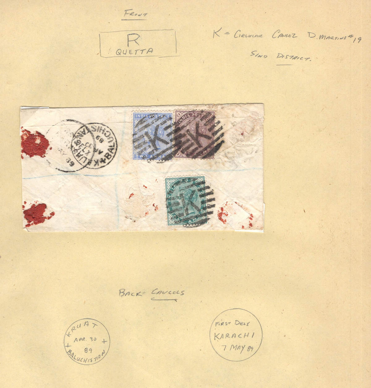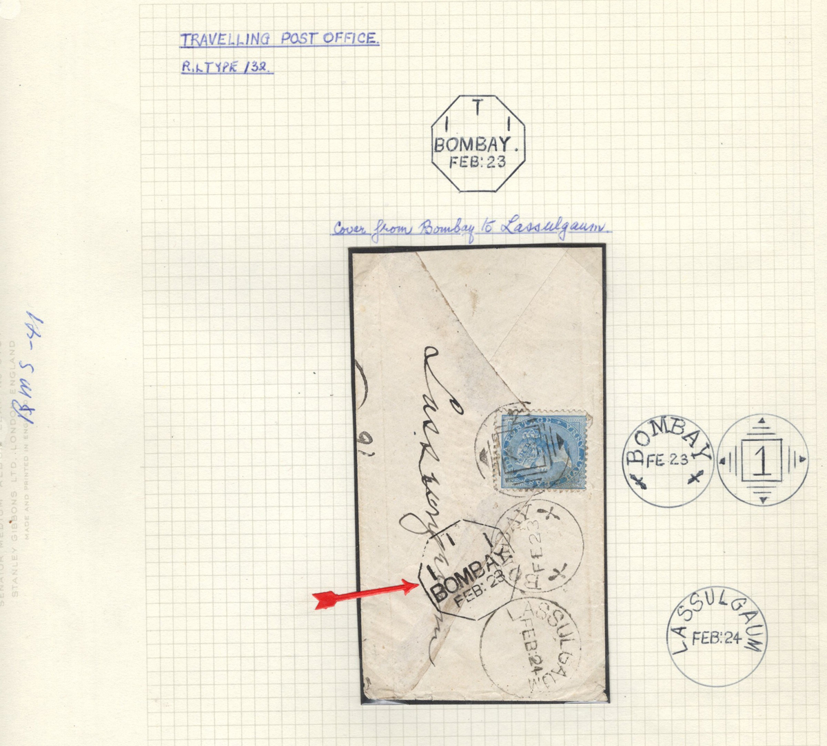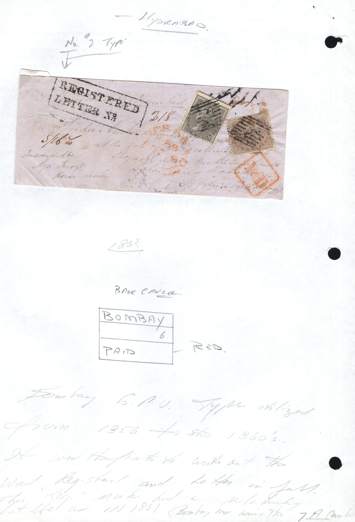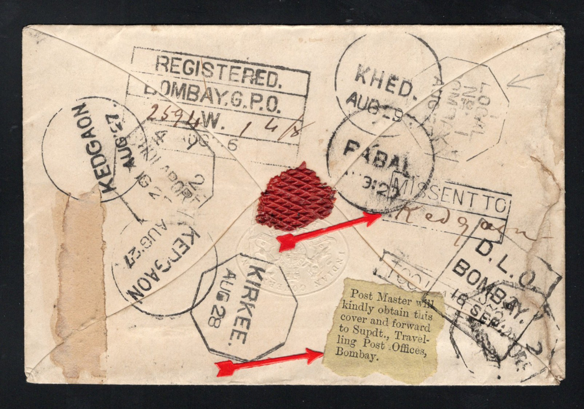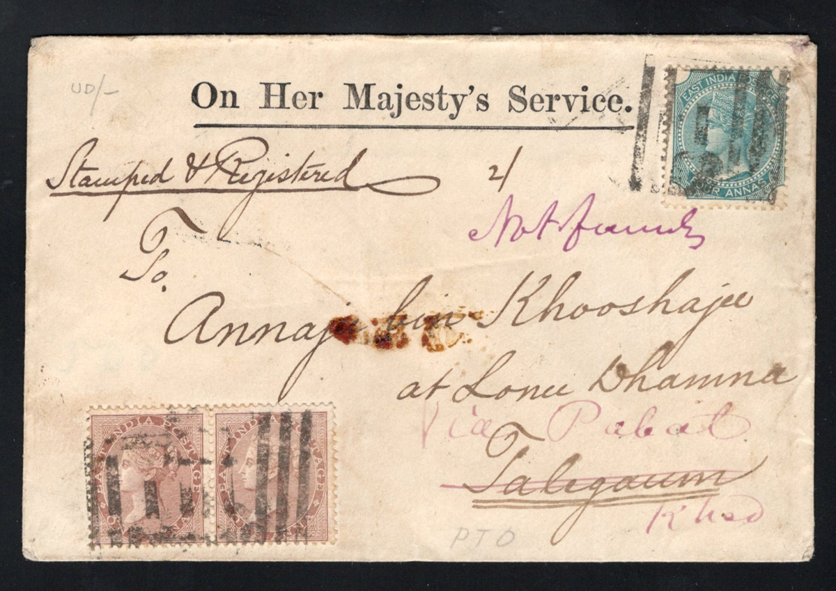 689 CVR TPO imageCa. 1860s Registered OHMS T.P.O. Cover Sent to Dead Letter Office, with Sholapore and Bombay T.P.O. cancels on a cover originally addressed to Talegaum and missent to Kedgaon and eventually "not found" manuscript and sent to the D.L.O. in Bombay. The back has a printed label reading "Post Master will kindly obtain this cover and forward to Supdt., Travelling Post Offices, Bombay". Very fine and interesting. (Scan 1) (Scan 2) (All Scans) (All Images)