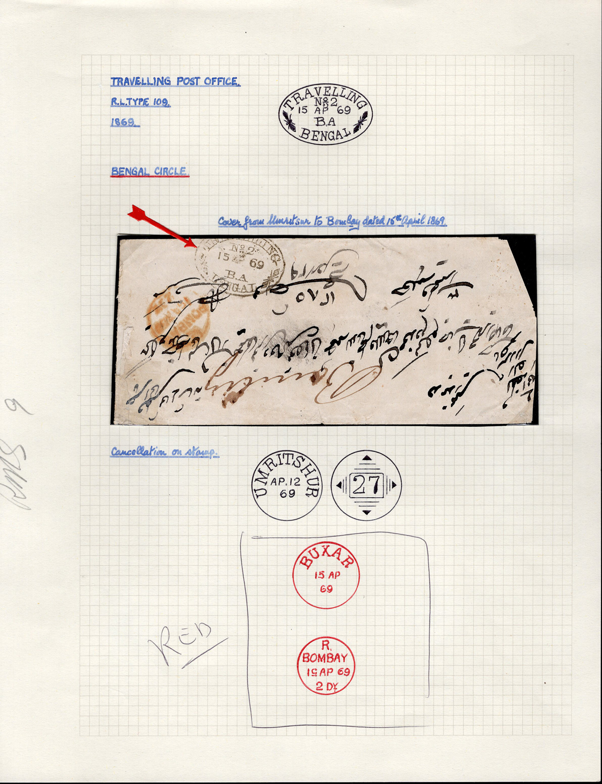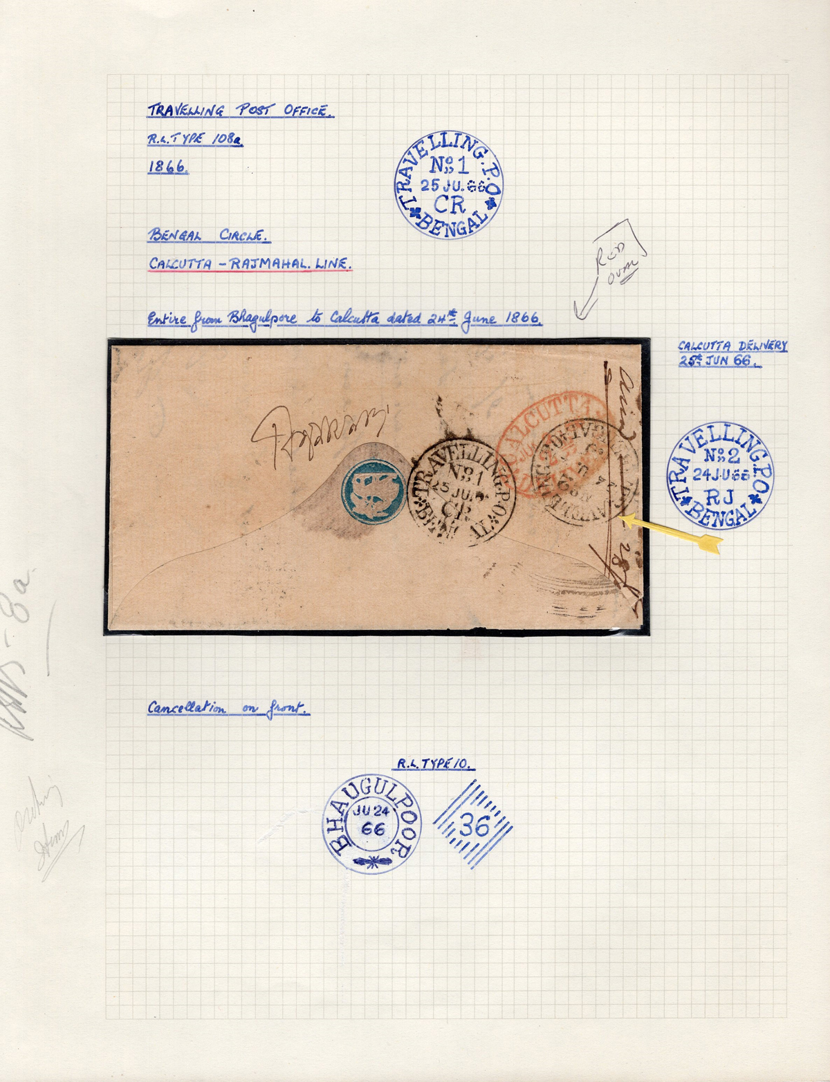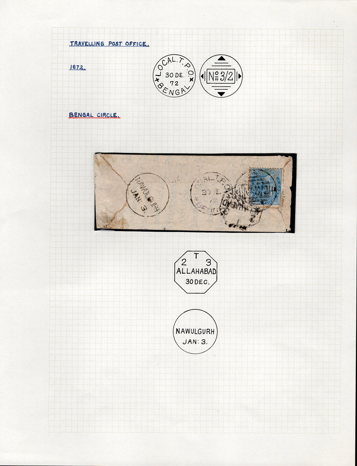 685 CVR TPO imageThree Early Bengal T.P.O. Covers, 1866-1872, 1866 "Travelling P.O. / Bengal" on cover from Bhaugulpore (duplex cancels embossed stationery stamp) to Calcutta (oval "Calcutta / Delivery" receiver in red), 1869 "Travelling / Bengal" oval on cover from Umritsur (duplex 27) to Bombay (receiver in red) through Buxar (transit in red) and 1872 "Local T.P.O. / Bengal" duplex on cover with Allahabad and Nawulgurh datestamps. A fine trio on album pages. (Scan 1) (Scan 2) (Scan 3) (Scan 4) (Scan 5) (Scan 6) (All Scans) (All Images)