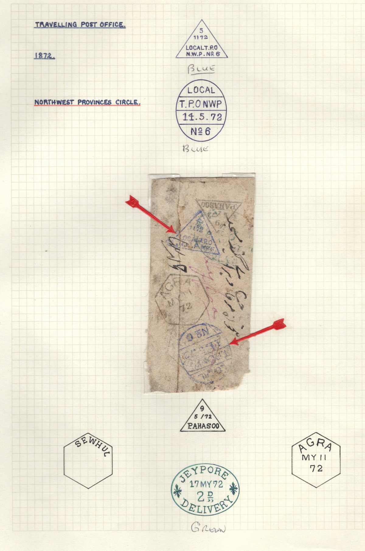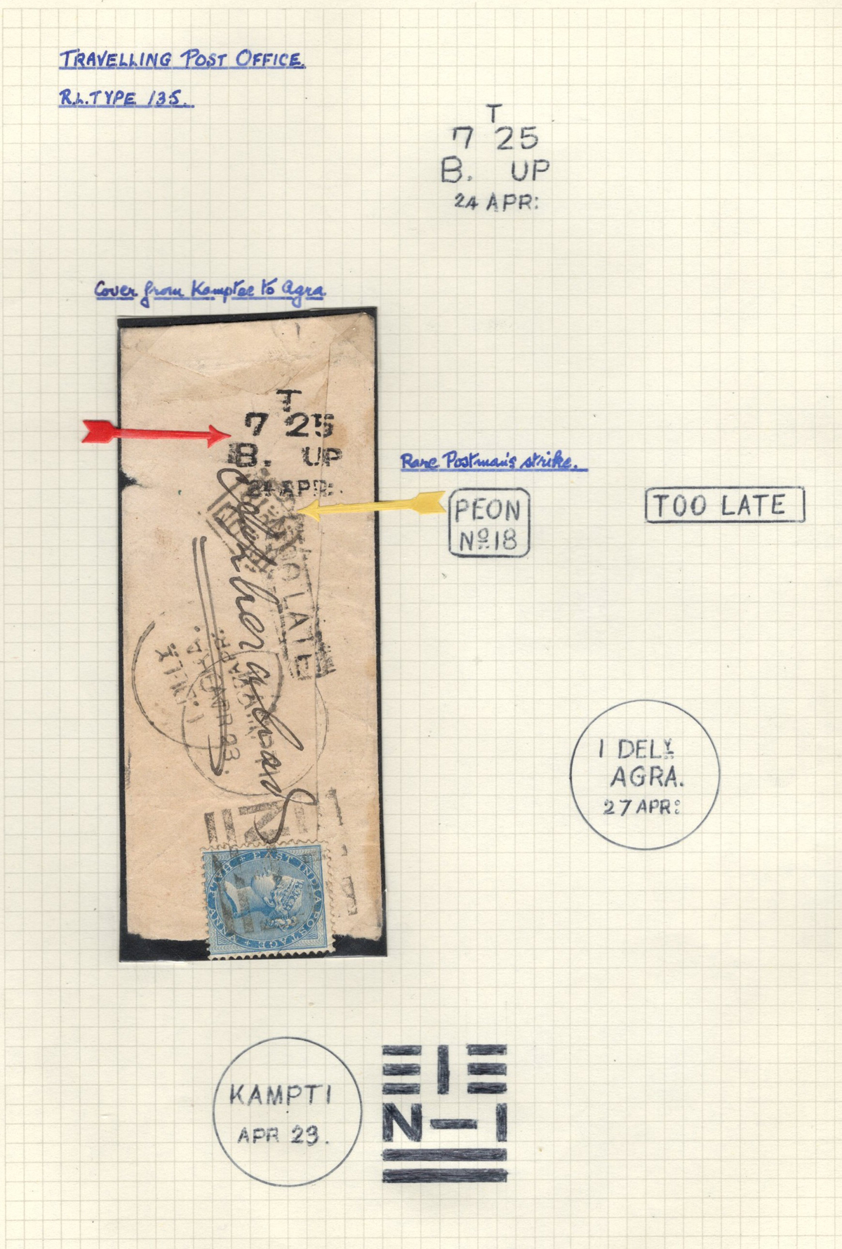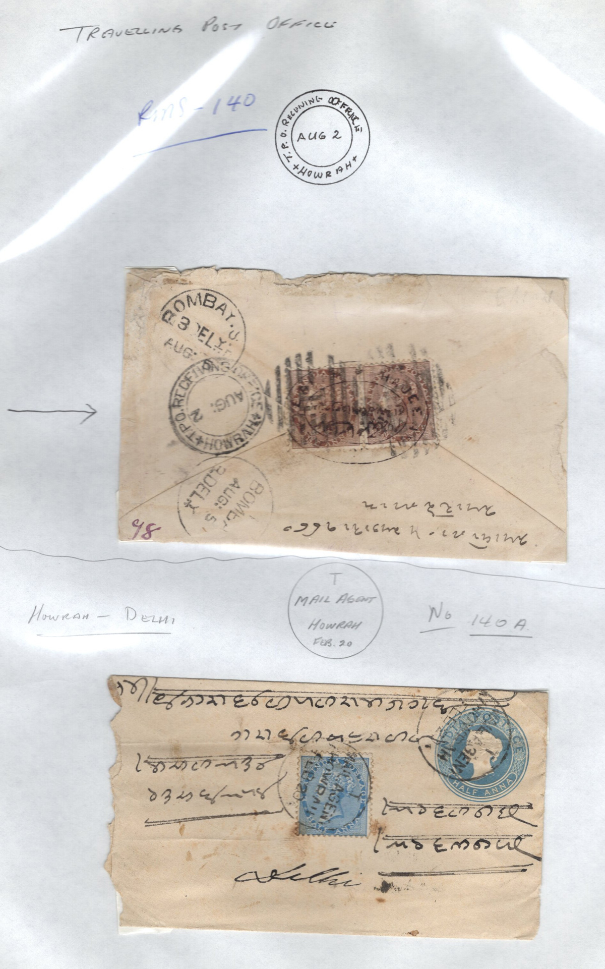 685 CVR TPO imageThree Early Bengal T.P.O. Covers, 1866-1872, 1866 "Travelling P.O. / Bengal" on cover from Bhaugulpore (duplex cancels embossed stationery stamp) to Calcutta (oval "Calcutta / Delivery" receiver in red), 1869 "Travelling / Bengal" oval on cover from Umritsur (duplex 27) to Bombay (receiver in red) through Buxar (transit in red) and 1872 "Local T.P.O. / Bengal" duplex on cover with Allahabad and Nawulgurh datestamps. A fine trio on album pages. (Scan 1) (Scan 2) (Scan 3) (Scan 4) (Scan 5) (Scan 6) (All Scans) (All Images)