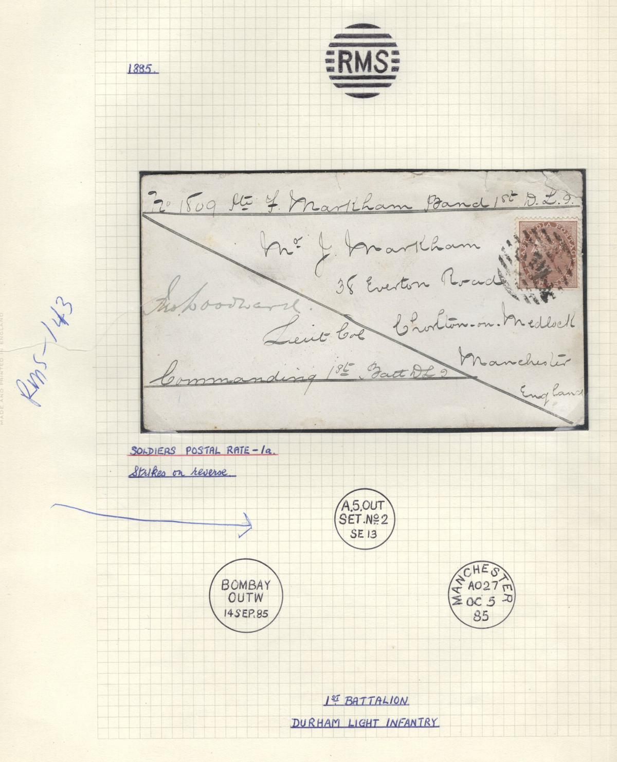 682 CVR/PC TPO imageCollection of Queen Victoria-Era Travelling Post Office (TPO) Covers, with 37 covers (incl. a few cards), majority are described on pages. We note a good variety of postmarks such as "T.P.O. Mail Agent", various "R.M.S.", "L" in bars, "K" in bars, "A" in bars, "T" in bars, "A-20" in bars, "Mail Agent", "Mail Office", boxed "Train Late", an "S.M.R." in bars (apparently an error for R.M.S.) and many others. We counted 8 registered covers, one cover was mailed at the soldiers' rate to England (1885), a few are addressed overseas, including the United States (x2), England (x3). The usual opening faults can be found, still overall a fine or better collection. Our photos show only a small portion. (Scan 1) (Scan 2) (Scan 3) (Scan 4) (Scan 5) (Scan 6) (Scan 7) (Scan 8) (Scan 9) (Scan 10) (Scan 11) (Scan 12) (Scan 13) (Scan 14) (Scan 15) (All Scans) (All Images)