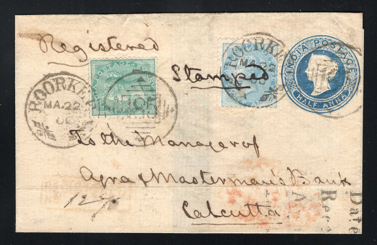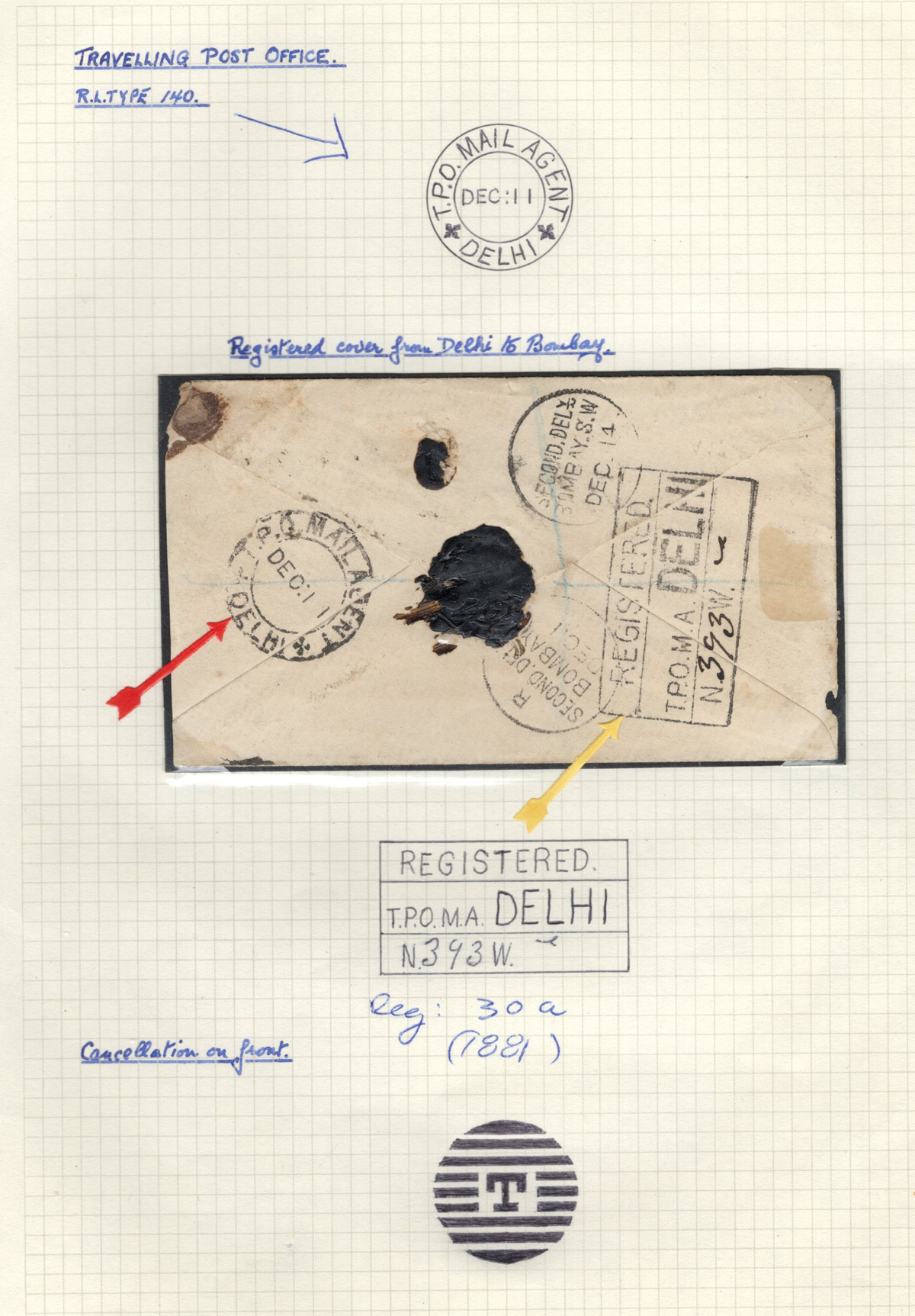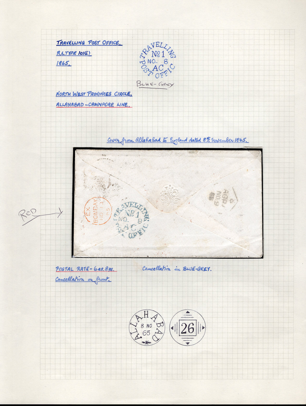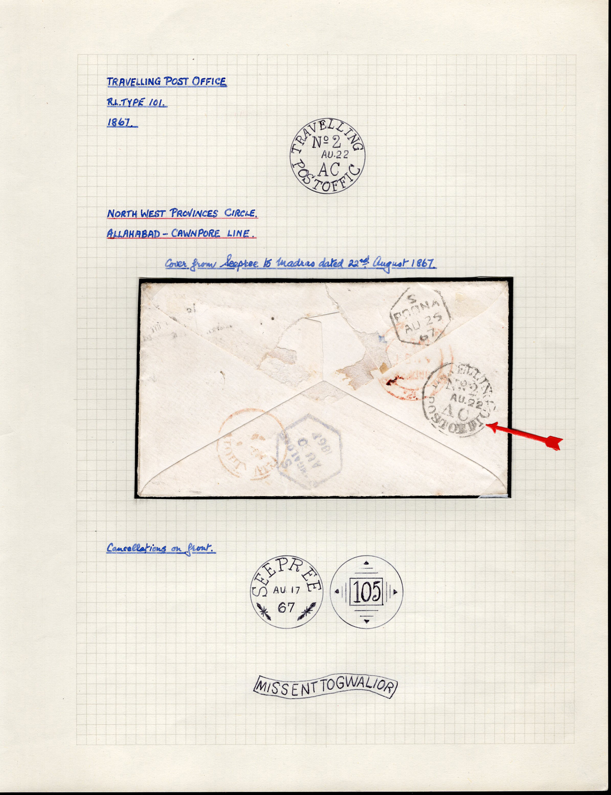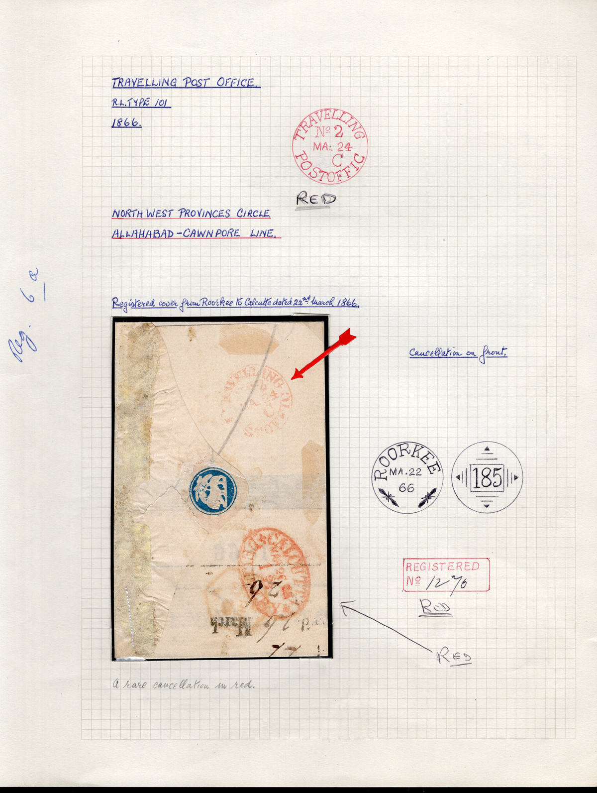 693 CVR TPO imageThree Covers with "Travelling / Post Offic" North West Provinces Circle Postmarks, 1865 to 1867, 1865 "Travelling / Post Offic" in blue on cover from Allahabad (#26 duplex) to England (3 colour franking, with INDIA PAID handstamp in red), 1866 "Travelling / Post Offic" in red on uprated registered stationery cover from Roorkee (#185 duplex) to Calcutta ("Calcutta / Delivery" oval in red) and 1867 "Travelling / Post Offic" in black on cover from Seepree (#105 duplex) to Madras, with vavy boxed "Missent to Togwalior" handstamp. A few faults do not detract from this otherwise fine trio. (Scan 1) (Scan 2) (Scan 3) (Scan 4) (Scan 5) (Scan 6) (All Scans) (All Images)